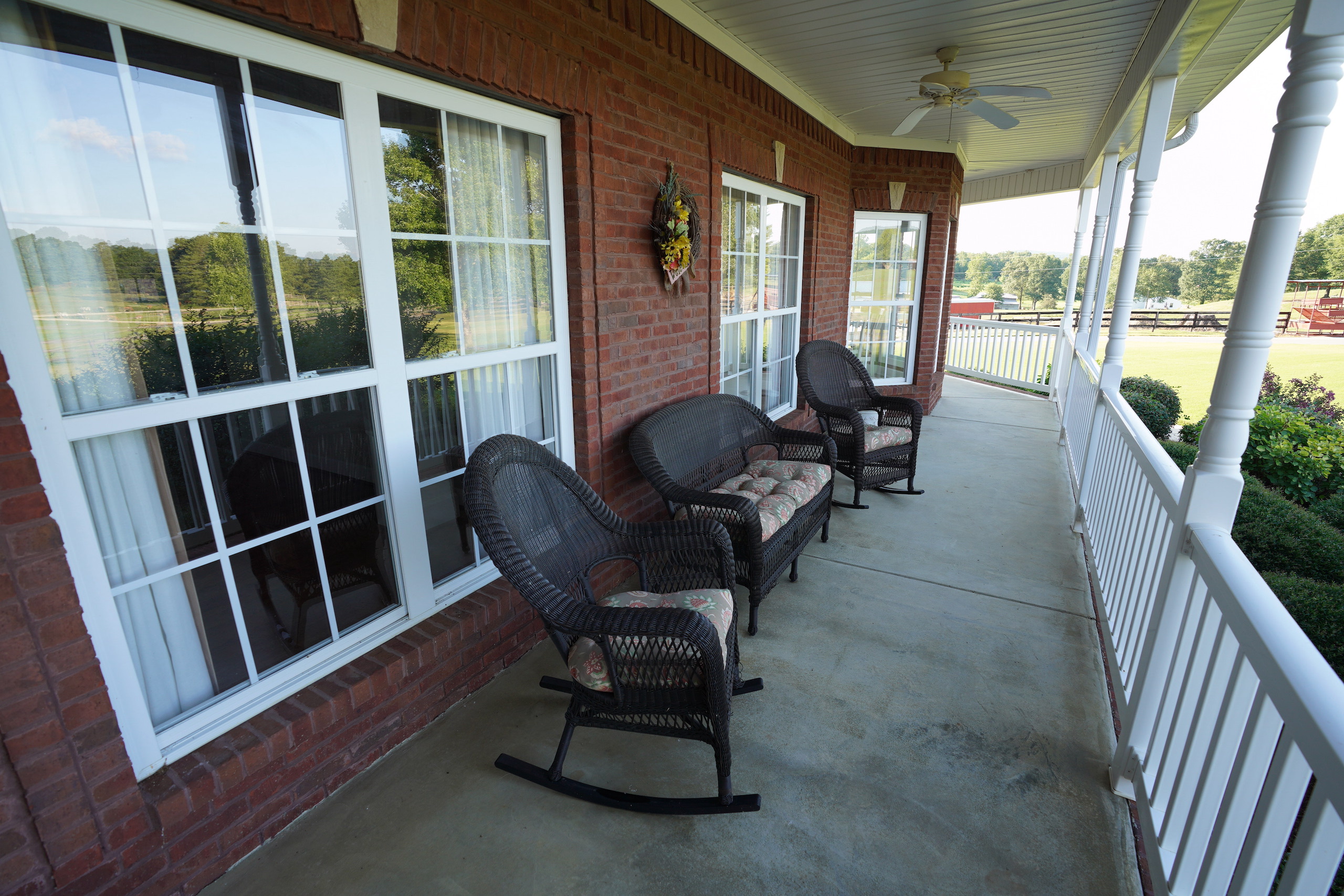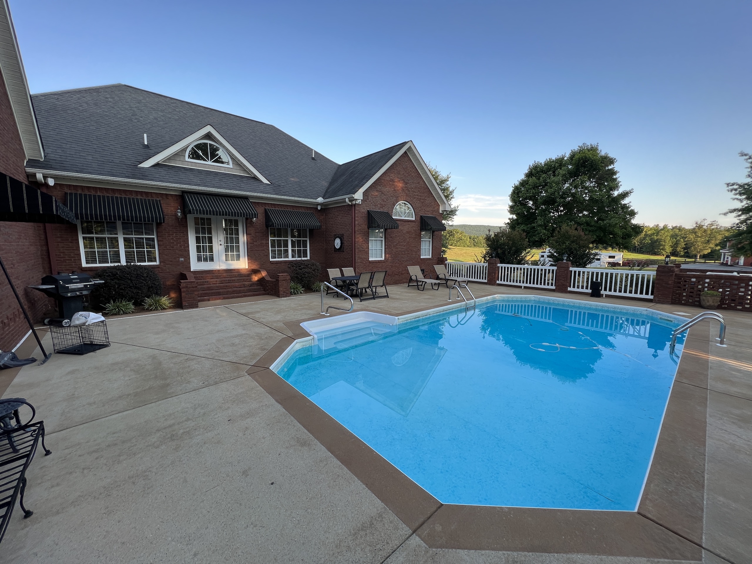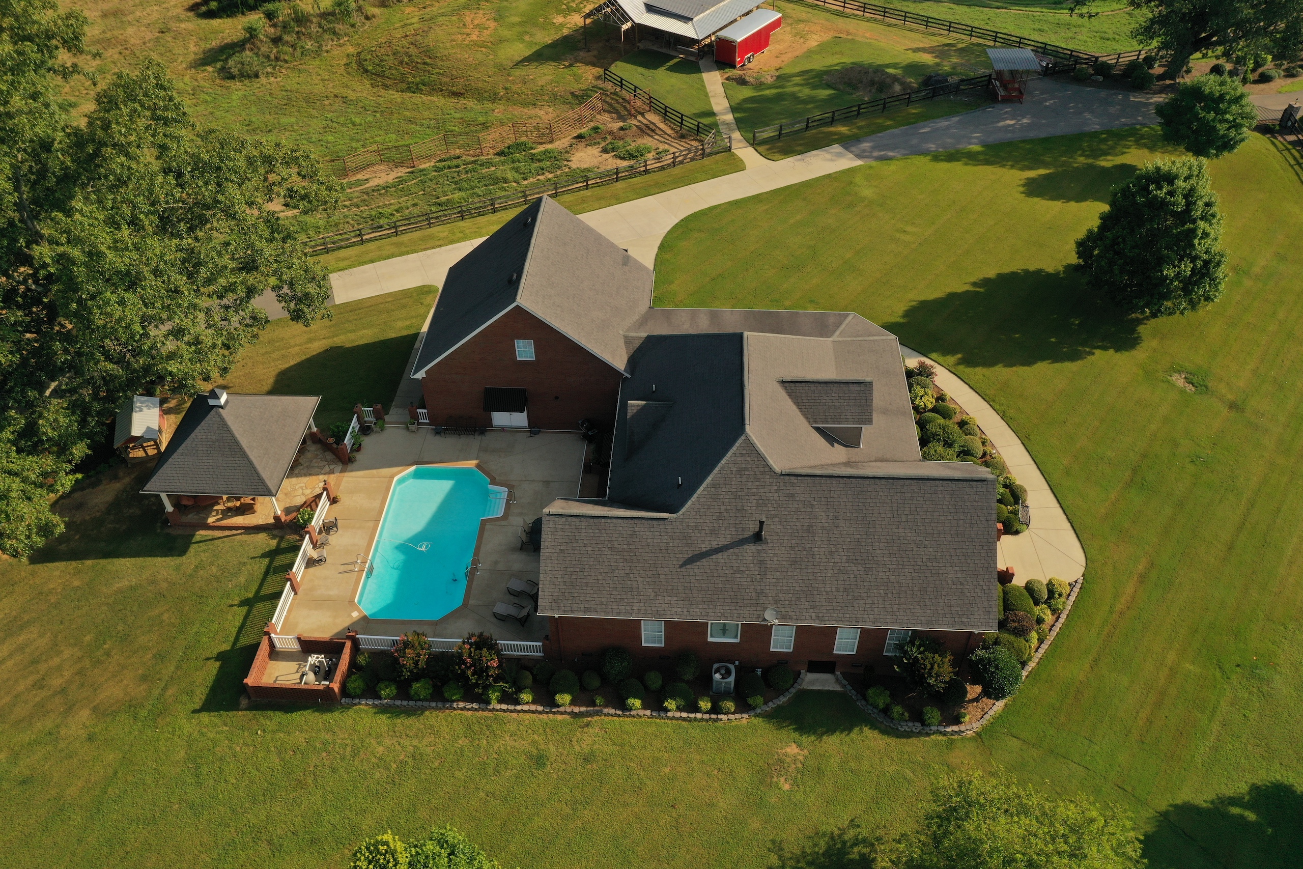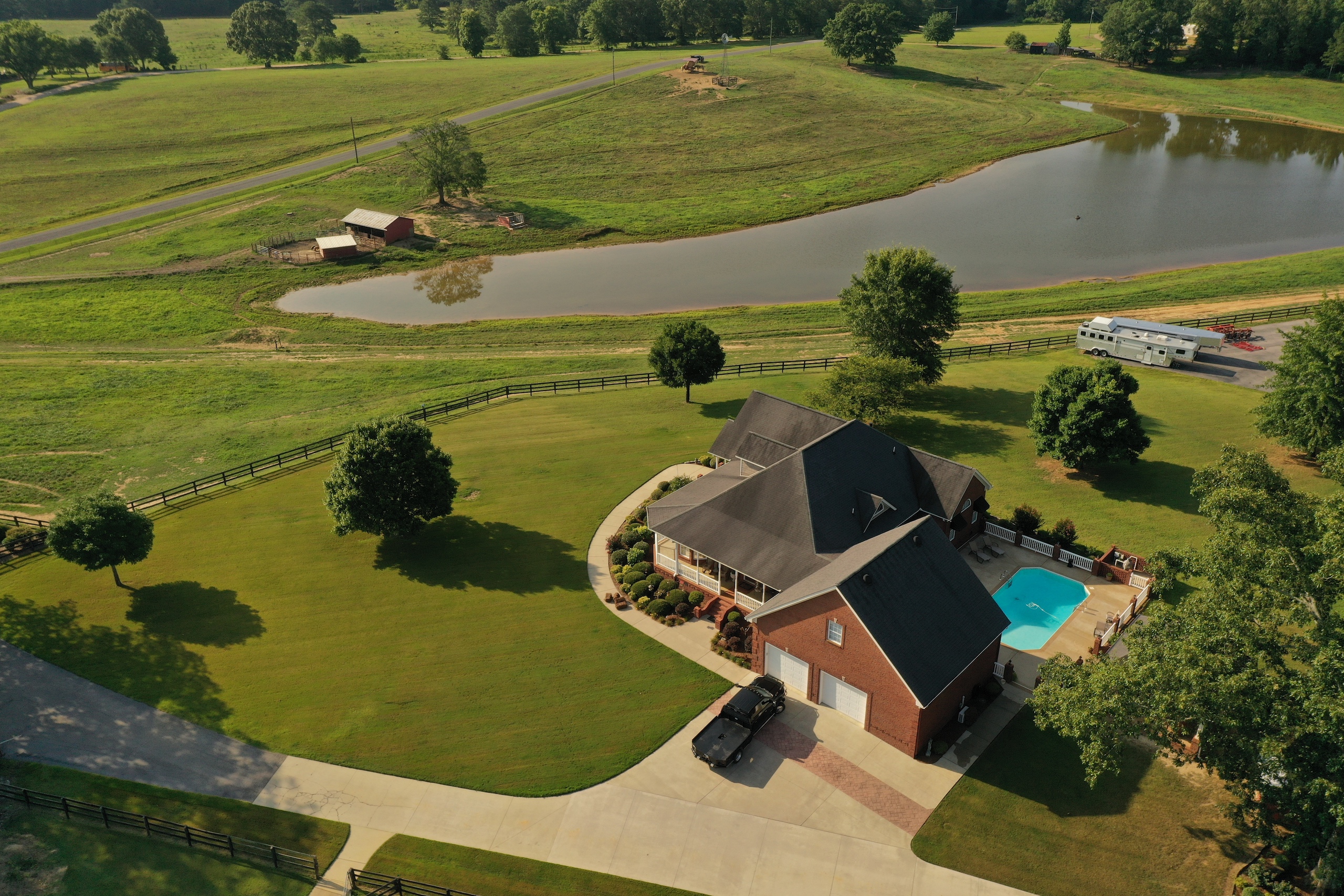 The main brick home is approximately 3100 s.f., has 3 bedrooms and 3 bathrooms. A large open living room/dining room flows into the kitchen, with a center island and a breakfast nook overlooking the pasture and pond. Excellent craftsmanship is evident in all aspects of the house; a few examples are the custom trim, high ceilings, hardwood floors, porcelain tile and marble bathrooms. The rock fireplace is the centerpiece of the living room, giving it a warm, comfortable feel. The two-car garage is spacious and above the garage is a large entertainment room that could also be used as an additional bedroom. A sunroom overlooks the pool area, which makes it an excellent place to entertain! A large covered patio adjacent to the pool is set up for relaxing cookouts any time of the year.