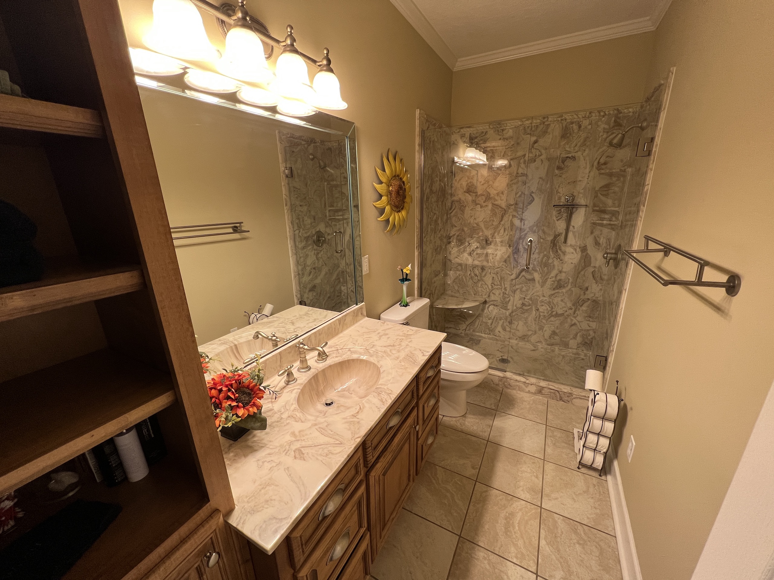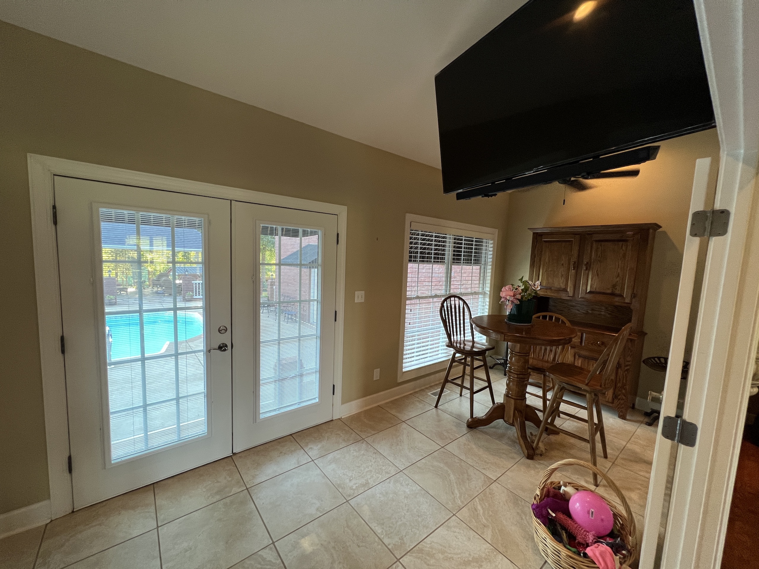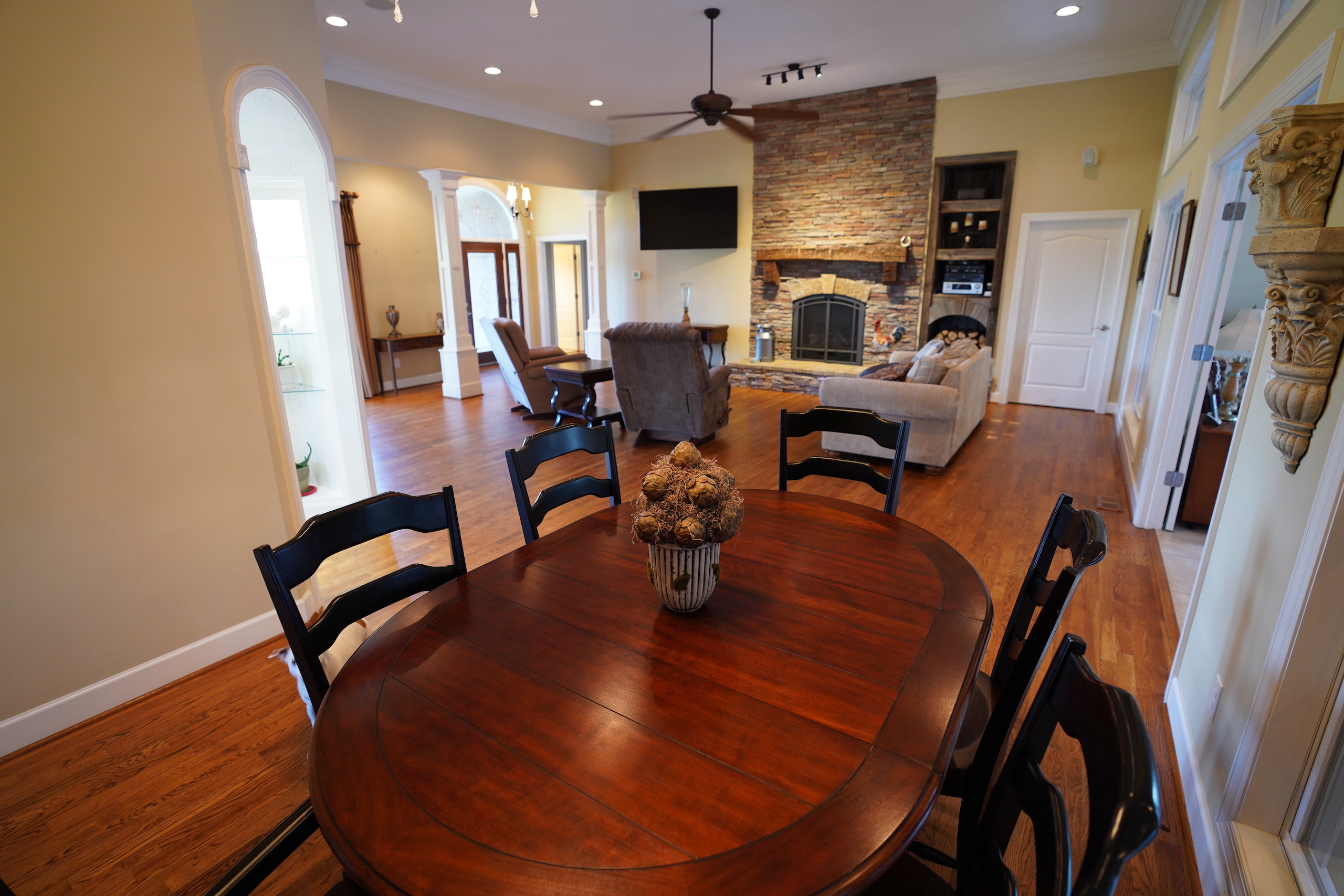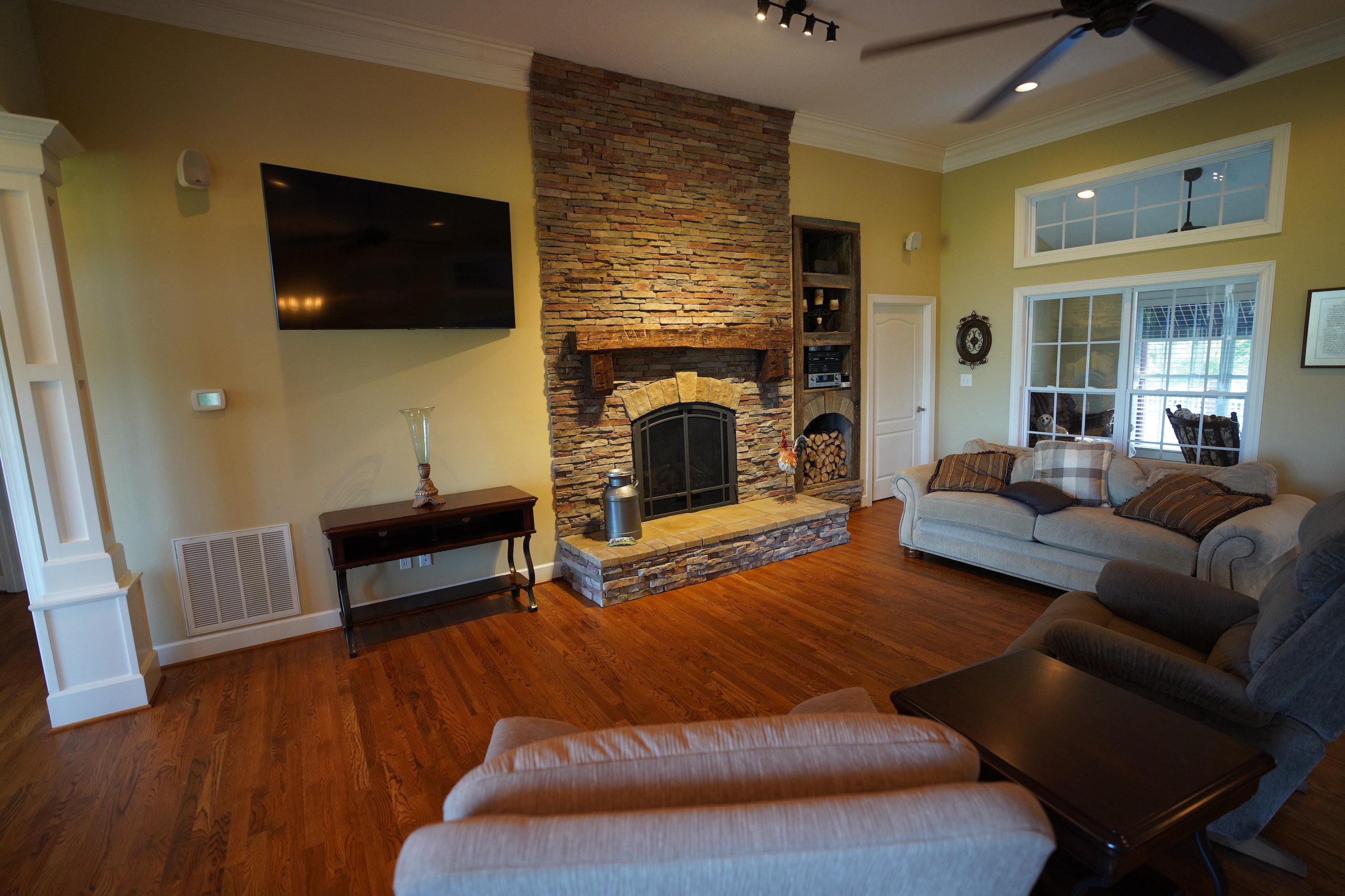 The main brick home is approximately 3100 s.f., has 3 bedrooms and 3 bathrooms. A large open living room/dining room flows into the kitchen, with a center island and a breakfast nook overlooking the pasture and pond. Excellent craftsmanship is evident in all aspects of the house; a few examples are the custom trim, high ceilings, hardwood floors, porcelain tile and marble bathrooms. The rock fireplace is the centerpiece of the living room, giving it a warm, comfortable feel. The two-car garage is spacious and above the garage is a large entertainment room that could also be used as an additional bedroom. A sunroom overlooks the pool area, which makes it an excellent place to entertain! A large covered patio adjacent to the pool is set up for relaxing cookouts any time of the year.