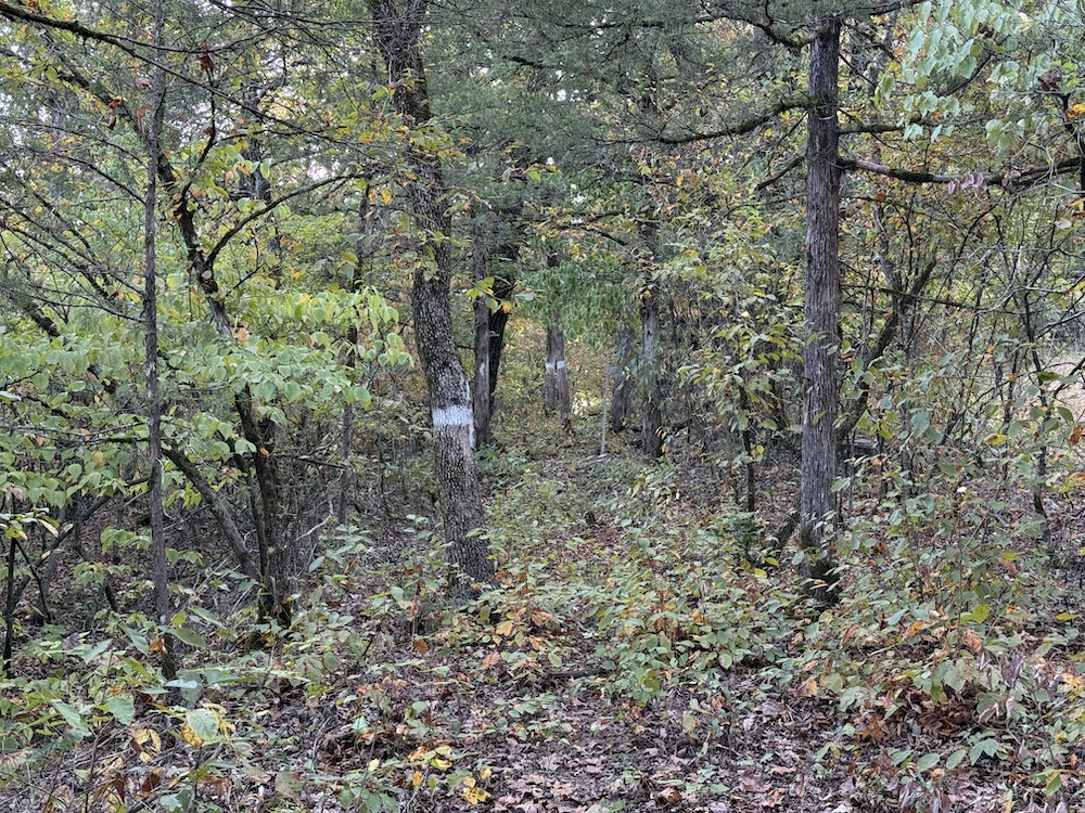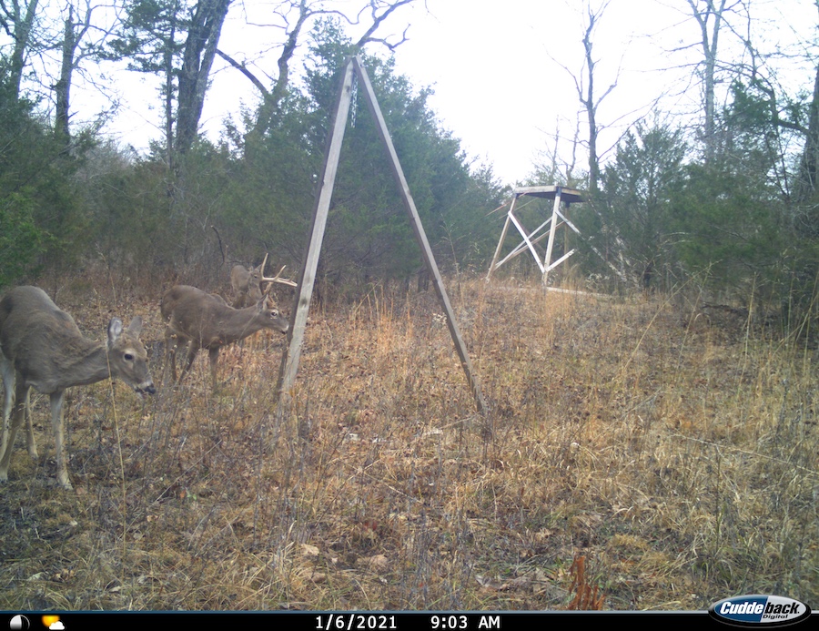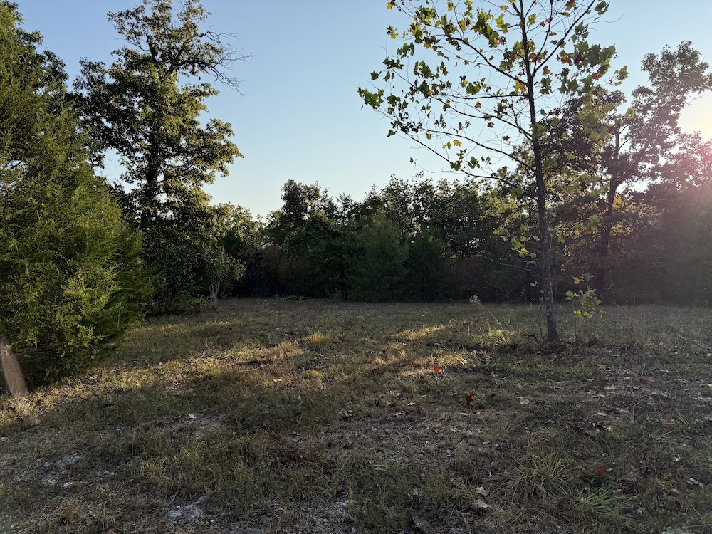 Right in the middle of the land lies a large, well-positioned clearing that sets up perfectly as a food plot or hunting hotspot. An elevated custom-built wooden platform already stands at the heart of the clearing, providing a commanding vantage point over the opening, catching the deer crossing from one draw to the other. The clearing itself is ringed by a cedar thicket, offering dense bedding and cover for whitetail deer and turkey alike. It’s the kind of setup that allows you to step into the property and immediately hunt effectively.