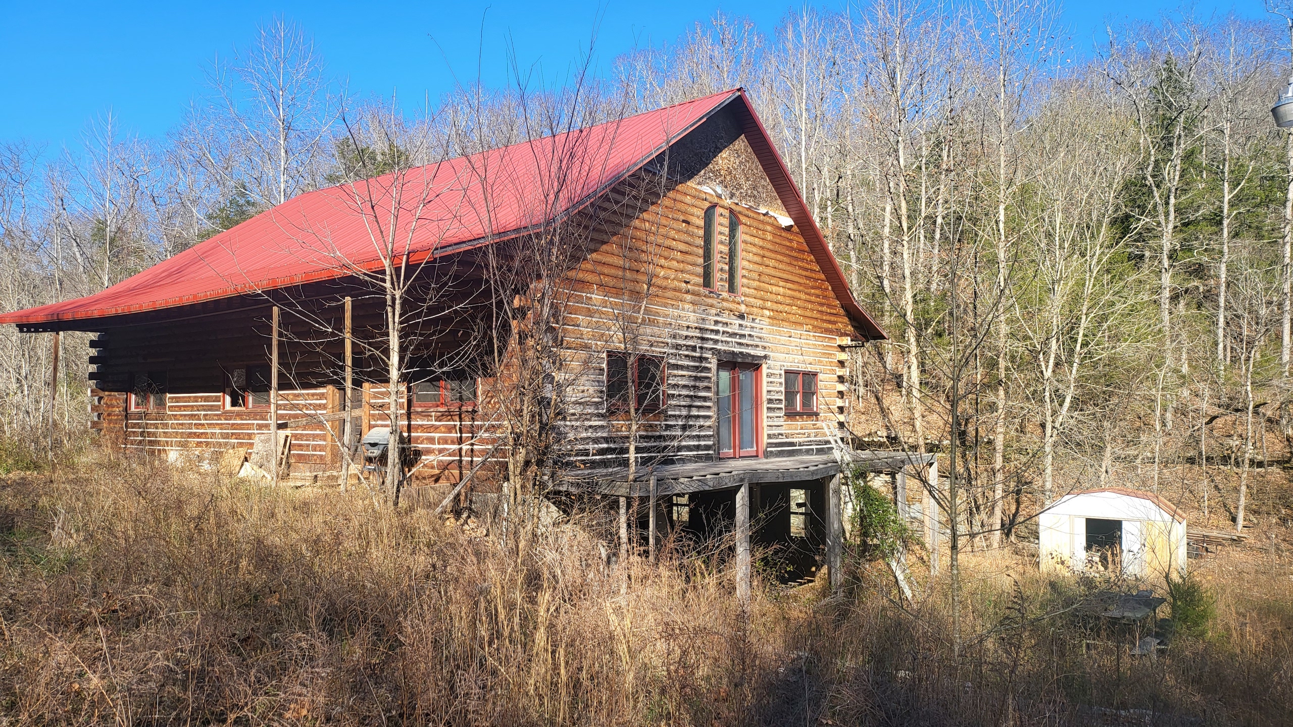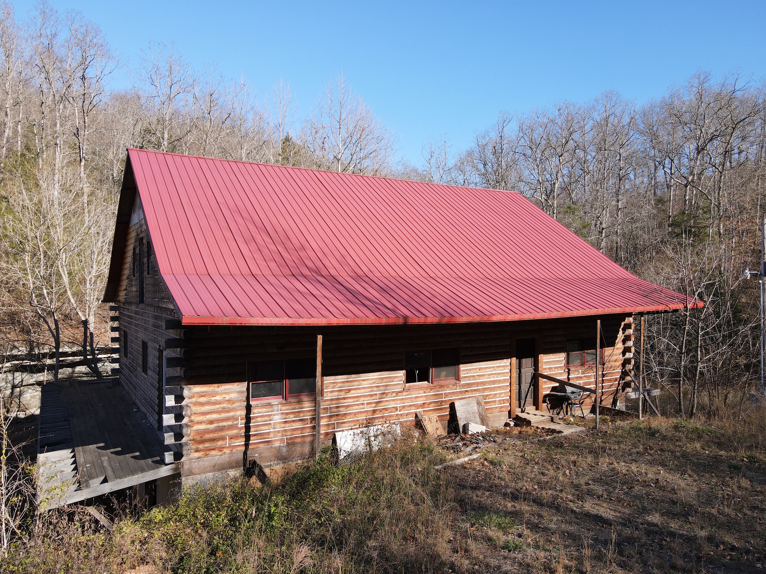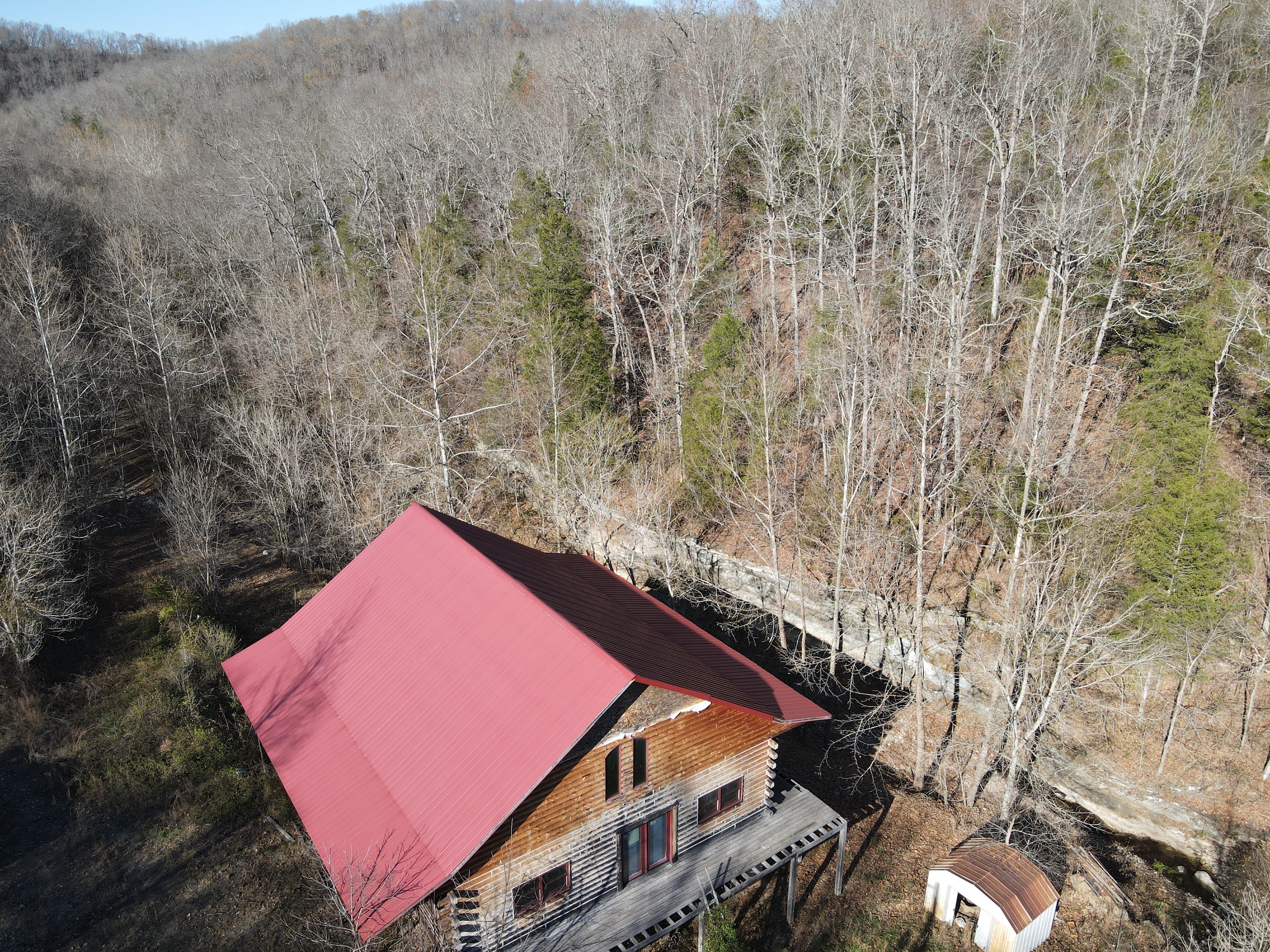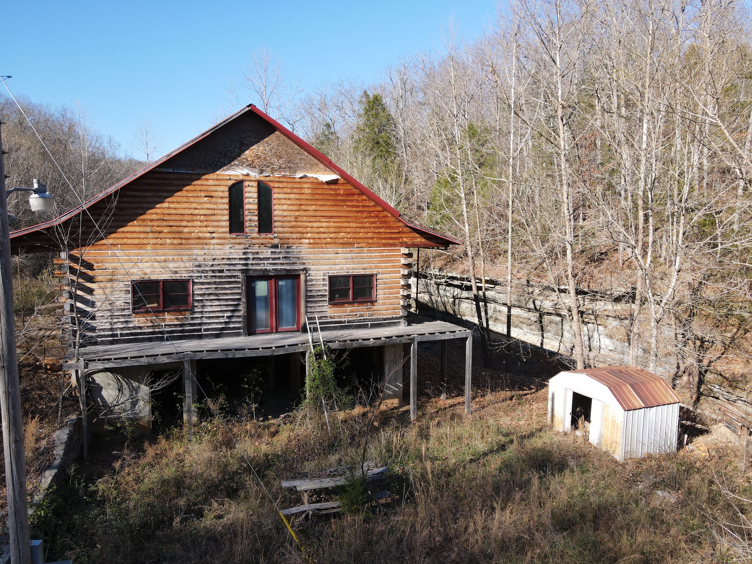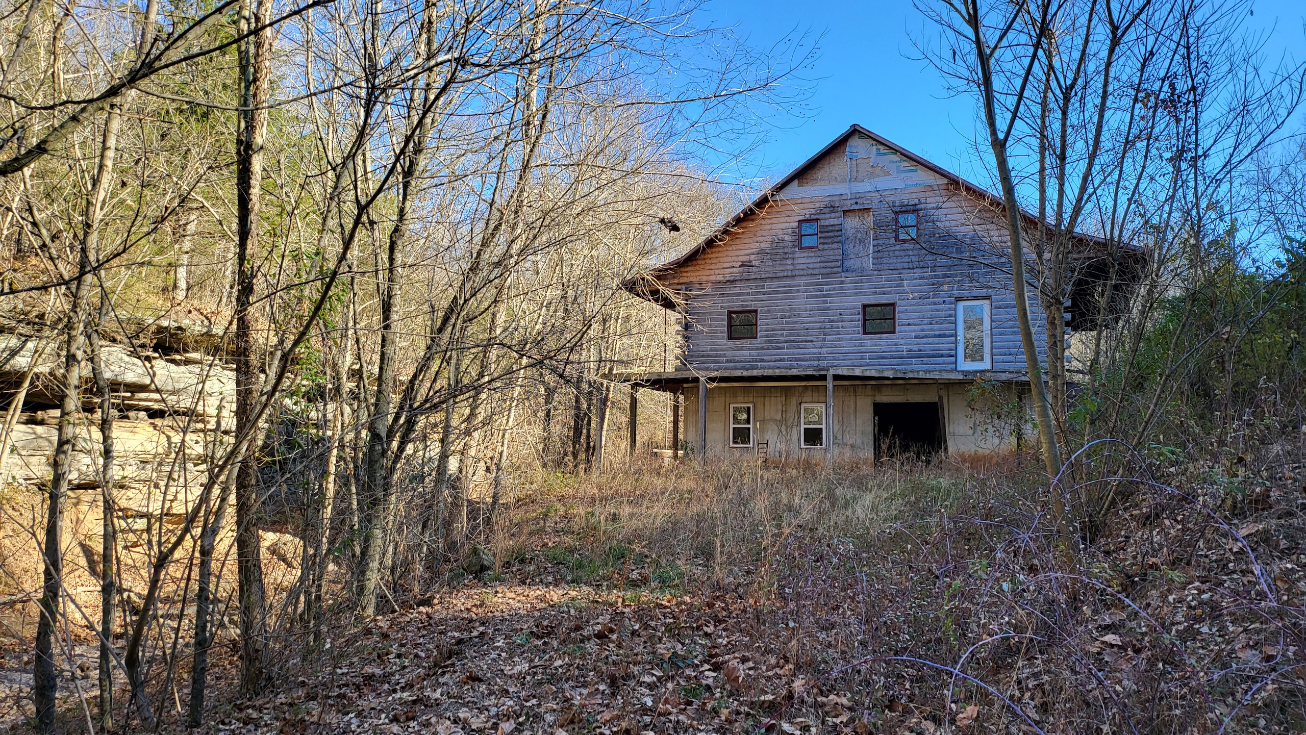 What a find on this unique acreage with loads of possibilities. Tucked in the rolling hills of the heart of the Ozarks sets a truly unique opportunity. This stunning tract presents so many options no matter your interest. For the hunter, this place is absolutely littered with quality buck sign and has a history of excellent hunting with a very healthy deer and turkey population. The rolling hills, steep banks, bluff cuts, saddles, white oak-laden flats, pinch points, and ample water all culminate to create a bow hunter's dream. So many stand locations and topographical advantages await you for fun chasing these big hill country bucks. A massive unfinished log lodge is set along a valley with lush year-round springs pouring right out of the rocks. This beautiful lodge is partially finished with a poured foundation, cedar-lined walls, huge staircase, a partially finished massive wrap-around deck, majestic vaulted ceilings, plenty of windows, and even most of the doors are on. The electric is mostly in place, plumbing has been installed throughout most of the lodge, and the setting is the epitome of "cabin in the woods." The massive specimen overlooks a bluff and overhang along the spring for easy access to crisp, clear Ozark Mountain spring water. With some imagination, sweat equity, and some investment, you can come in and put your own touch on this amazing lodge and make it whatever your heart desires; the possibilities are endless. There is also a newer large metal shop for additional storage. If you have ever wanted a private setting in the Ozarks, this is it. Flowing through the middle of the property is a beautiful year-round creek fed by multiple fresh springs that keep the water clear and cool all year. This creek has tons of character with some excellent settings to sit and enjoy the sounds of the small waterfalls trickling through the rocks as you are surrounded by beautiful hardwood timber and massive bluffs. Another large spring pours right under the overhang on the bluffs and feeds the creek—minnows, crawdads, frogs, and other water wildlife call this little creek home. Most of the bluff line towers over 50' tall and is accessible from either the top or the valley below. The rock features, outcroppings, and caves add to this place's world-class character. With this much terrain and quality access, you could let your imagination run wild and develop this special place. Cabins could be popped up just about anywhere, and the rental income could be impressive with this highly desirable location. Three county roads come together on the property and make for easy access virtually anywhere. Located just minutes from the Hasty public access on the Buffalo National River, this is an awesome opportunity for any outdoor enthusiast. Ample activities, including camping, hiking, fishing, canoeing, mountain biking, kayaking, and more, are all at your fingertips. Tracts with this rare amount of diversity and options just don't come along often. You can't afford to pass this one up.