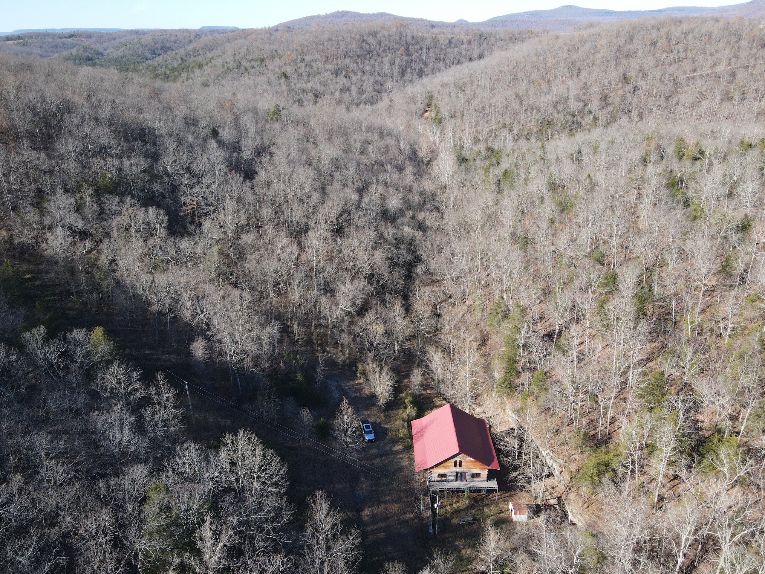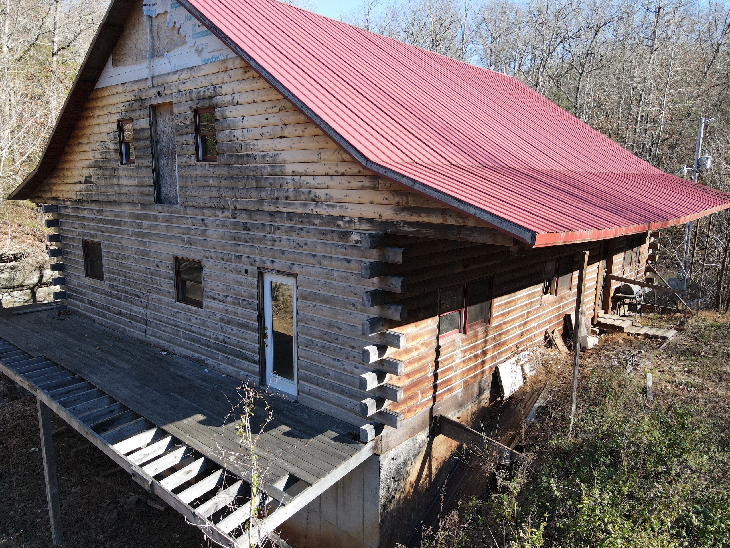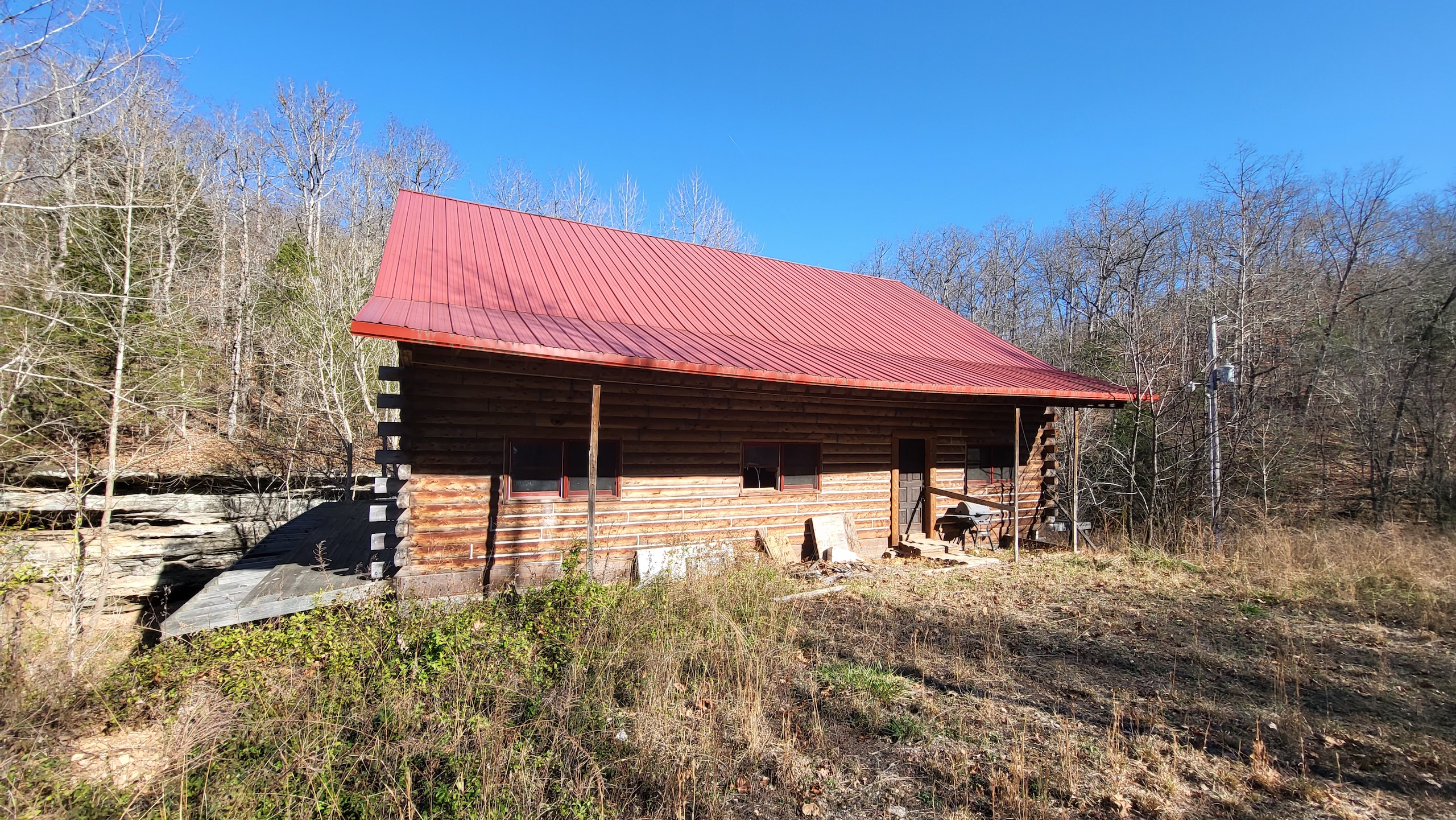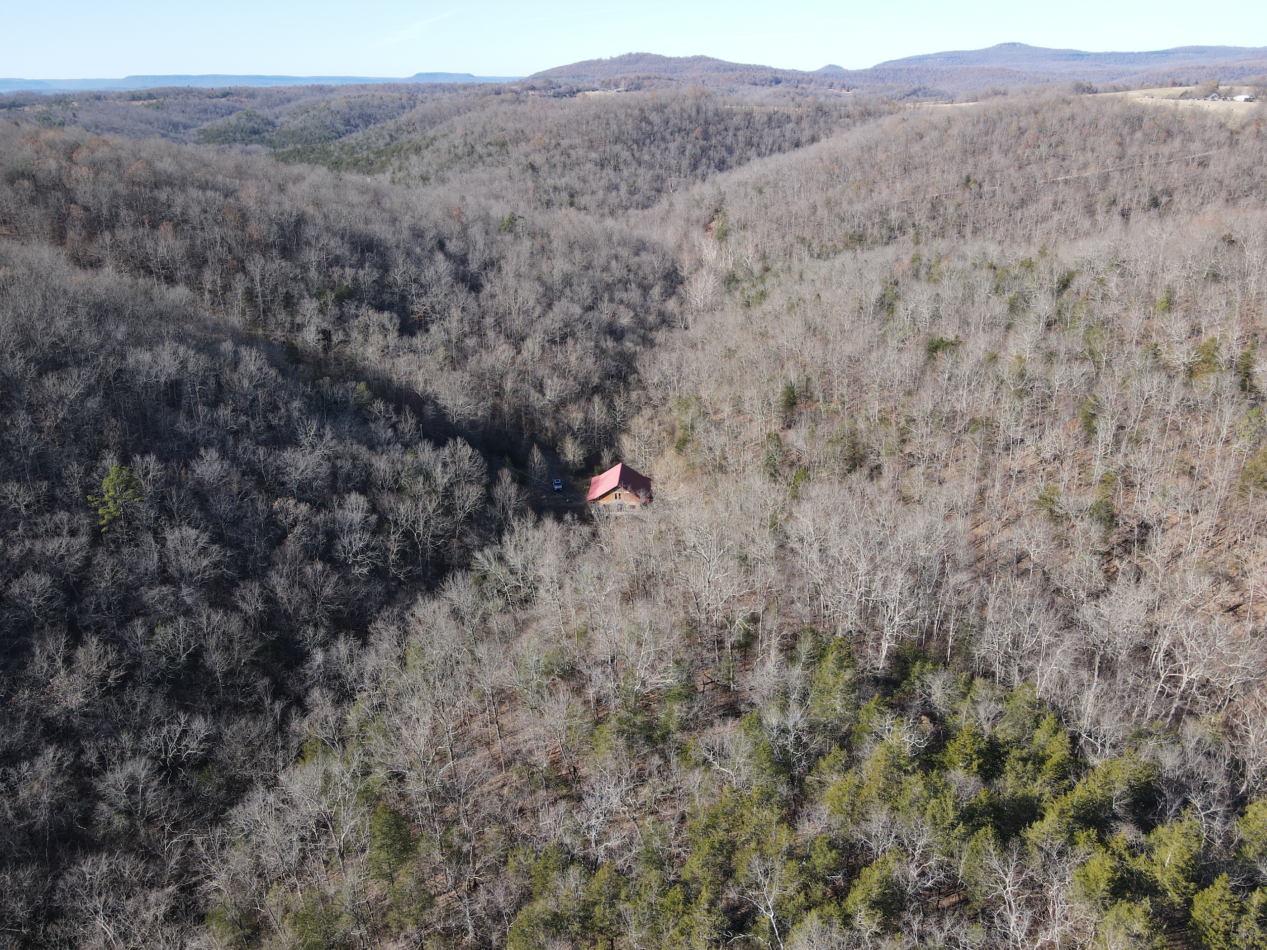 What a find on this unique acreage with loads of possibilities. Tucked in the rolling hills of the heart of the Ozarks sets a truly unique opportunity. This stunning tract presents so many options no matter your interest. For the hunter, this place is absolutely littered with quality buck sign and has a history of excellent hunting with a very healthy deer and turkey population. The rolling hills, steep banks, bluff cuts, saddles, white oak-laden flats, pinch points, and ample water all culminate to create a bow hunter's dream. So many stand locations and topographical advantages await you for fun chasing these big hill country bucks. A massive unfinished log lodge is set along a valley with lush year-round springs pouring right out of the rocks. This beautiful lodge is partially finished with a poured foundation, cedar-lined walls, huge staircase, a partially finished massive wrap-around deck, majestic vaulted ceilings, plenty of windows, and even most of the doors are on. The electric is mostly in place, plumbing has been installed throughout most of the lodge, and the setting is the epitome of "cabin in the woods." The massive specimen overlooks a bluff and overhang along the spring for easy access to crisp, clear Ozark Mountain spring water. With some imagination, sweat equity, and some investment, you can come in and put your own touch on this amazing lodge and make it whatever your heart desires; the possibilities are endless. There is also a newer large metal shop for additional storage. If you have ever wanted a private setting in the Ozarks, this is it. Flowing through the middle of the property is a beautiful year-round creek fed by multiple fresh springs that keep the water clear and cool all year. This creek has tons of character with some excellent settings to sit and enjoy the sounds of the small waterfalls trickling through the rocks as you are surrounded by beautiful hardwood timber and massive bluffs. Another large spring pours right under the overhang on the bluffs and feeds the creek—minnows, crawdads, frogs, and other water wildlife call this little creek home. Most of the bluff line towers over 50' tall and is accessible from either the top or the valley below. The rock features, outcroppings, and caves add to this place's world-class character. With this much terrain and quality access, you could let your imagination run wild and develop this special place. Cabins could be popped up just about anywhere, and the rental income could be impressive with this highly desirable location. Three county roads come together on the property and make for easy access virtually anywhere. Located just minutes from the Hasty public access on the Buffalo National River, this is an awesome opportunity for any outdoor enthusiast. Ample activities, including camping, hiking, fishing, canoeing, mountain biking, kayaking, and more, are all at your fingertips. Tracts with this rare amount of diversity and options just don't come along often. You can't afford to pass this one up.
