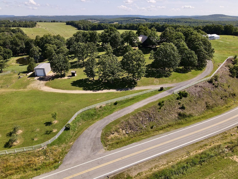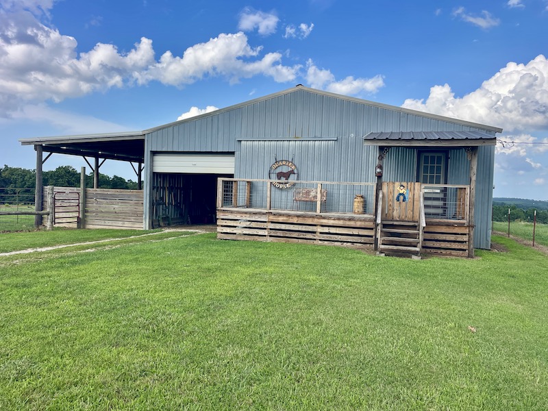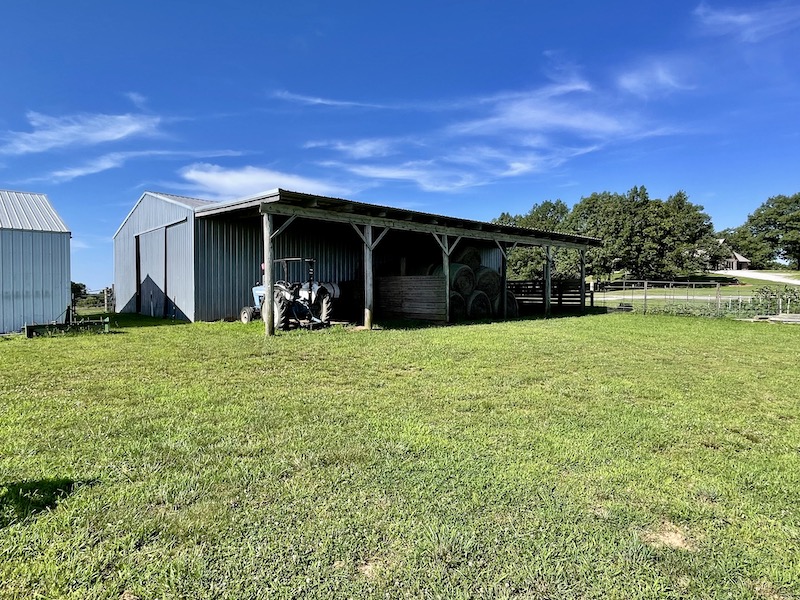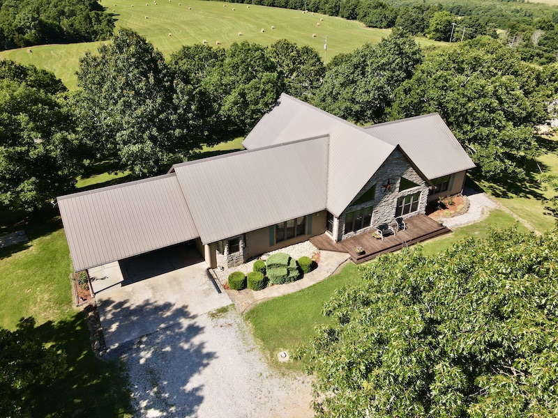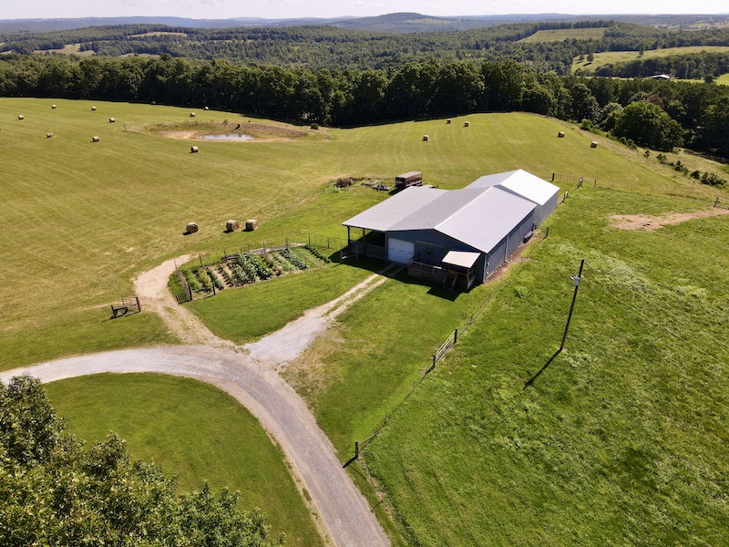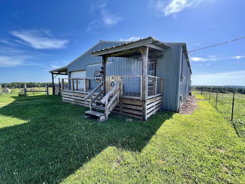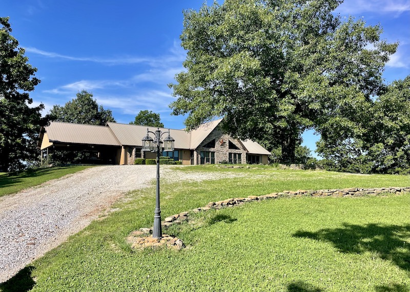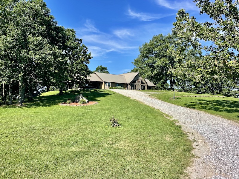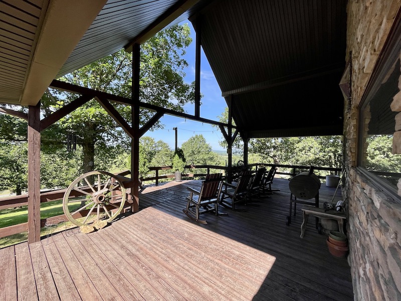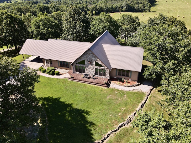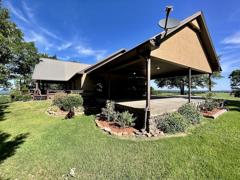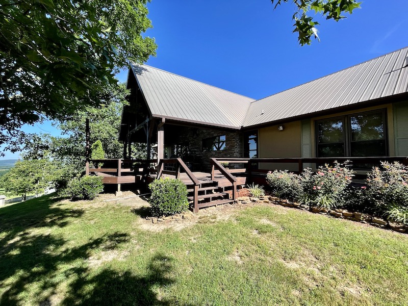 Perched atop the highest point in the county, this premier Ozark Mountain estate offers a rare combination of luxurious comfort, self-sufficient functionality, and breathtaking panoramic views. The custom-built 3-bedroom, 2-bathroom main residence spans 2,542 square feet, with expansive decks and covered porches that capture stunning sunrises, sunsets, and rolling green pastures from nearly every room. Thoughtfully designed with wide plank hardwood flooring and tongue-and-groove wood ceilings, the open-concept layout is filled with natural light thanks to oversized windows that invite the outdoors in. The chef’s kitchen features a commercial-grade stove, ample counter space, a large island perfect for gatherings, a lighted coffee bar, and a walk-in pantry. The dining area, tucked beside oversized double doors, opens to a spacious covered porch shaded by mature trees - a perfect place to enjoy meals while taking in the scenery. The split-bedroom floor plan creates privacy, with a spacious primary suite offering two walk-in closets, a large bathroom with a Jacuzzi tub and shower, and a picture window framing your private view of the sunrise over the mountains. The additional two bedrooms are generously sized and feature equally inspiring views. Complementing the main home is an 800 sq. ft. 1-bed, 1-bath barndominium-style guest quarters with a full kitchen and inviting front porch - ideal for multi-generational living or visiting guests. Adjacent to the guest house is a horse barn with five stalls, electricity and water, and an attached 60’ x 20’ equipment shed. A nearby garden plot offers space to grow your own food. Additional improvements include a large workshop with concrete floors, electric, water, high ceilings, and a 16' overhead door - perfect for storing farm equipment, RVs, or for serious hobbyists. The gently rolling acreage is comprised mostly of improved hay-producing pastures, teeming with wildlife including deer, turkey, and black bear. Every inch of this property has been thoughtfully maintained and masterfully developed to elevate both function and serenity. Offering seclusion, luxury, and commanding views, this is truly one of the county’s premier properties, situated in the heart of the Ozark Mountains and designed for those seeking a lifestyle rooted in nature without sacrificing comfort.