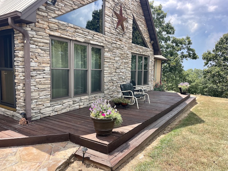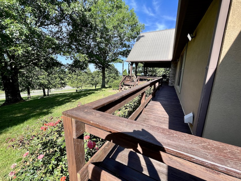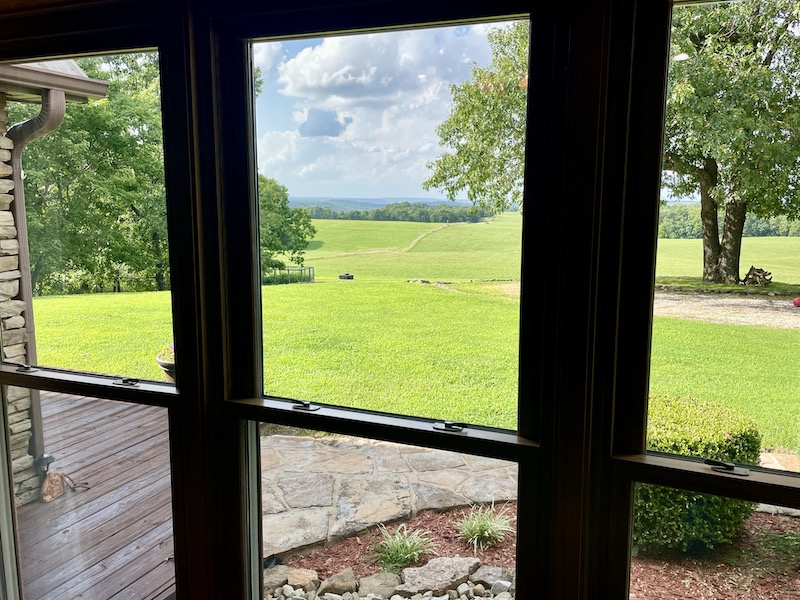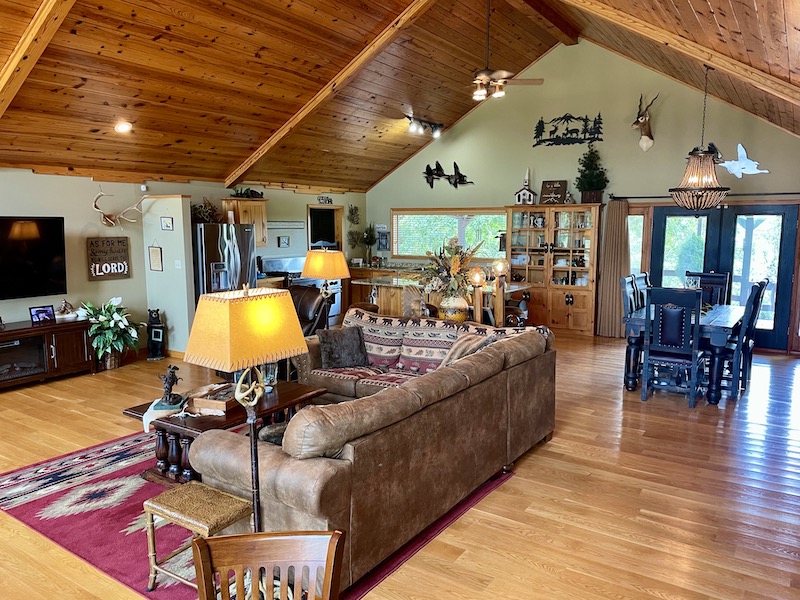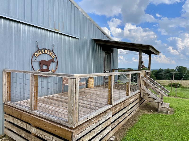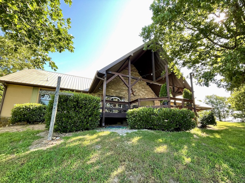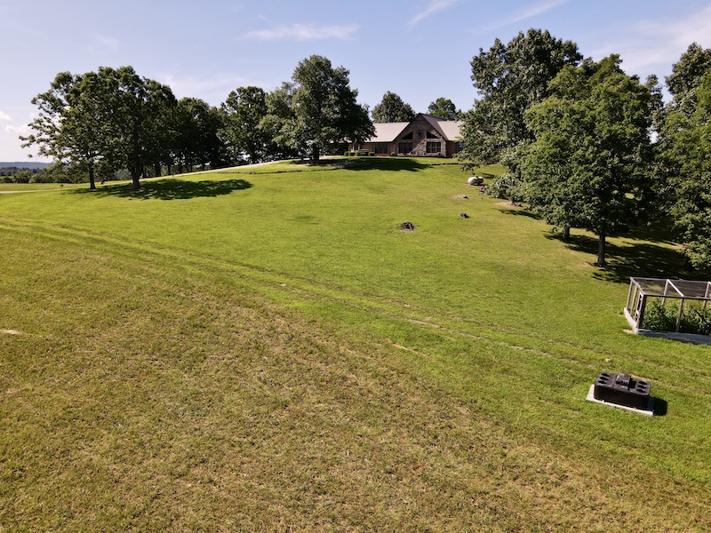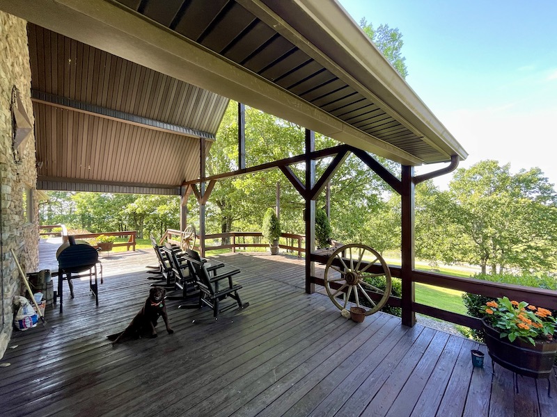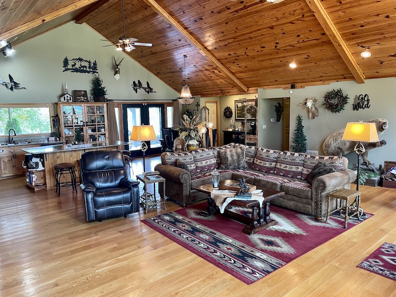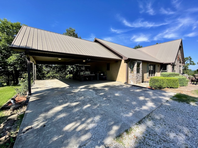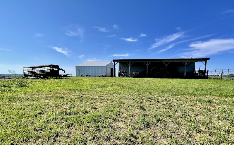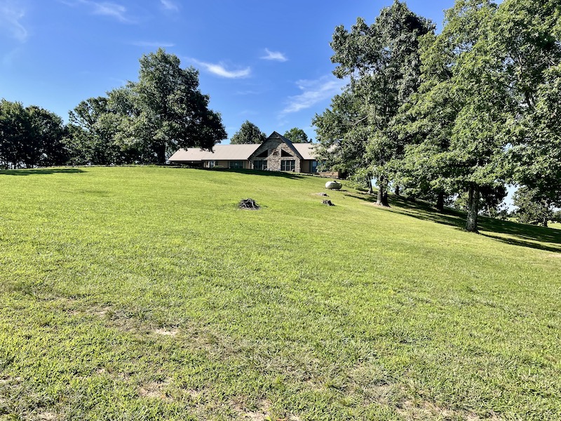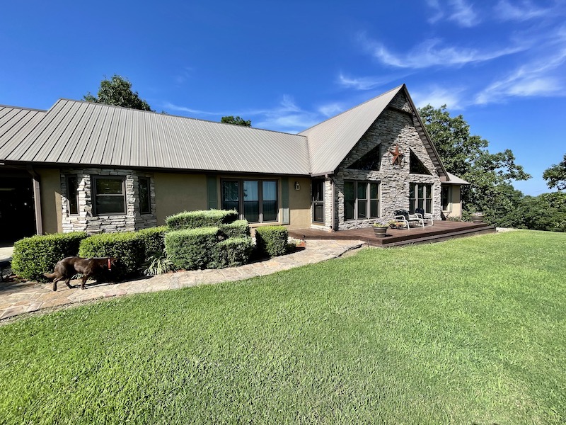 Perched atop the highest point in the county, this premier Ozark Mountain estate offers a rare combination of luxurious comfort, self-sufficient functionality, and breathtaking panoramic views. The custom-built 3-bedroom, 2-bathroom main residence spans 2,542 square feet, with expansive decks and covered porches that capture stunning sunrises, sunsets, and rolling green pastures from nearly every room. Thoughtfully designed with wide plank hardwood flooring and tongue-and-groove wood ceilings, the open-concept layout is filled with natural light thanks to oversized windows that invite the outdoors in. The chef’s kitchen features a commercial-grade stove, ample counter space, a large island perfect for gatherings, a lighted coffee bar, and a walk-in pantry. The dining area, tucked beside oversized double doors, opens to a spacious covered porch shaded by mature trees - a perfect place to enjoy meals while taking in the scenery. The split-bedroom floor plan creates privacy, with a spacious primary suite offering two walk-in closets, a large bathroom with a Jacuzzi tub and shower, and a picture window framing your private view of the sunrise over the mountains. The additional two bedrooms are generously sized and feature equally inspiring views. Complementing the main home is an 800 sq. ft. 1-bed, 1-bath barndominium-style guest quarters with a full kitchen and inviting front porch - ideal for multi-generational living or visiting guests. Adjacent to the guest house is a horse barn with five stalls, electricity and water, and an attached 60’ x 20’ equipment shed. A nearby garden plot offers space to grow your own food. Additional improvements include a large workshop with concrete floors, electric, water, high ceilings, and a 16' overhead door - perfect for storing farm equipment, RVs, or for serious hobbyists. The gently rolling acreage is comprised mostly of improved hay-producing pastures, teeming with wildlife including deer, turkey, and black bear. Every inch of this property has been thoughtfully maintained and masterfully developed to elevate both function and serenity. Offering seclusion, luxury, and commanding views, this is truly one of the county’s premier properties, situated in the heart of the Ozark Mountains and designed for those seeking a lifestyle rooted in nature without sacrificing comfort.