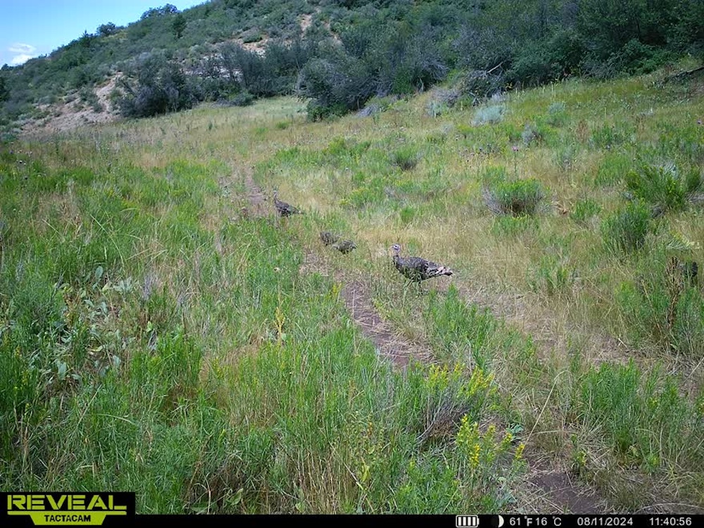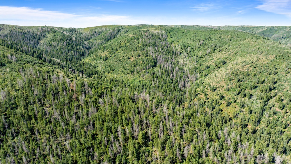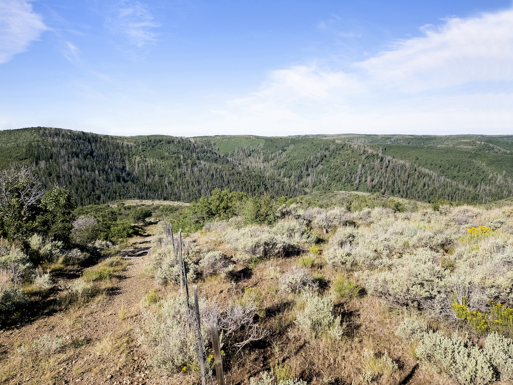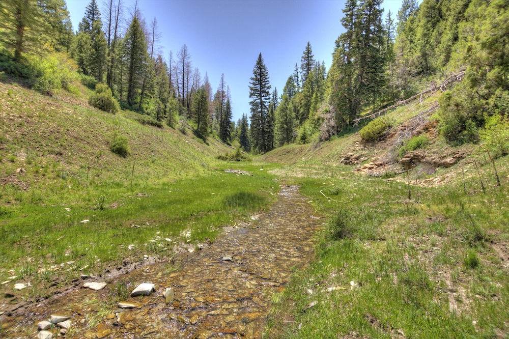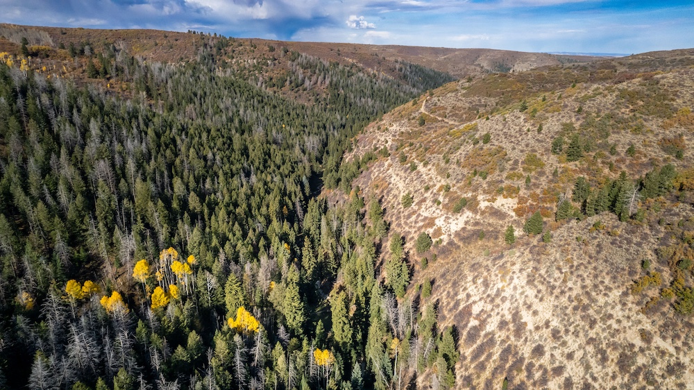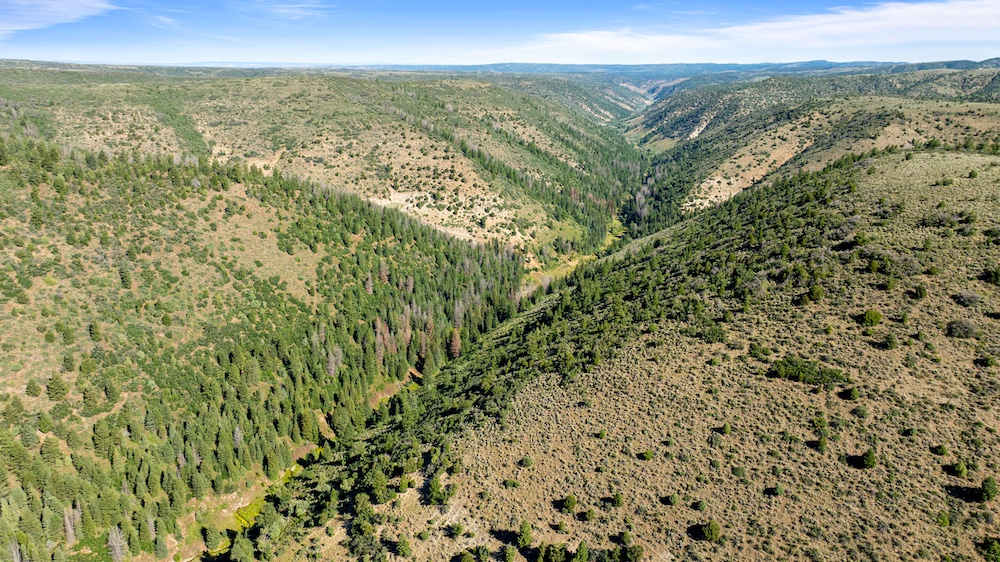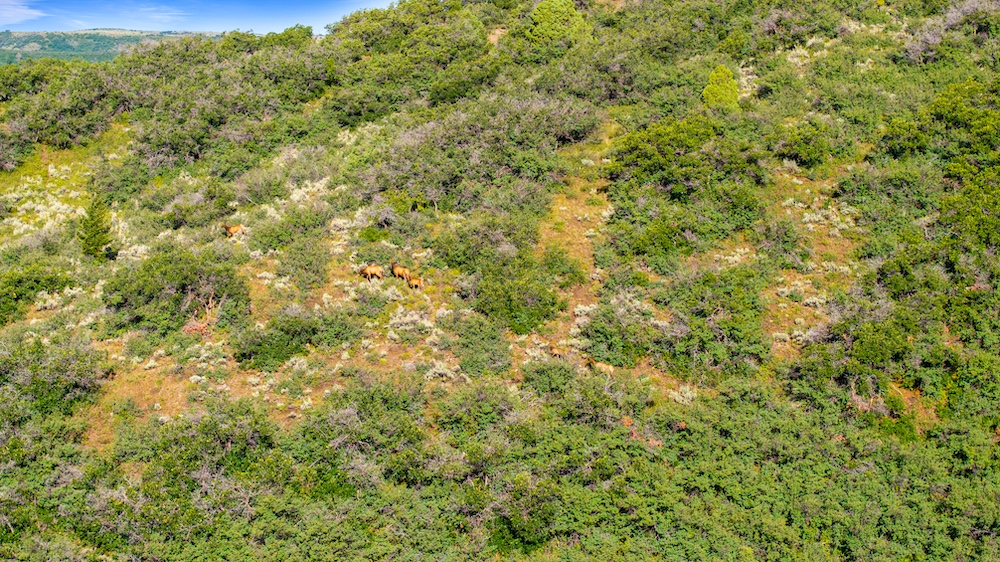 The landscape of Arrow Rim Ranch is a scenic mix of timbered ridges, oak brush hillsides, open meadows, and pockets of mature pine and aspen. The variation in vegetation and elevation creates a beautiful backdrop for year-round recreation and supports a wide range of wildlife. In the spring and summer, green native grasses and wildflowers fill the meadows, while the aspens and oaks add color and cover through the fall. The diverse habitat provides excellent food and bedding for elk, mule deer, bear, turkey, and even moose, which frequently travel the draws and ridgelines between the creeks and adjacent public lands.