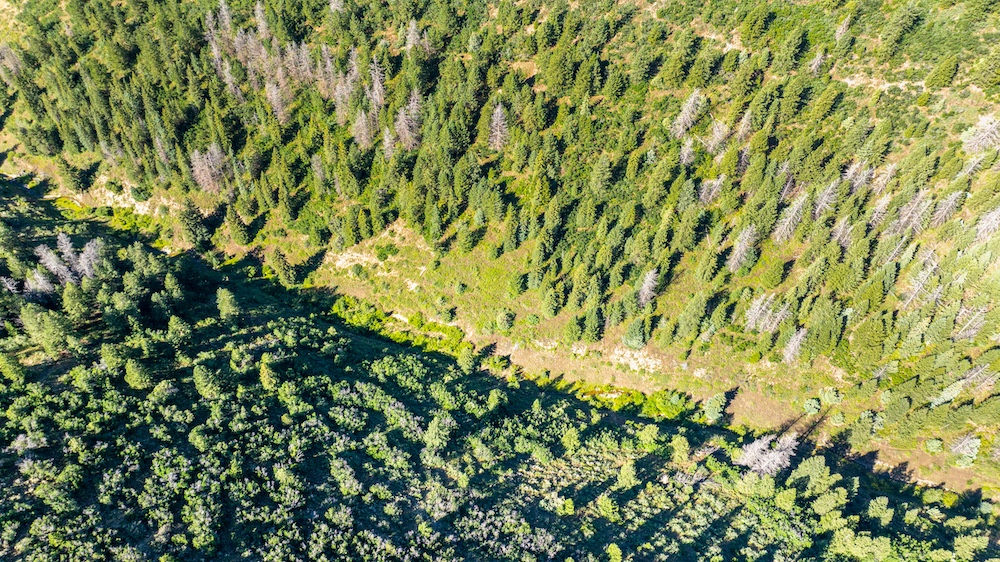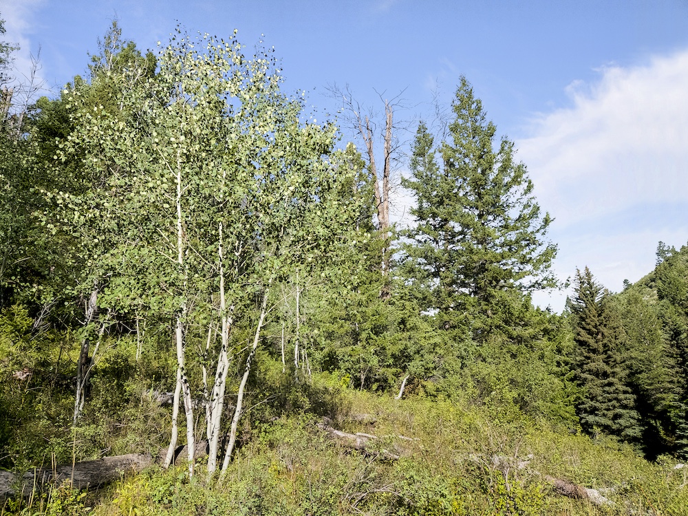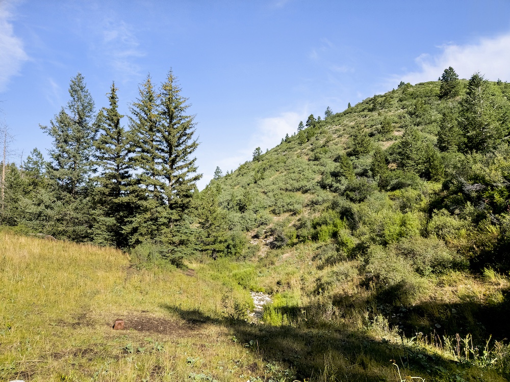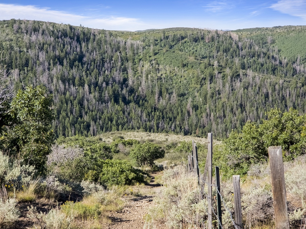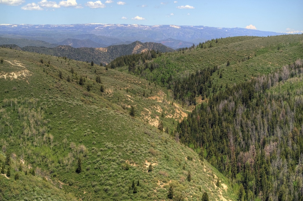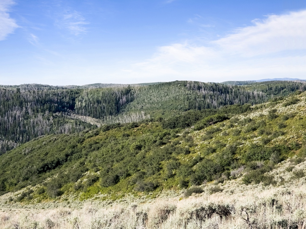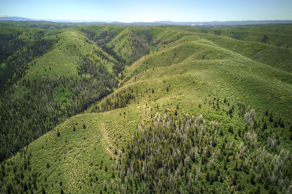 The landscape of Arrow Rim Ranch is a scenic mix of timbered ridges, oak brush hillsides, open meadows, and pockets of mature pine and aspen. The variation in vegetation and elevation creates a beautiful backdrop for year-round recreation and supports a wide range of wildlife. In the spring and summer, green native grasses and wildflowers fill the meadows, while the aspens and oaks add color and cover through the fall. The diverse habitat provides excellent food and bedding for elk, mule deer, bear, turkey, and even moose, which frequently travel the draws and ridgelines between the creeks and adjacent public lands.