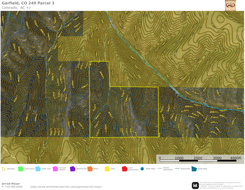 Arrow Rim Ranch offers 249 acres of high-country recreational and hunting land in Garfield County, Colorado, situated within Game Management Unit (GMU) 22. This mountain property borders extensive BLM public lands, providing direct access to thousands of acres of rugged country known for abundant wildlife and outdoor opportunities. While Cow Creek and Bear Creek lie just beyond the property boundary, their presence nearby contributes to the strong wildlife movement that defines this area.