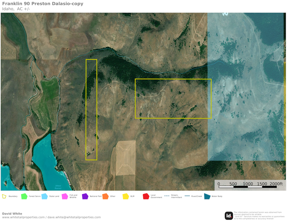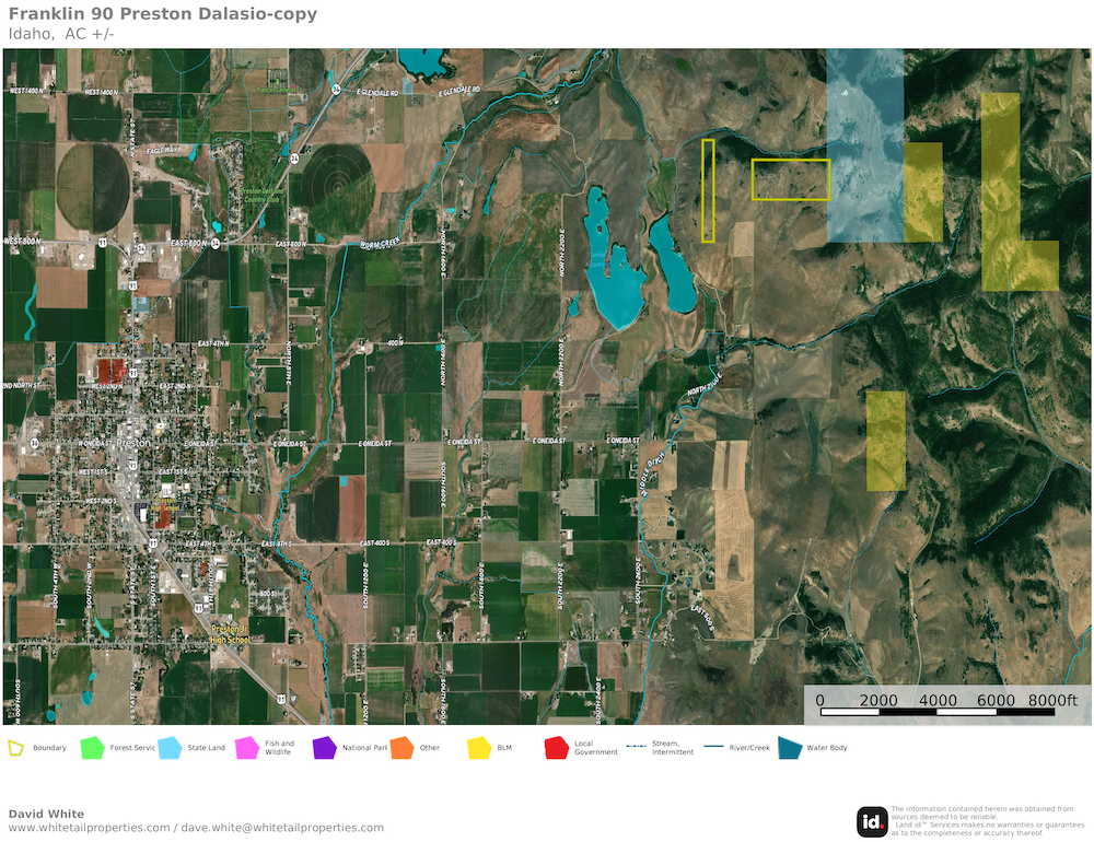 Exceptional opportunity to own your private hunting and recreation base just 4 miles from Preston, Idaho. This property offers a rare combination of privacy, wildlife, and panoramic views — overlooking the surrounding mountains and fertile valley below. It adjoins 326 acres of landlocked State ground plus another 84 acres of BLM land, providing direct access to hundreds of acres rarely reached by the public.