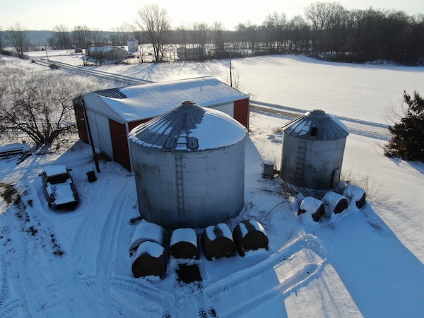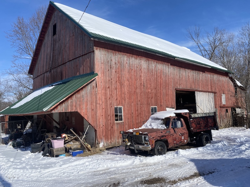The property includes several outbuildings and grain bins, highlighted by an original bank barn built in 1890 and a newer pole barn constructed in 1986. The land consists of rolling hardwoods with flatter pasture areas and is currently used as a small working cattle farm that generates income for the owner.