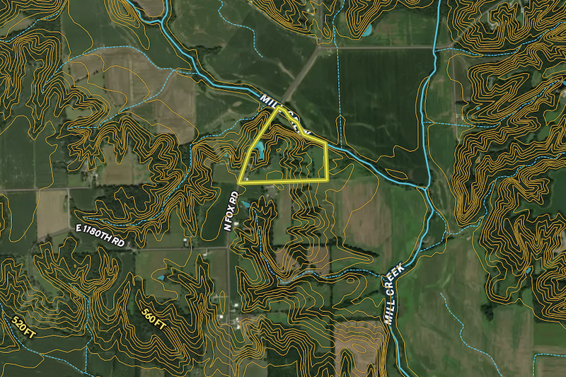 Two natural water sources enhance the property: a small timber pond near the north end and Mill Creek forming the eastern boundary. These provide excellent water access for both livestock and wildlife. The property also offers strong recreational potential with abundant deer and turkey activity, multiple food plot locations, and natural travel corridors created by the creek and adjoining woodlots.
