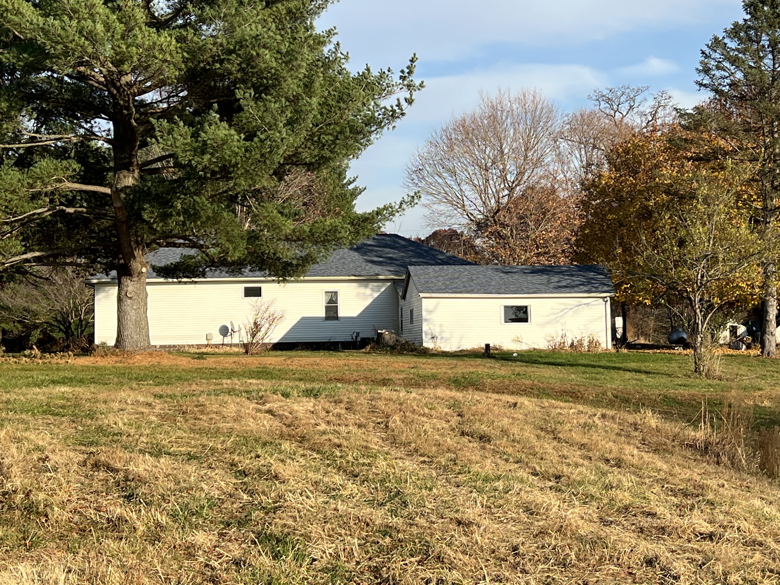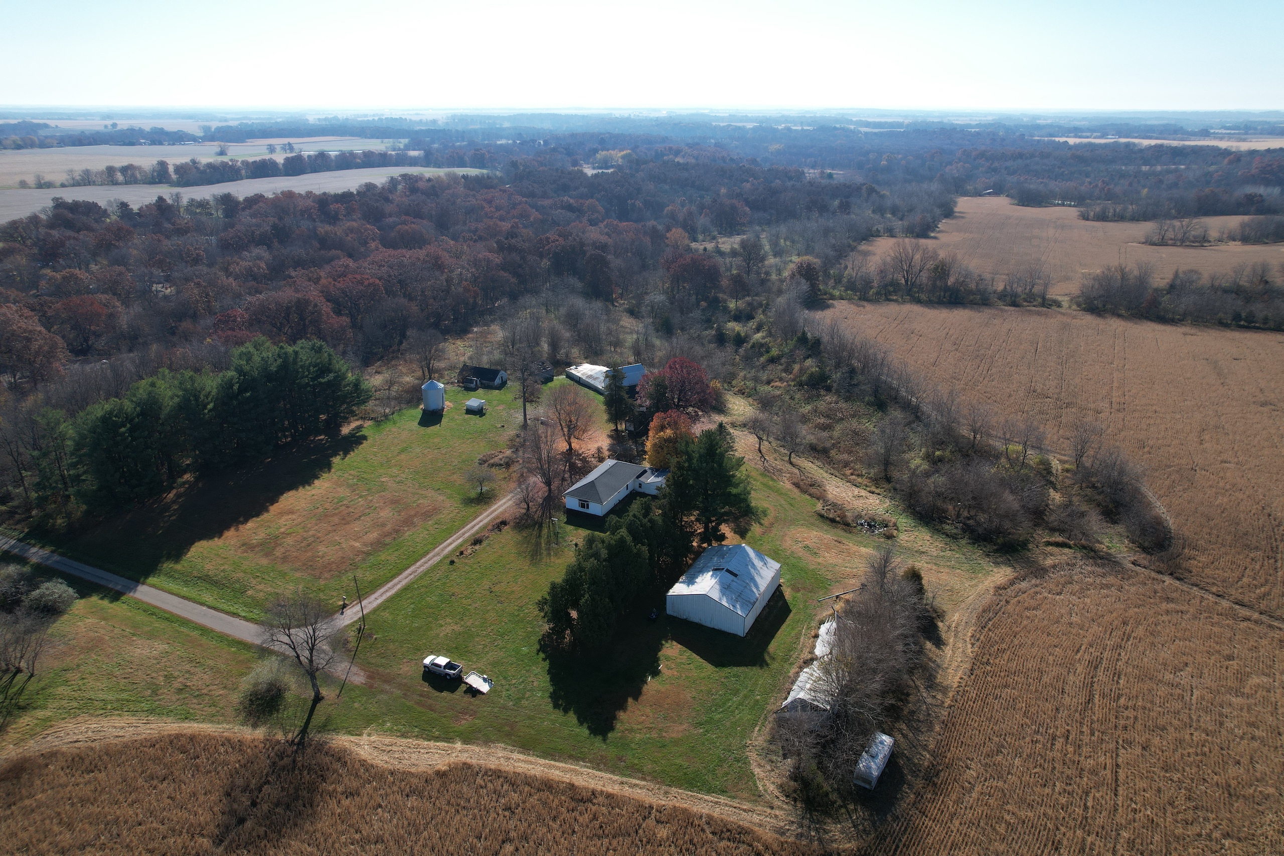 Tract one is 9.27+/- Acres and includes a 3 bedroom, 1 bath 1680 Sq. Ft house along with a 440 Sq. Ft garage. There is also a 2,200 Sq. Ft machine shed and a barn. The large yard and wooded acres make it a quiet, secluded area with a lot of potentials. The house will be sold As-Is along with the other improvements. The home has a drilled well and private septic and has an ideal pond building location.