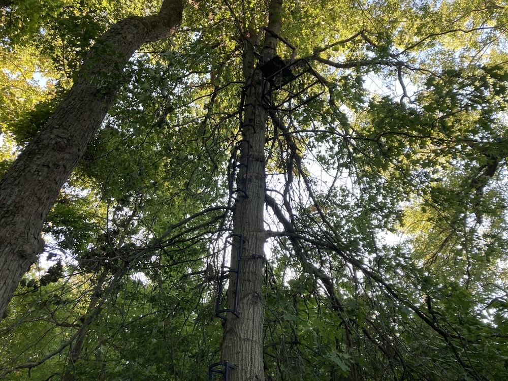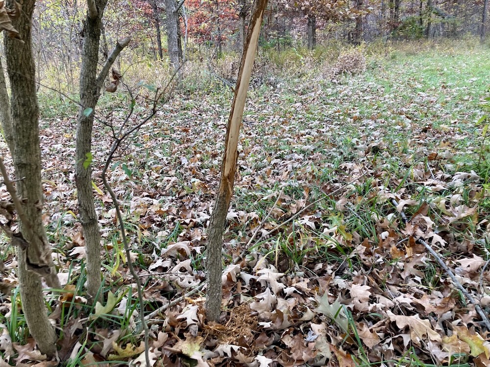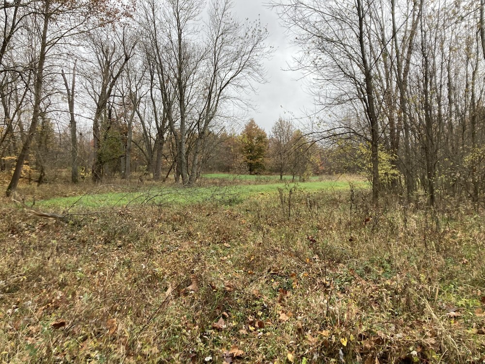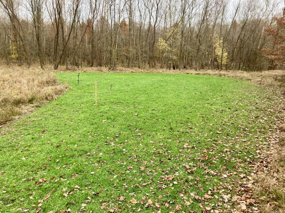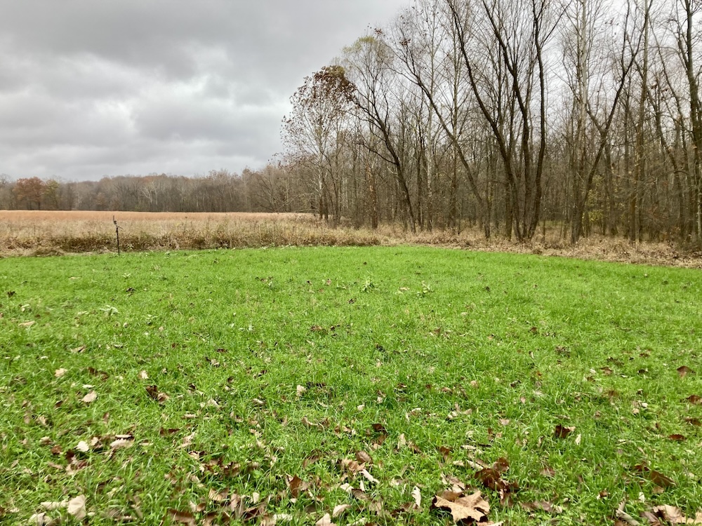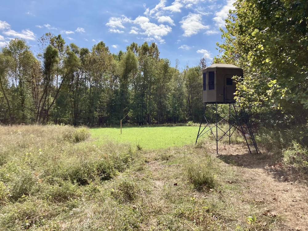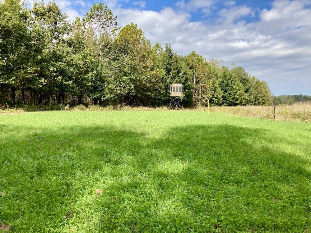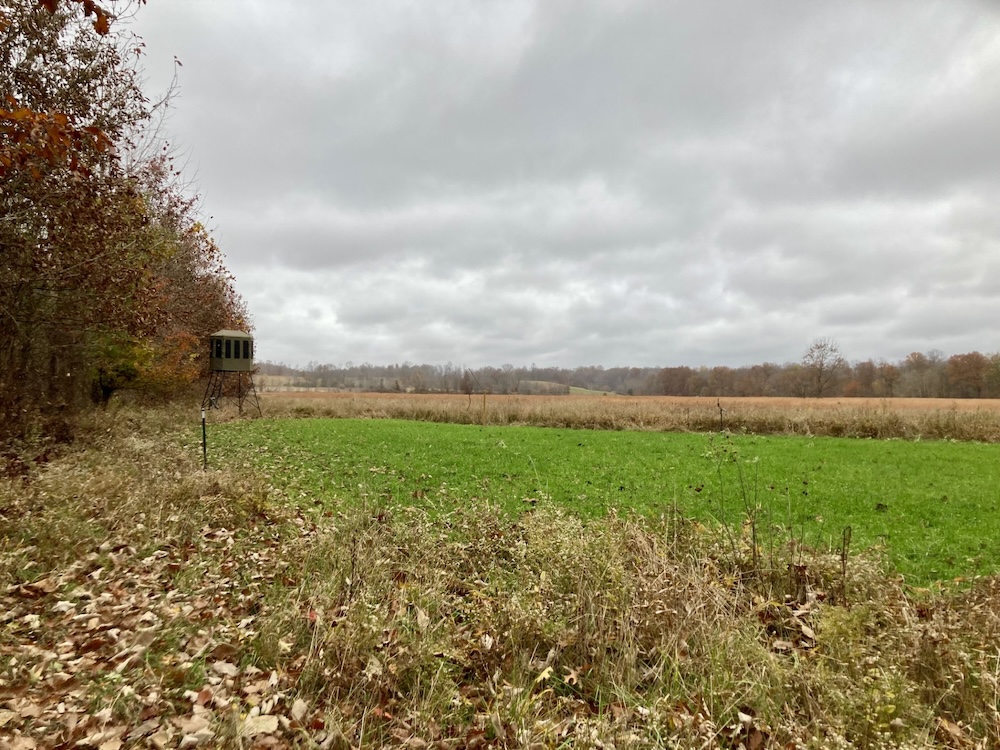 The large half-acre food plot is surrounded by bedding cover and great access trails to stands which are positioned to hunt in any wind direction. The southern end of this food plot is a hub of activity with creeks, wood edge and food all converging. The plot edge has been stripped of all low hanging branches, apart from two scrapes set within bow range of the stands. These scrapes are heavily used as seen in the trail camera pictures. The second food plot is located at an inside corner with a mock scrape set within bow range of the blind. This blind overlooks a large field providing great visibility to call in a buck or hunt a large area during gun seasons. The established food plots contain clover, winter wheat and winter rye which will be utilized by deer into the winter months.