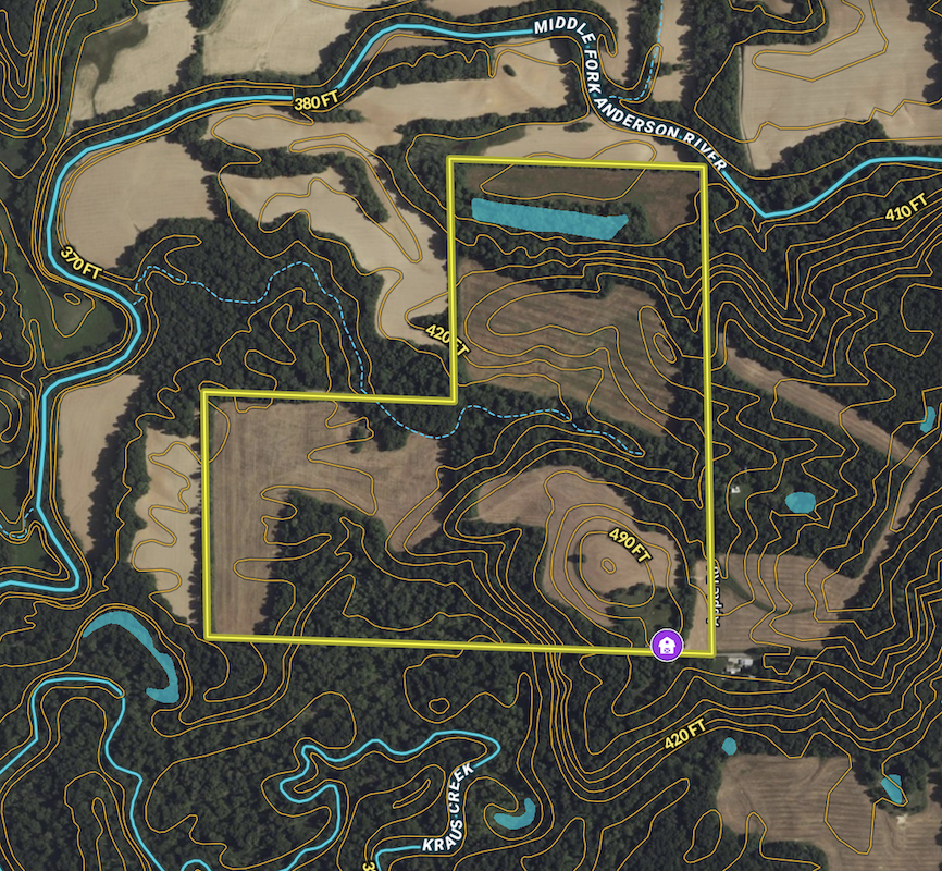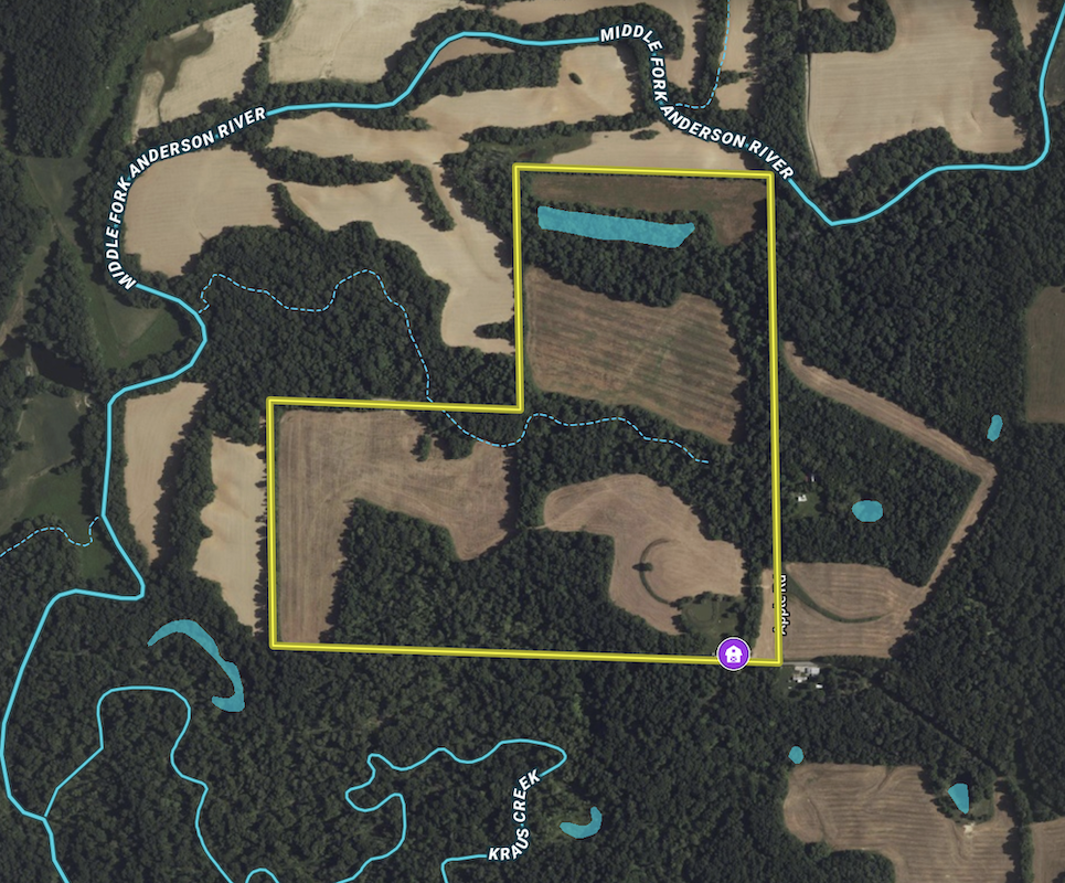 Located in Southwestern Perry County, just 11 miles from Tell City, this property presents a rare opportunity for the serious outdoorsman. This farm is accessed at the dead-end of Apple Road, creating a very secluded setting. As you enter the farm through the gated entrance, you are greeted by several potential cabin or home build sites with a pond nearby. The location and layout of these potential build sites offer privacy, beautiful country views, and do not negatively impact the hunting ability of the rest of the farm. This property boasts a remarkable diversity, offering a perfect blend of tillable land, mature hardwoods, and river bottom timber, as well as thick stands of young timber, rock outcroppings, and even a slough currently inhabited by wood ducks. All these different types of habitats create a tremendous amount of attraction for both deer, turkeys, and some waterfowl. Deer activity is abundant throughout the property, with large, fresh rubs and well-worn trails and scrapes, especially along the northeast and southwest portions of the property. One of the best aspects of this farm's layout is the high density of edge habitat, which is strategically placed to create natural funnels and pinch points that make perfect ambush locations for deer hunting. Large fields of river-bottom agriculture surround this property to the north, and extensive blocks of timber to the south create even more attraction to the location. Situated just East of the Middle Fork Anderson River, this property lies in a proven area for both deer and turkey. This farm and its surrounding area have a strong history of producing high-quality deer and turkey. There are approximately 45+/- acres currently in tillable production, providing income for the landowner, with the potential to add additional tillable acreage. Whether you’re a passionate hunter, farmer, or looking for a place to live and enjoy nature, this property offers unmatched recreational opportunities.