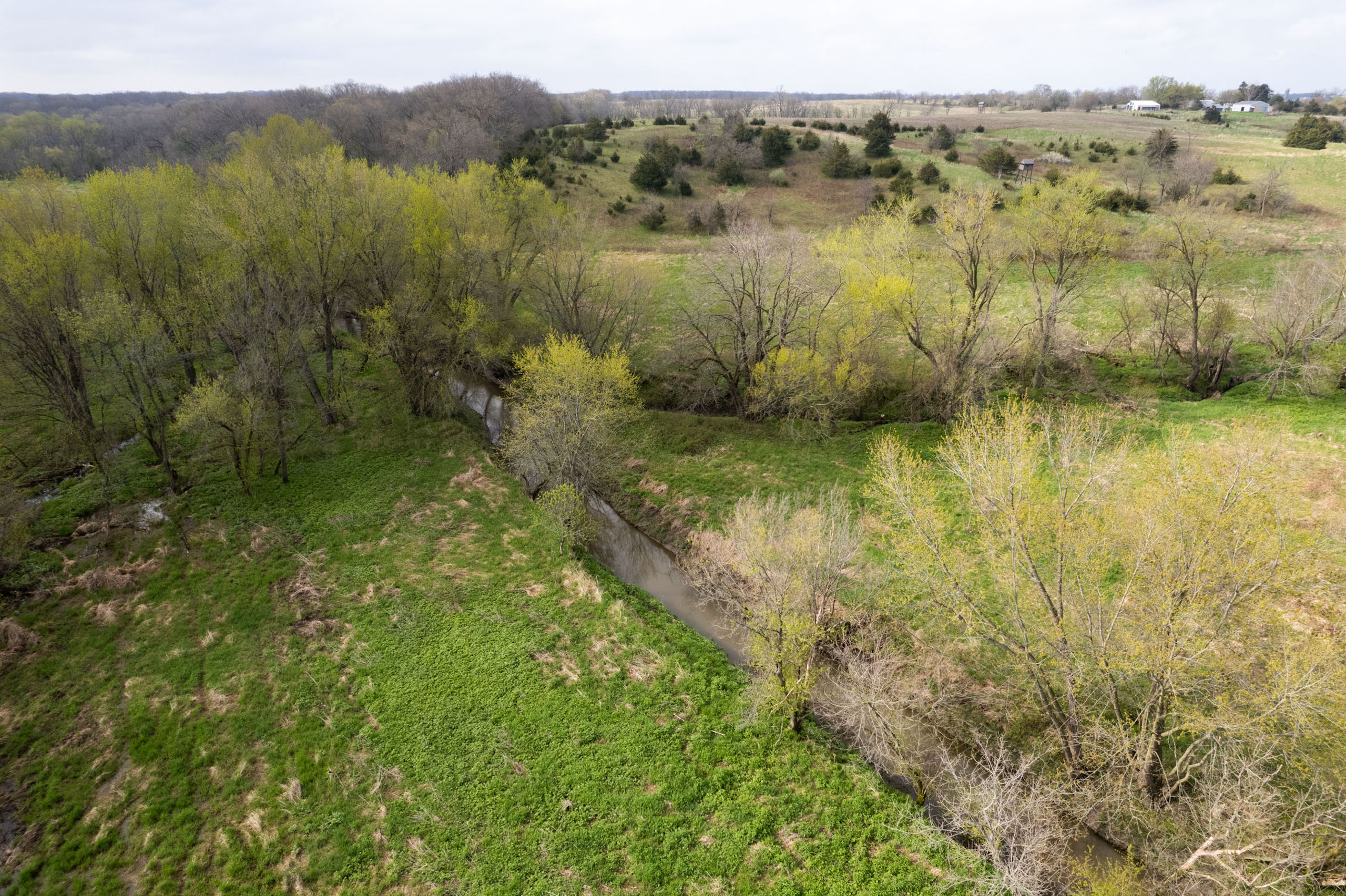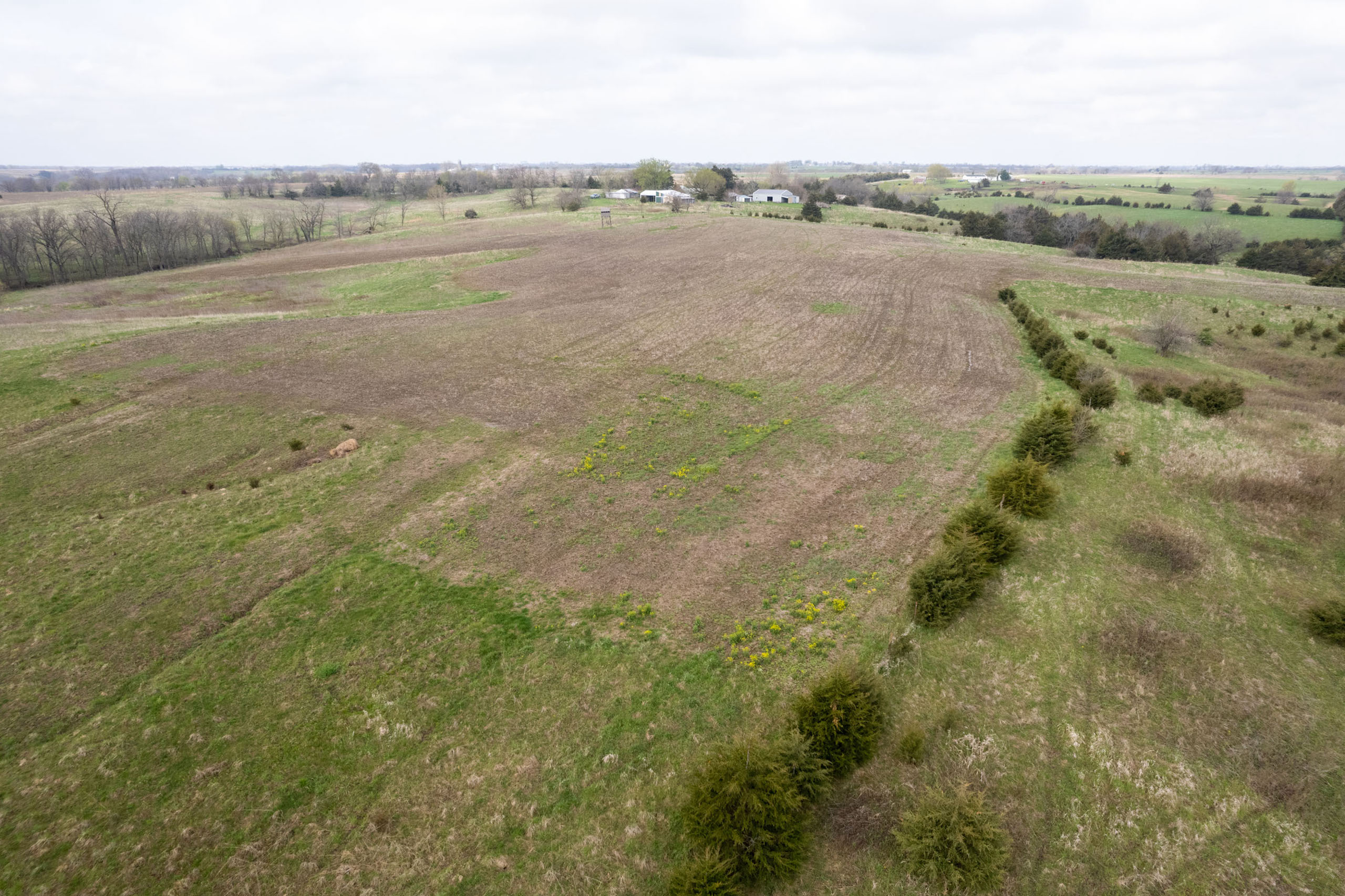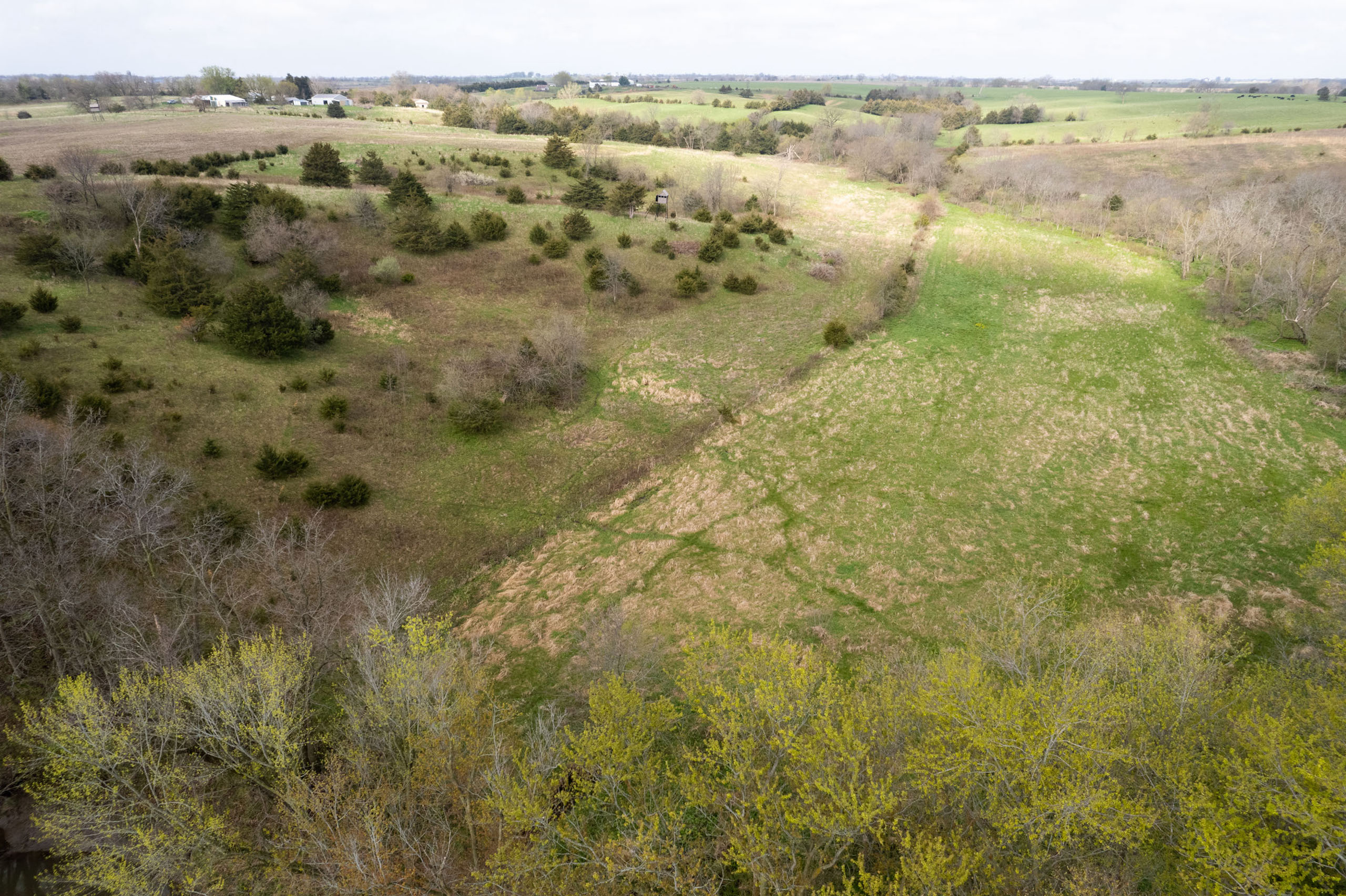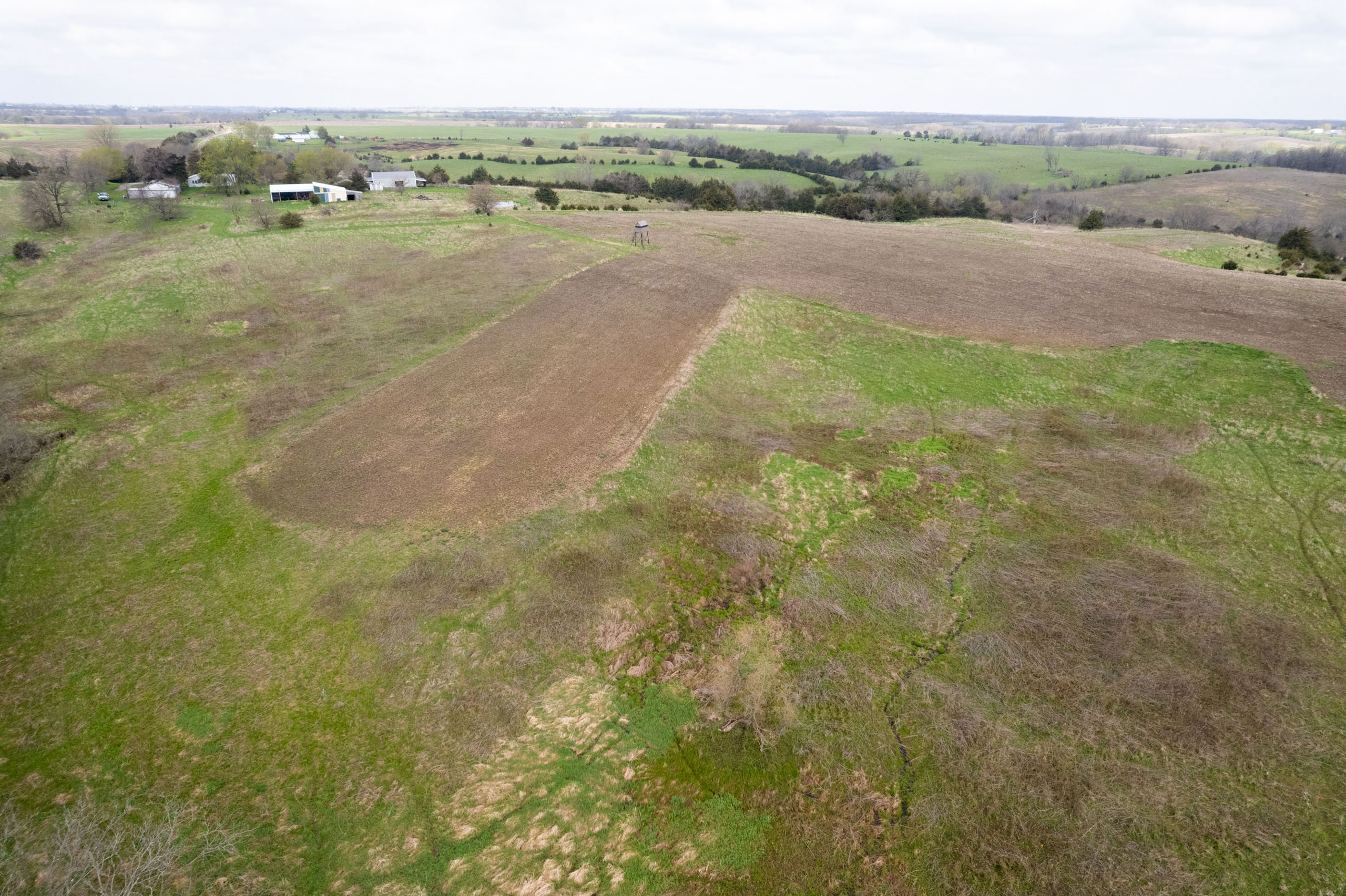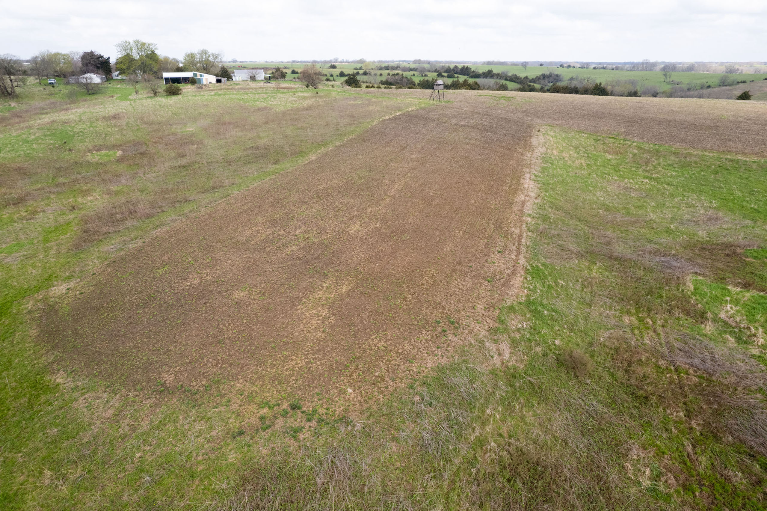 A dead-end road leads you to the southwest corner gate of the property. Inside the entrance is a machine shed for storing equipment and a pond. This area would make a perfect place to build. To the east is approximately 12 tillable acres, which historically have been used as a giant food plot. The late-season hunting here is described as “tremendous”! To the east and southeast is a significant block of timber; to the north is a south-facing hillside of CRP native grasses and a thick east/west creek bottom.