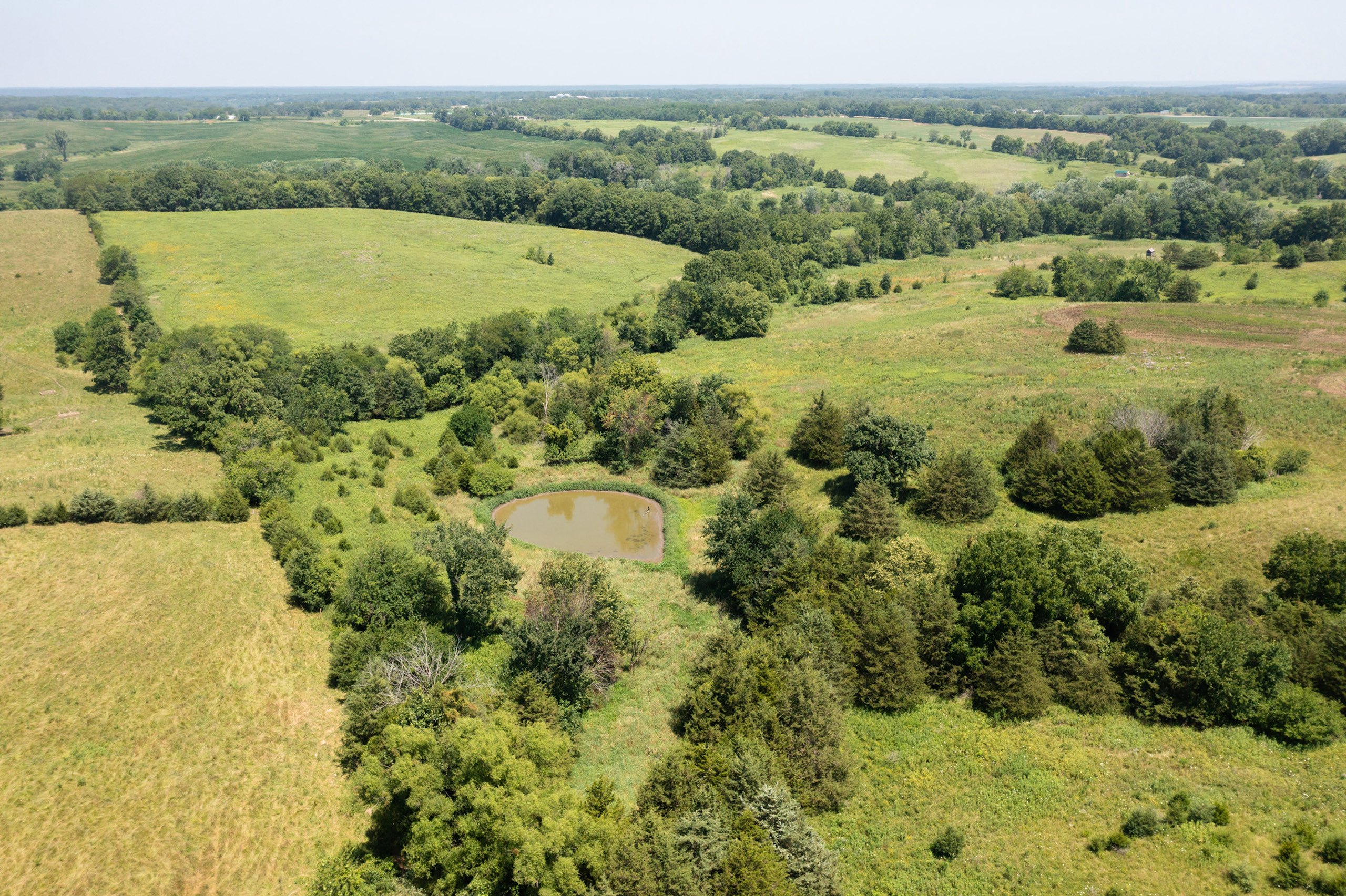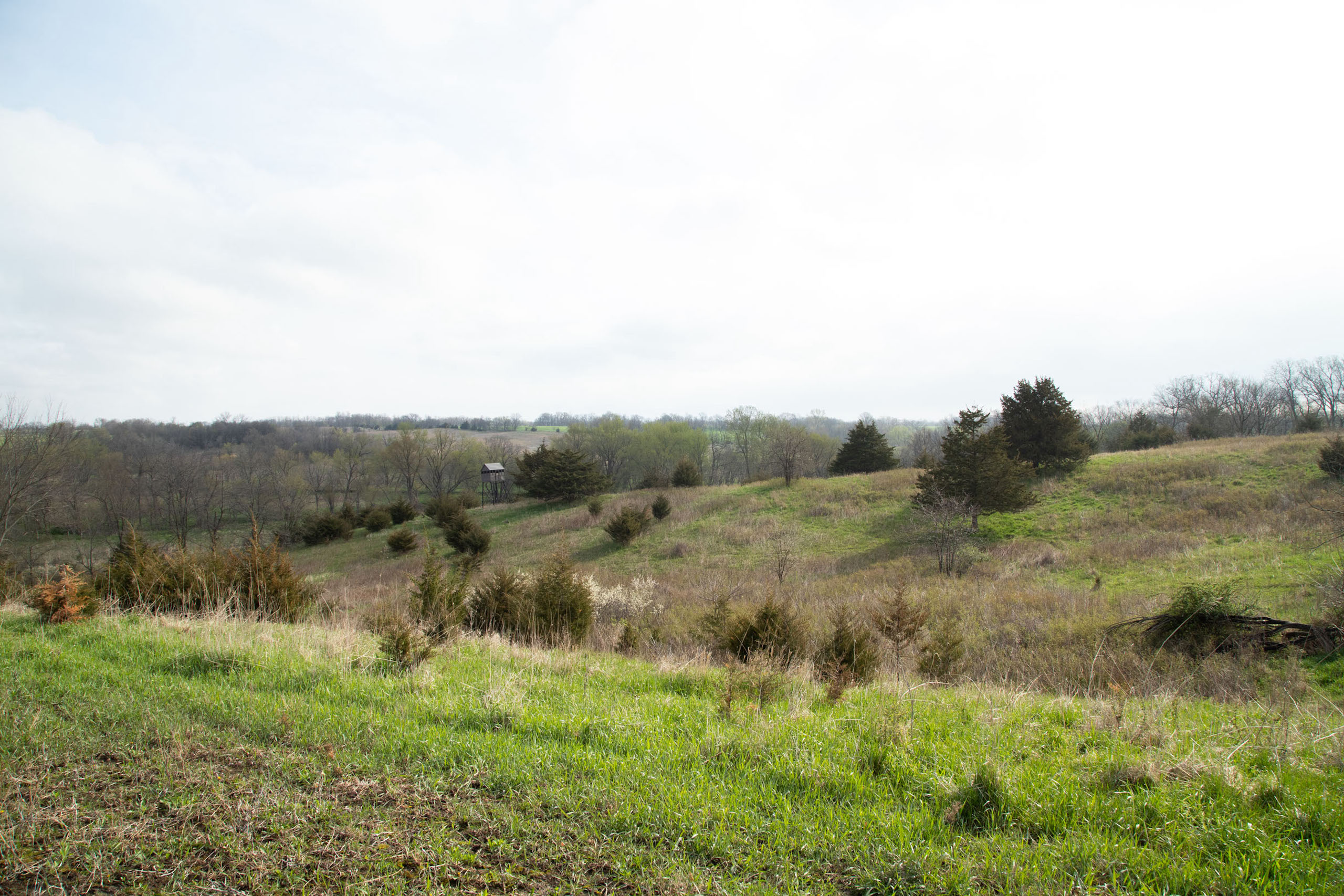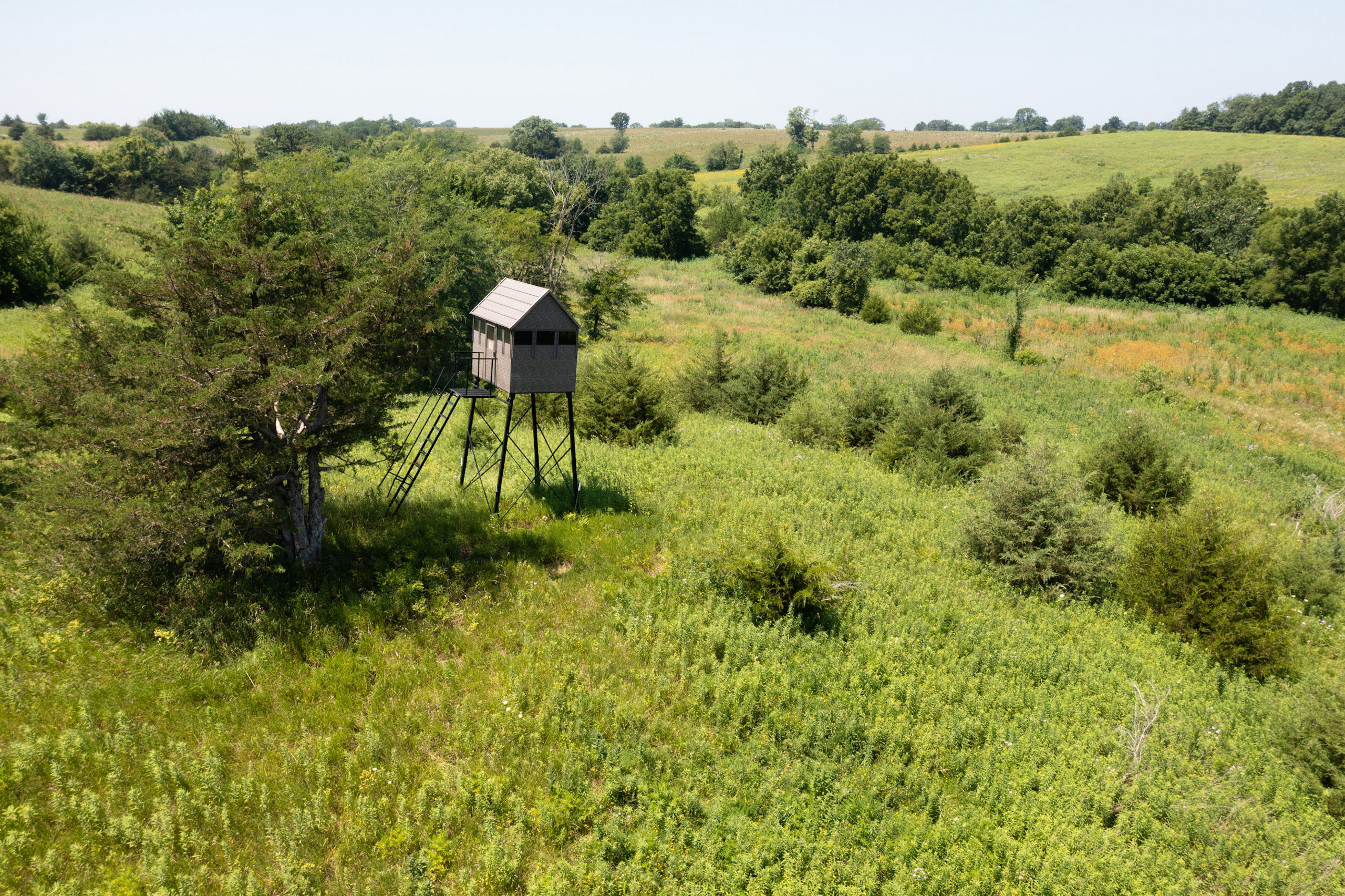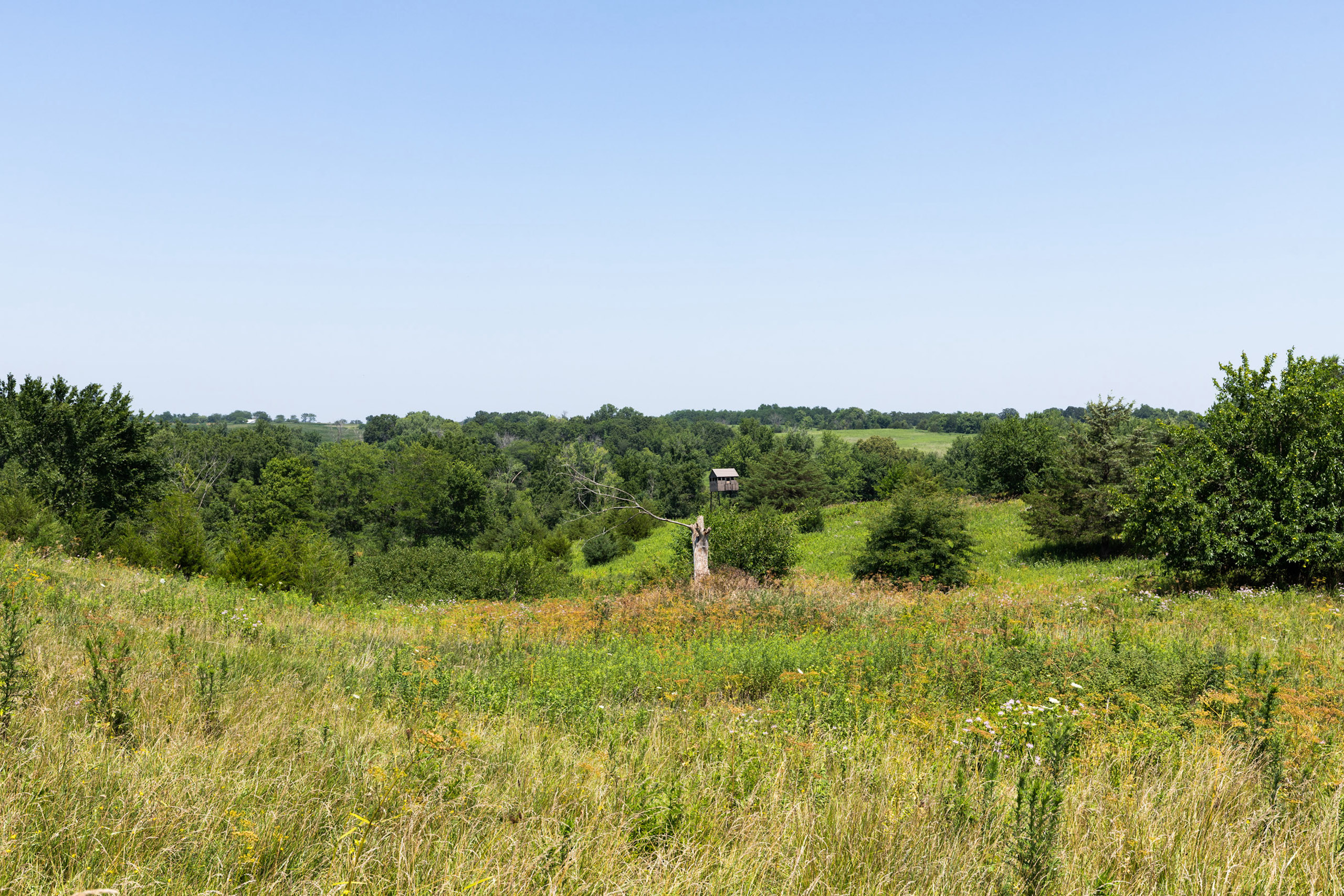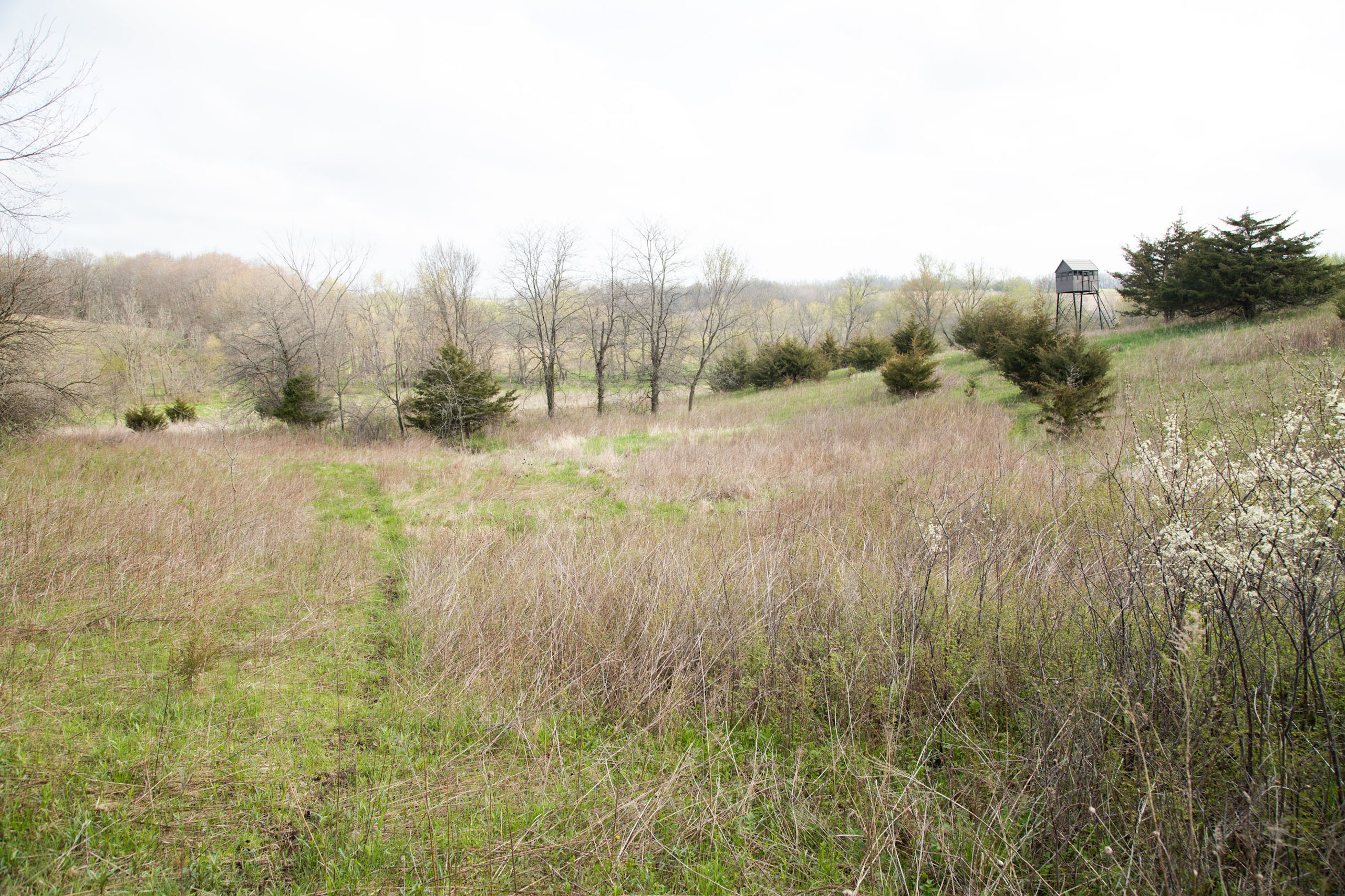A dead-end road leads you to the southwest corner gate of the property. Inside the entrance is a machine shed for storing equipment and a pond. This area would make a perfect place to build. To the east is approximately 12 tillable acres, which historically have been used as a giant food plot. The late-season hunting here is described as “tremendous”! To the east and southeast is a significant block of timber; to the north is a south-facing hillside of CRP native grasses and a thick east/west creek bottom.