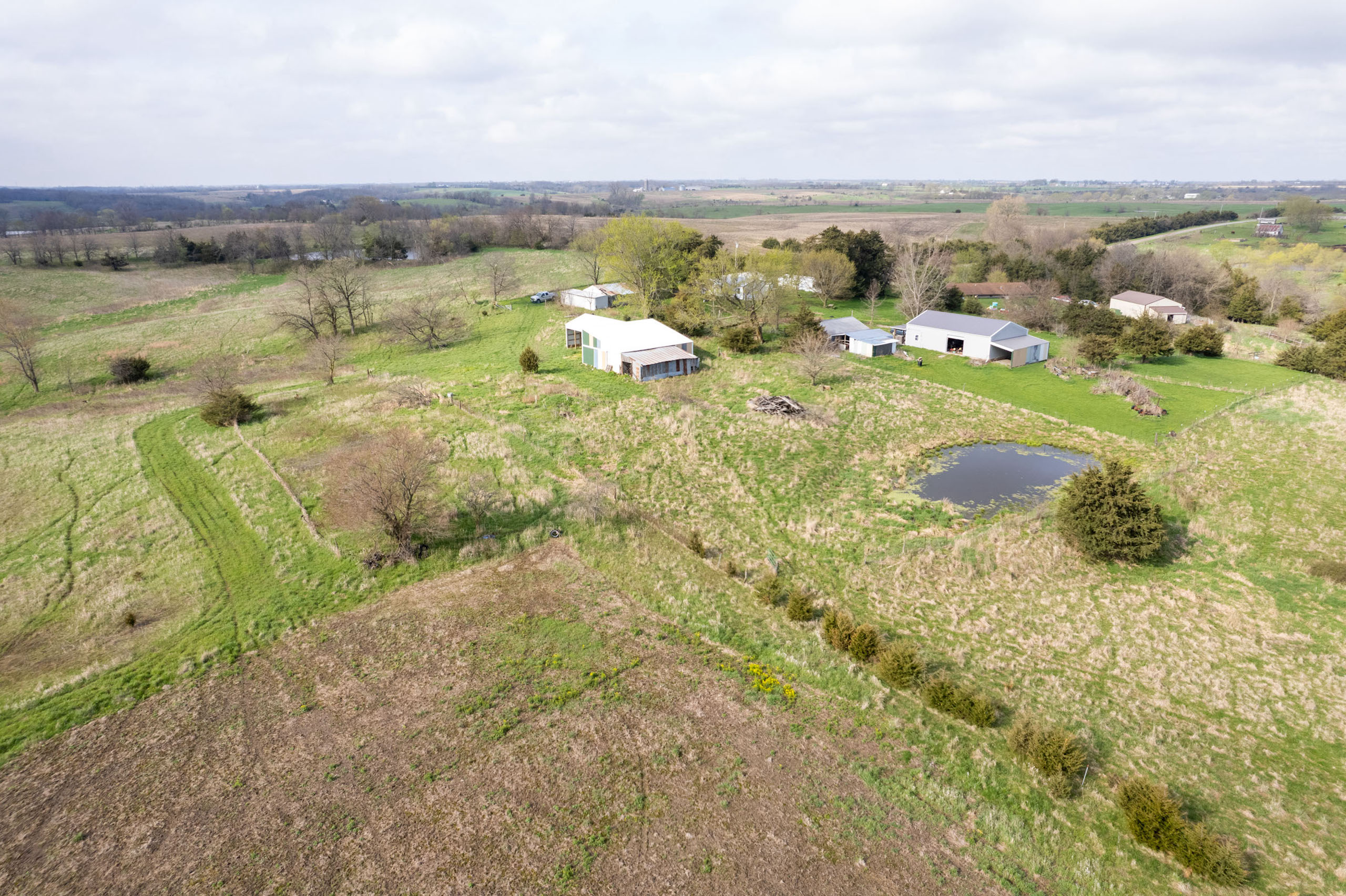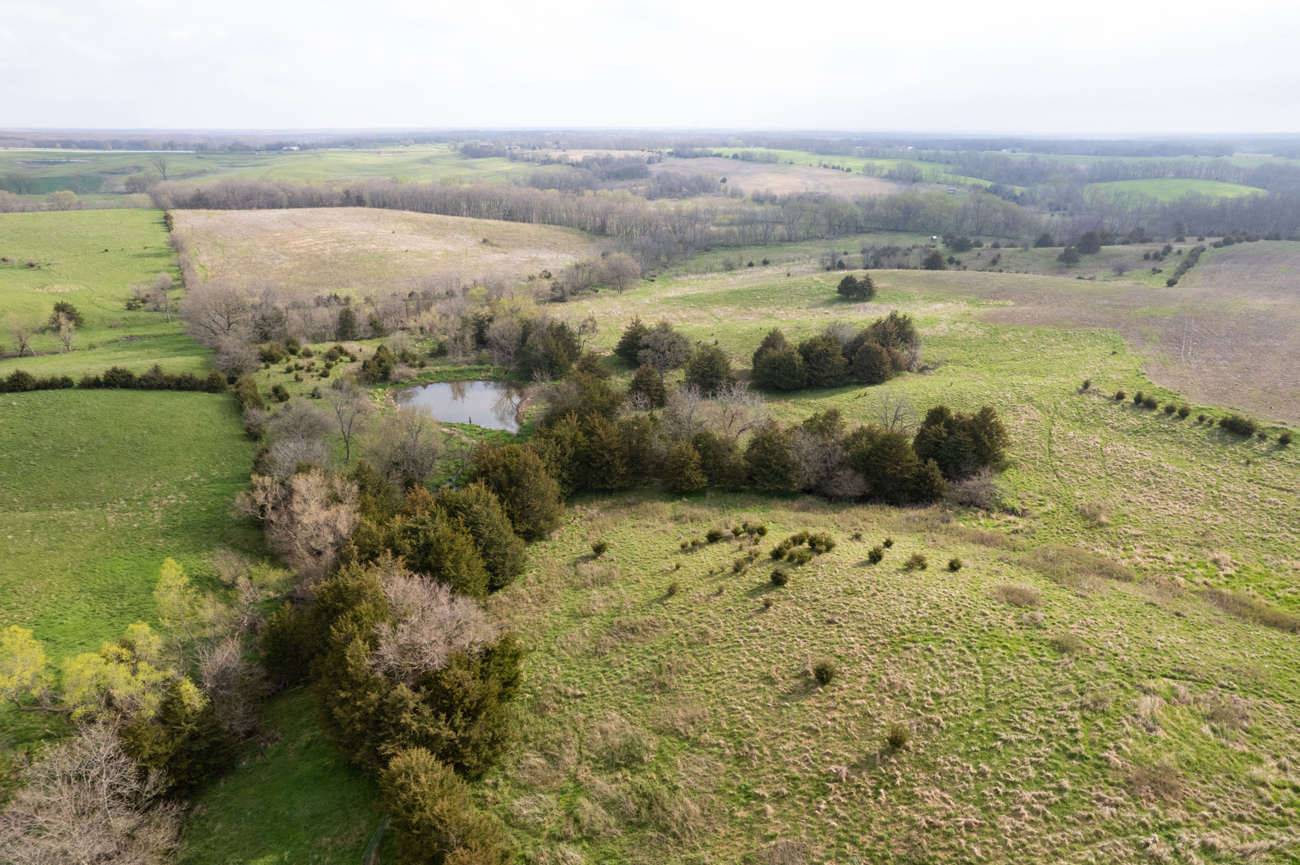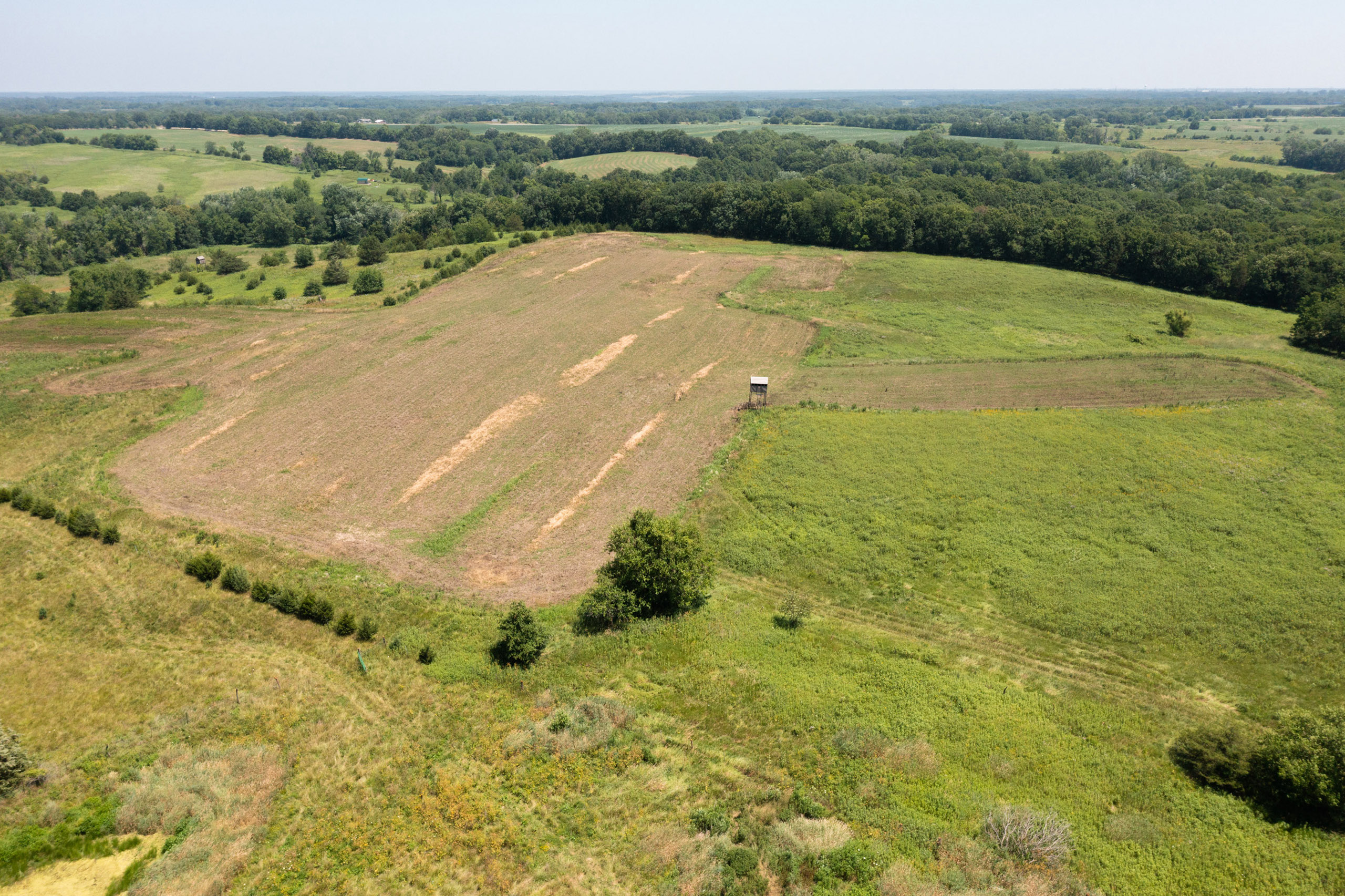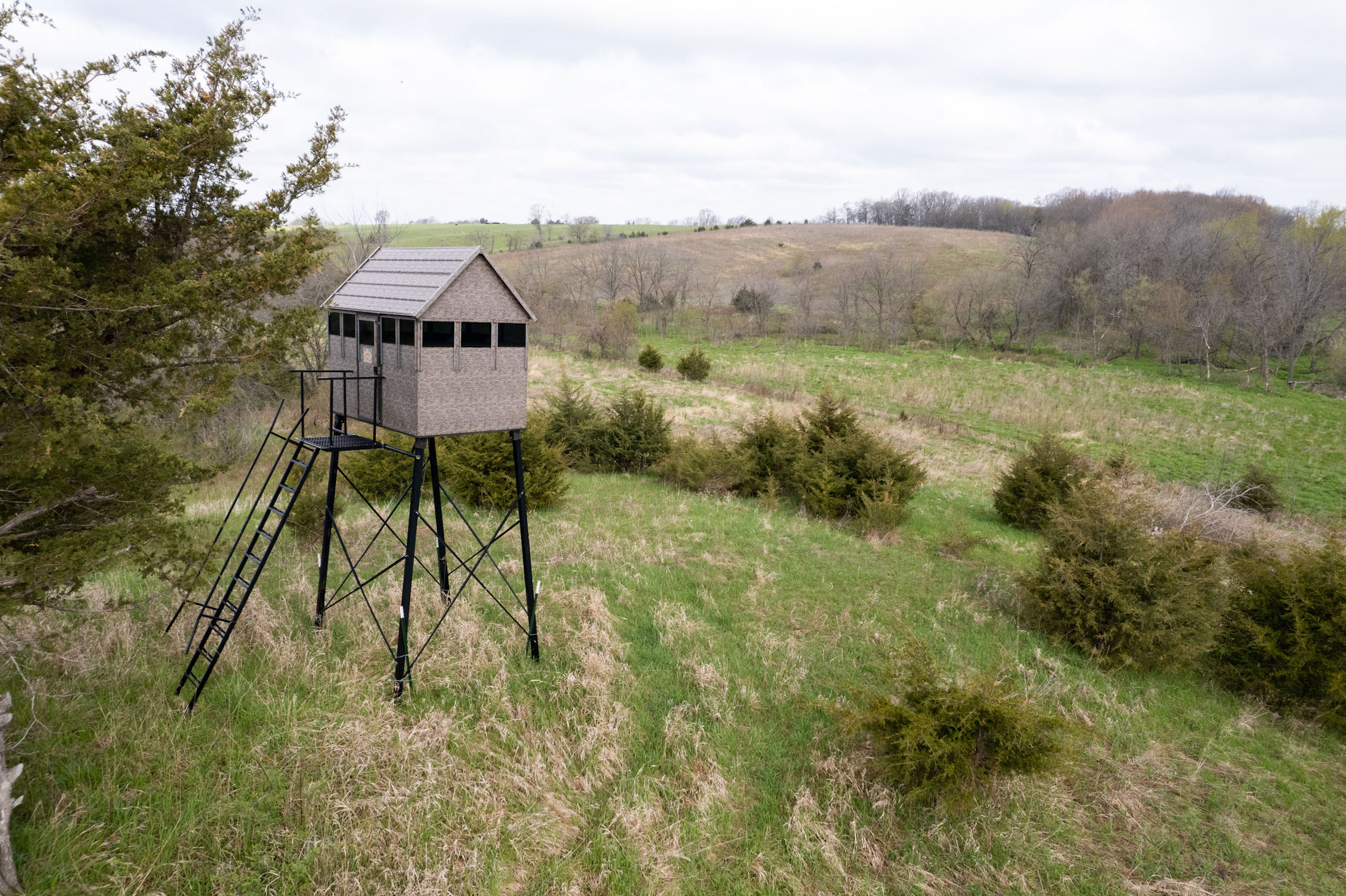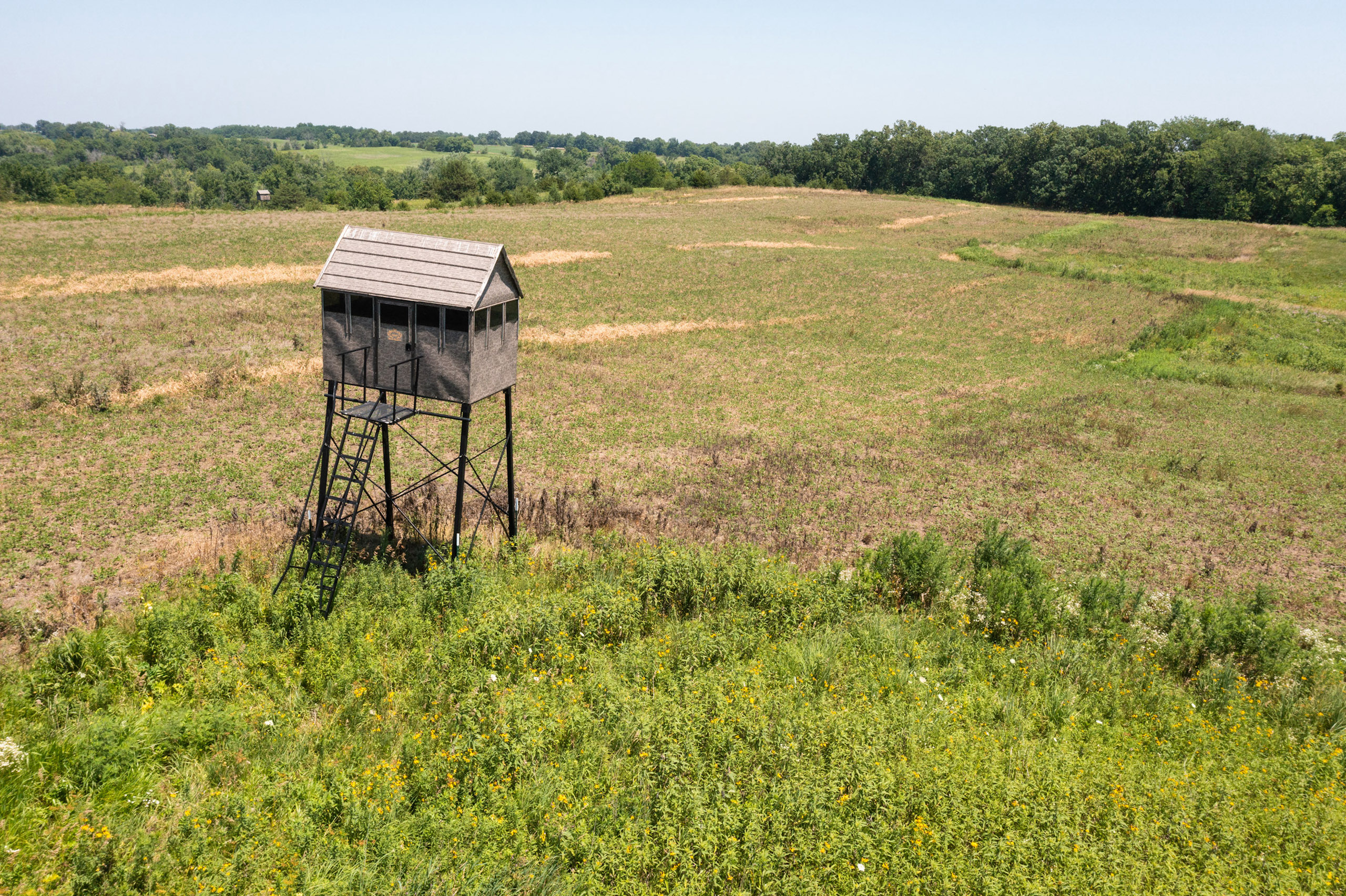 A dead-end road leads you to the southwest corner gate of the property. Inside the entrance is a machine shed for storing equipment and a pond. This area would make a perfect place to build. To the east is approximately 12 tillable acres, which historically have been used as a giant food plot. The late-season hunting here is described as “tremendous”! To the east and southeast is a significant block of timber; to the north is a south-facing hillside of CRP native grasses and a thick east/west creek bottom.