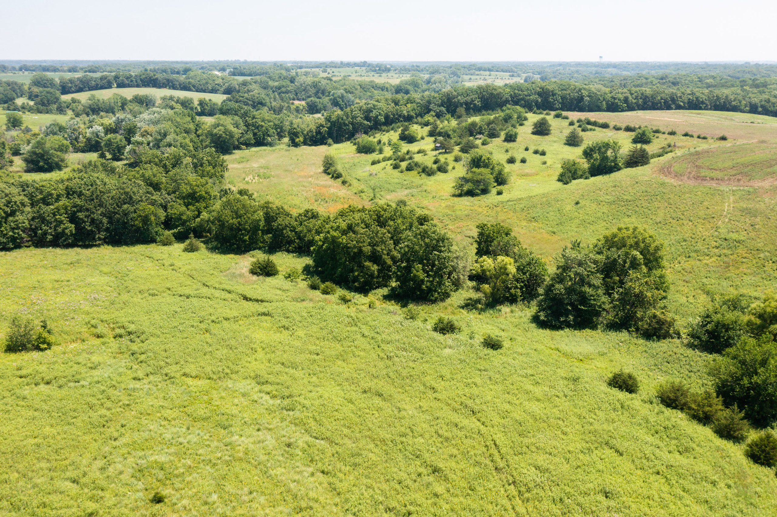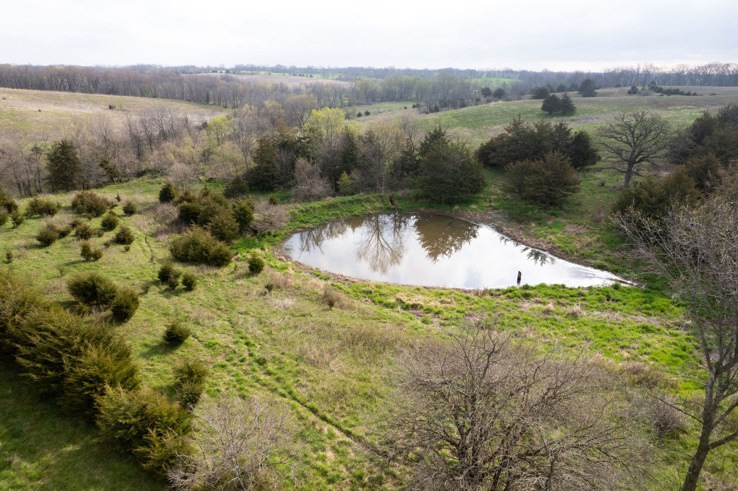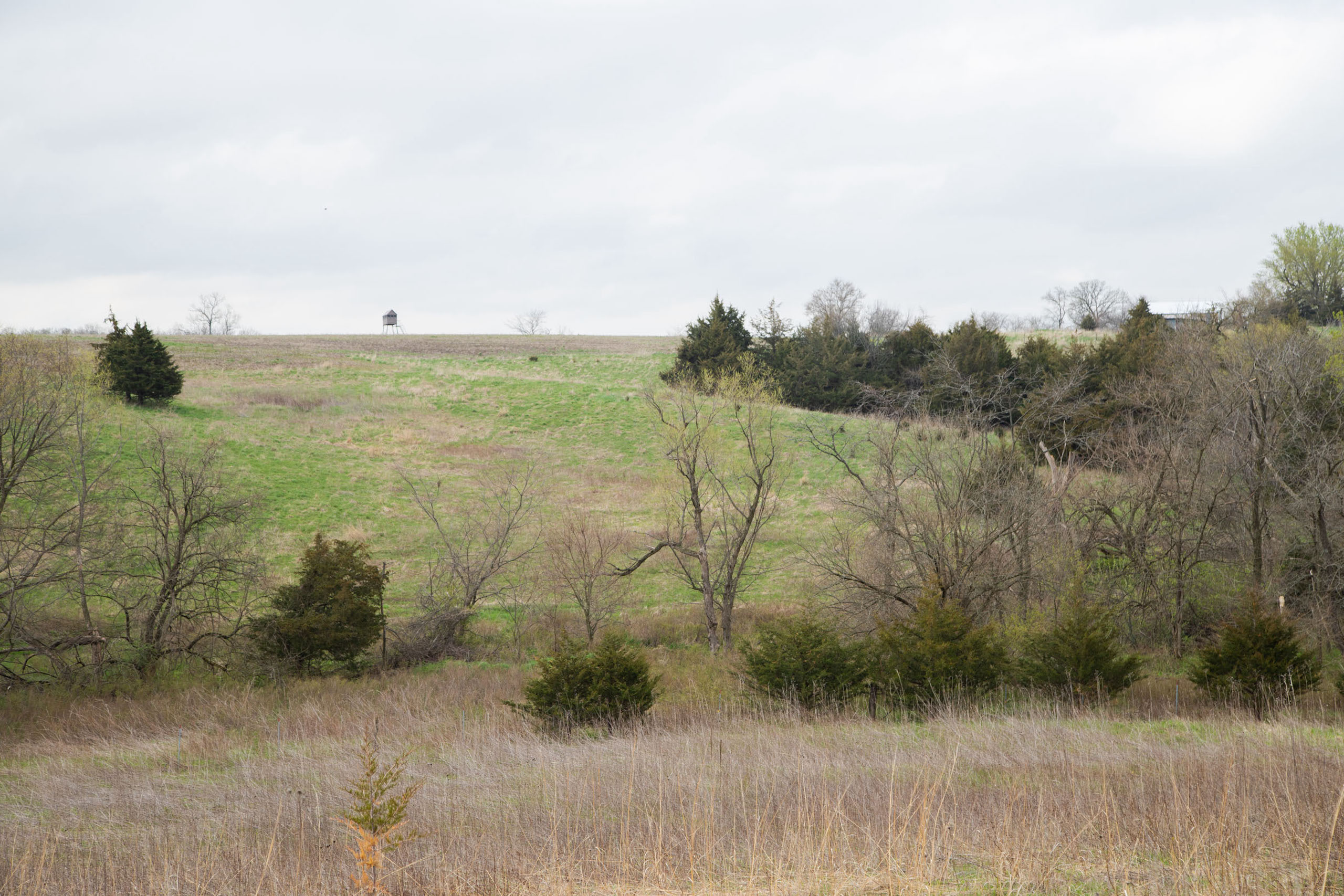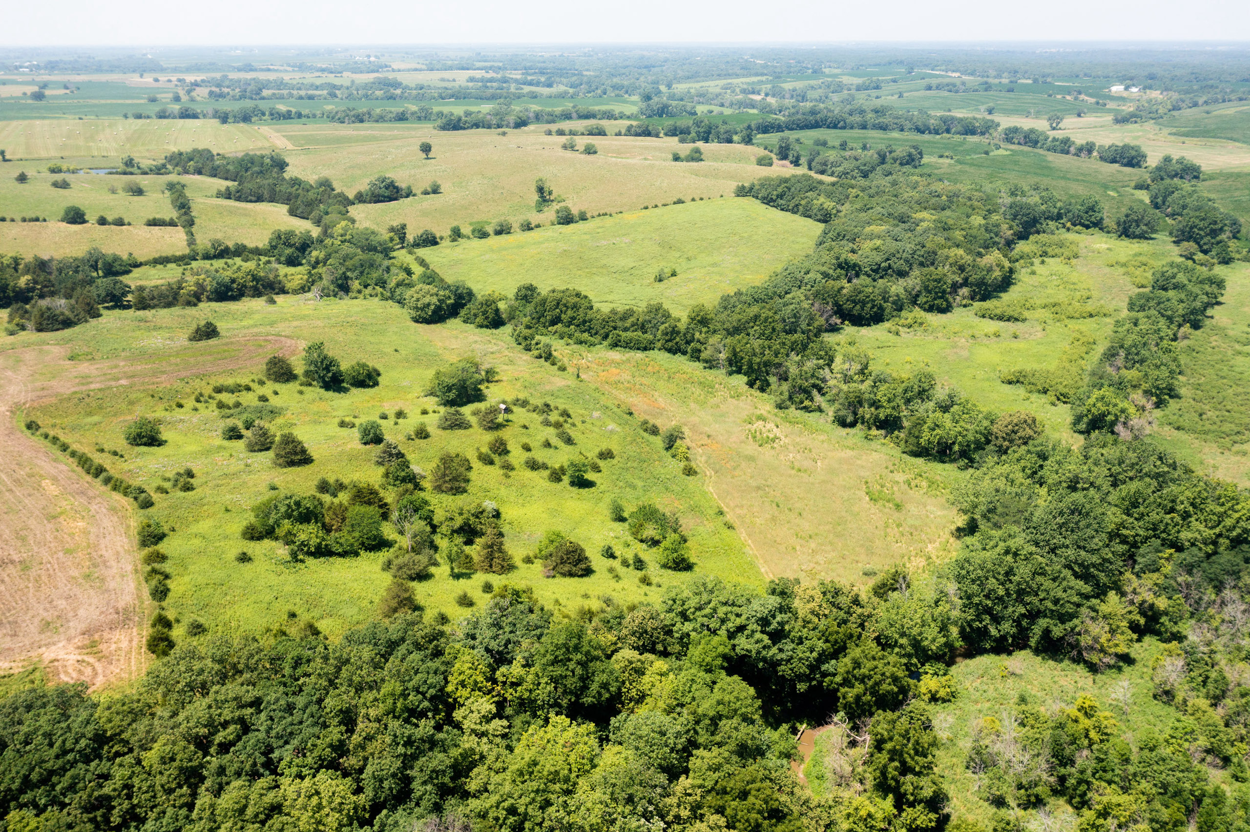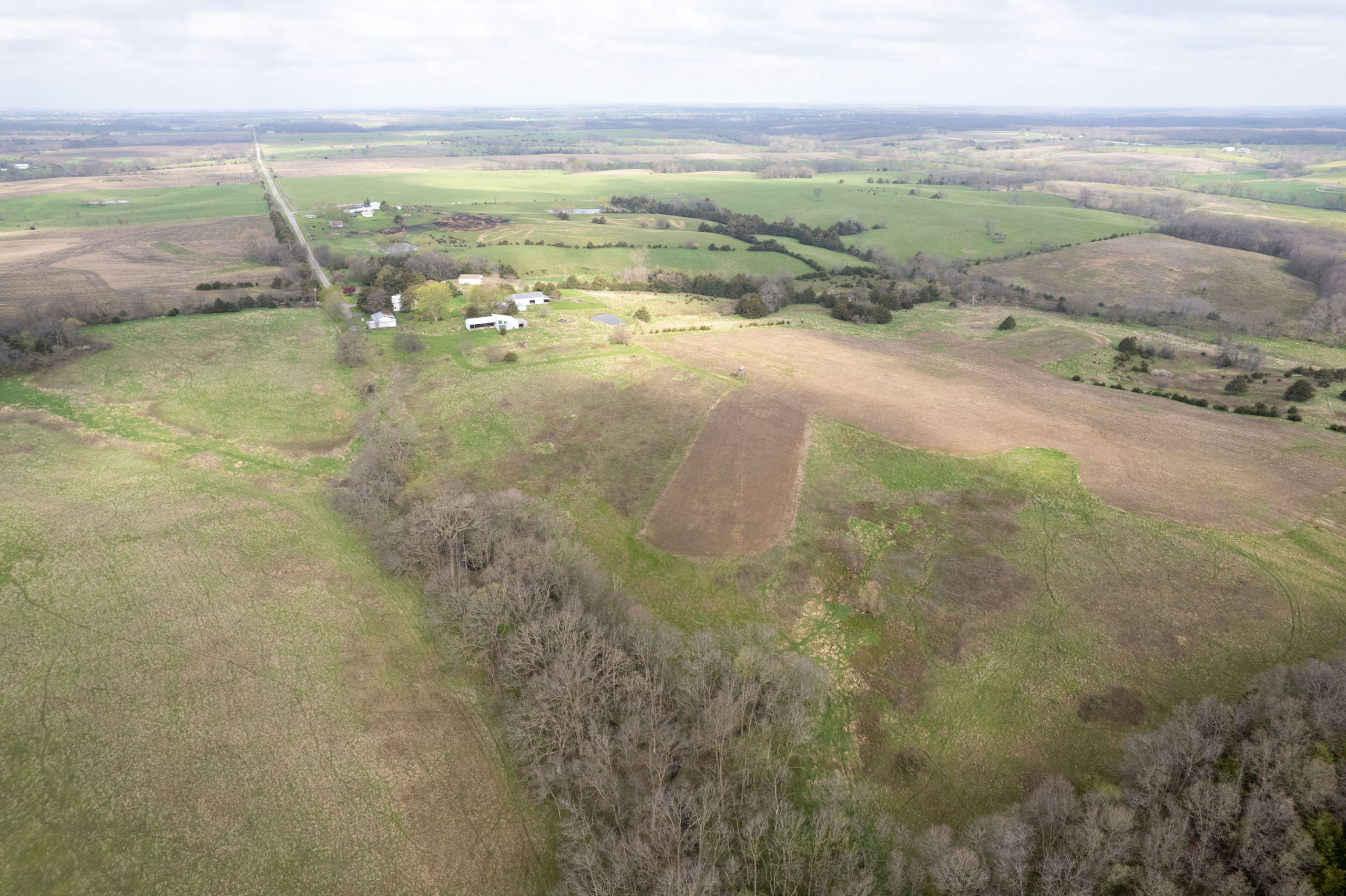 A dead-end road leads you to the southwest corner gate of the property. Inside the entrance is a machine shed for storing equipment and a pond. This area would make a perfect place to build. To the east is approximately 12 tillable acres, which historically have been used as a giant food plot. The late-season hunting here is described as “tremendous”! To the east and southeast is a significant block of timber; to the north is a south-facing hillside of CRP native grasses and a thick east/west creek bottom.