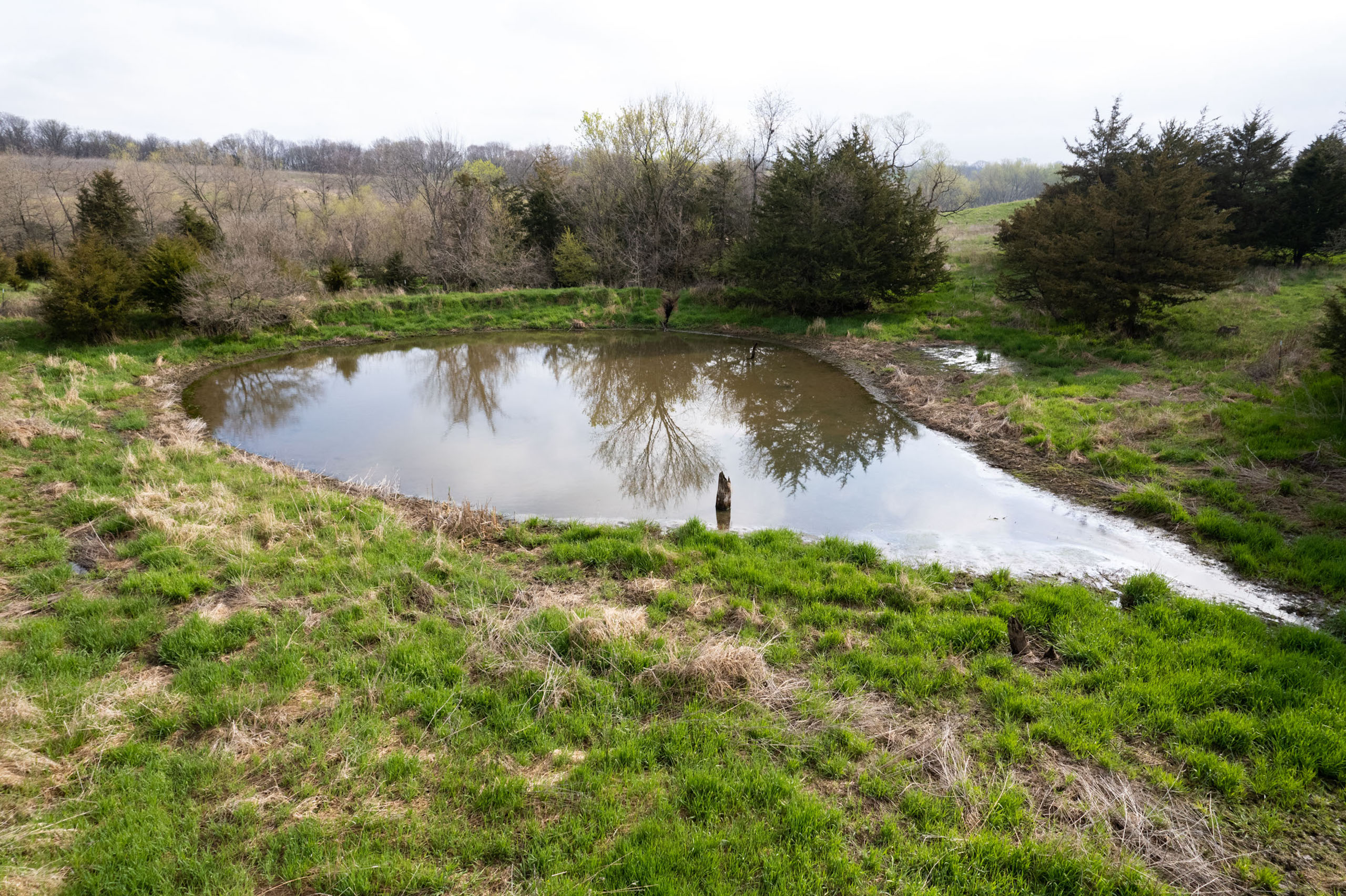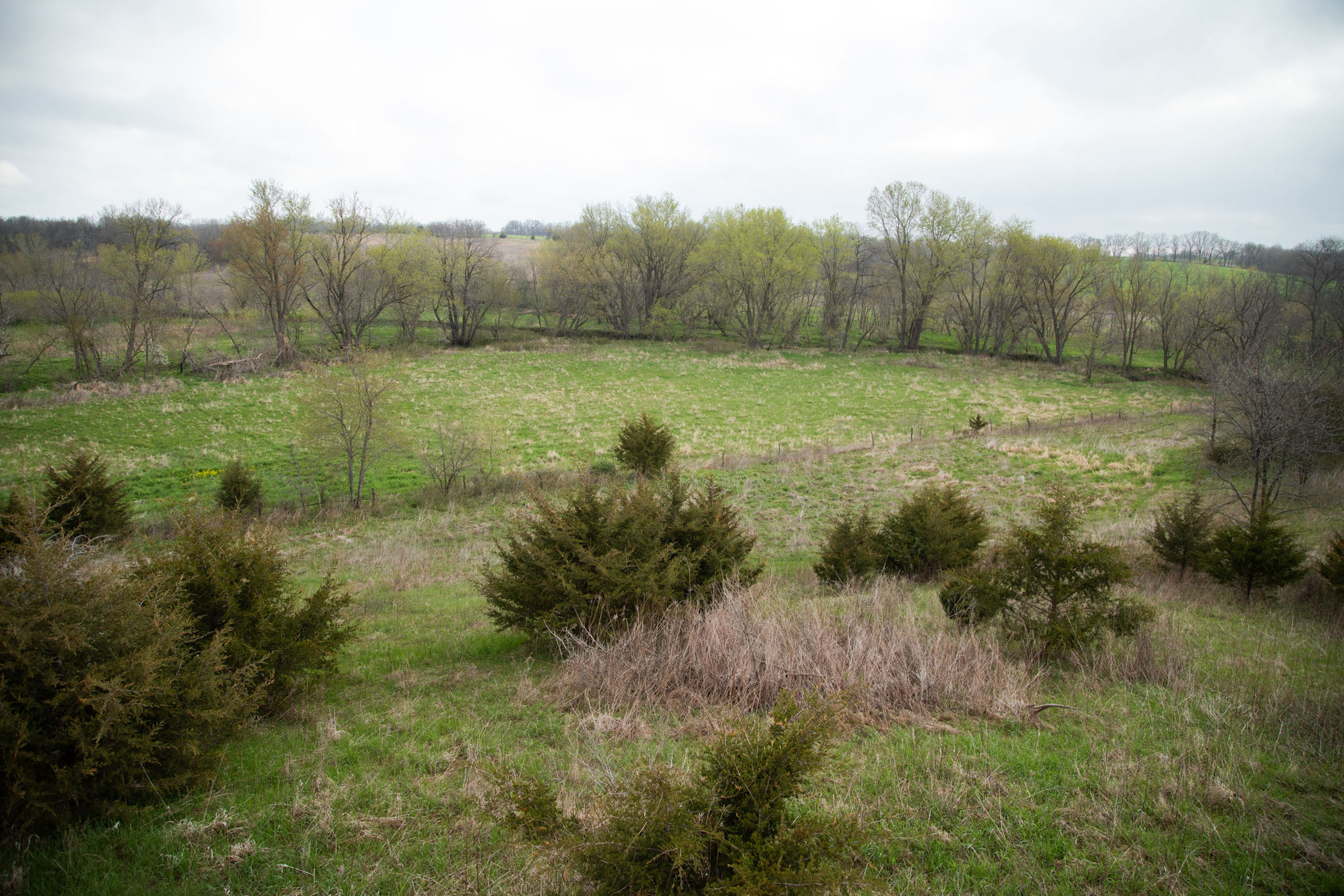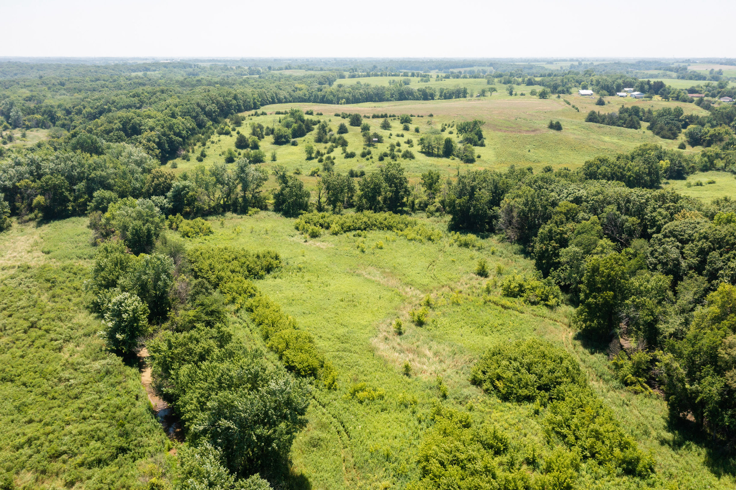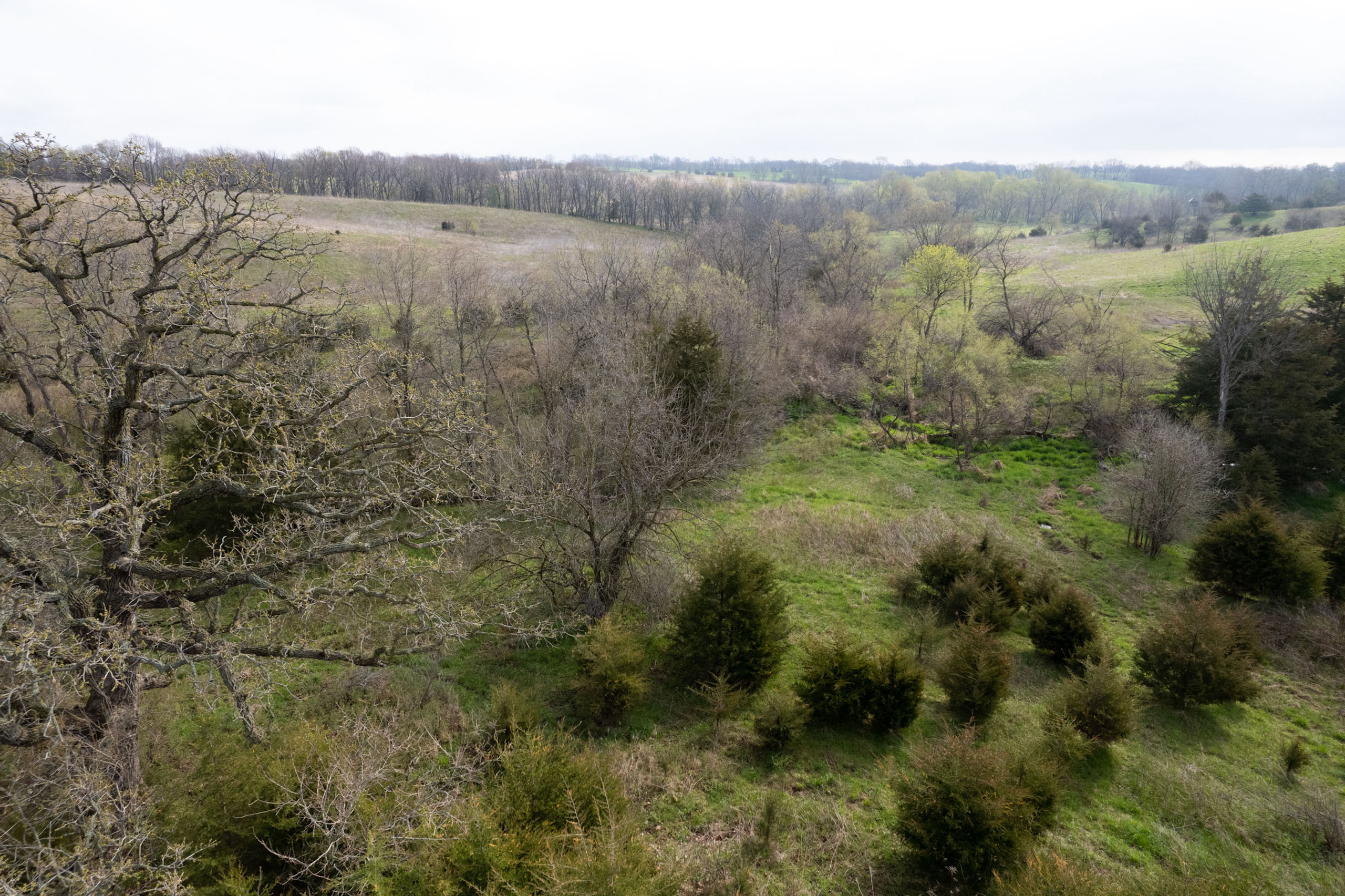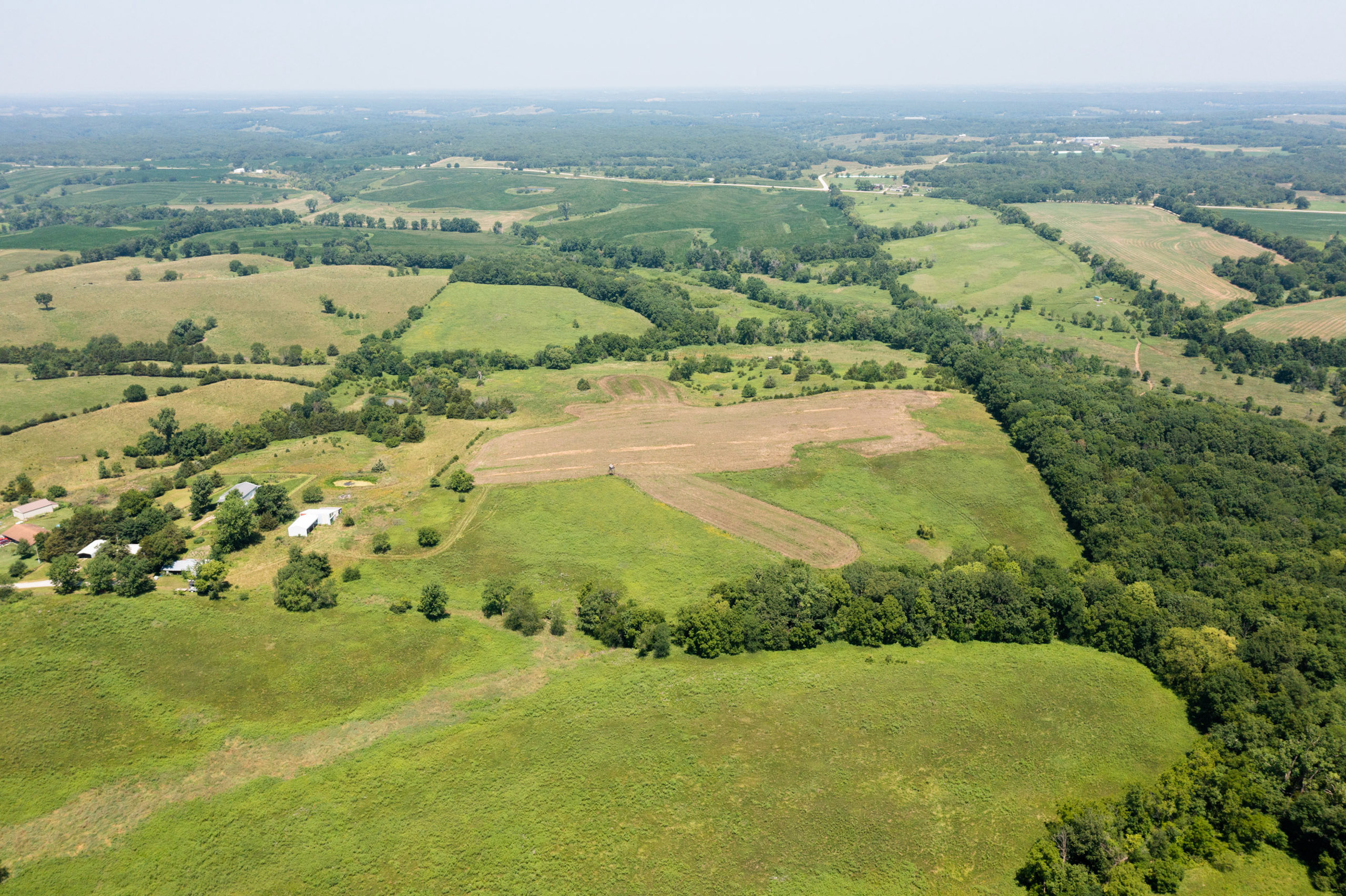 A dead-end road leads you to the southwest corner gate of the property. Inside the entrance is a machine shed for storing equipment and a pond. This area would make a perfect place to build. To the east is approximately 12 tillable acres, which historically have been used as a giant food plot. The late-season hunting here is described as “tremendous”! To the east and southeast is a significant block of timber; to the north is a south-facing hillside of CRP native grasses and a thick east/west creek bottom.