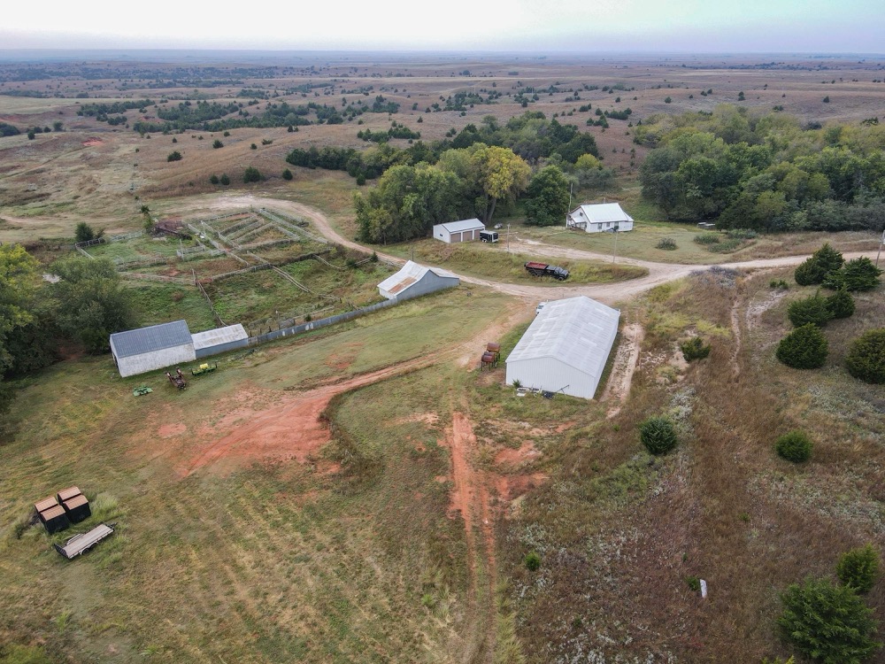 The property includes a comfortable ranch house with three bedrooms, spacious living areas, a kitchen, and two full bathrooms. Recent updates include new flooring and fixtures, making it suitable as a full-time residence, ranch manager’s home, or hunting headquarters. Additional infrastructure includes a large shop, barn, corrals, and a three-car detached garage, providing ample space for equipment and operations.