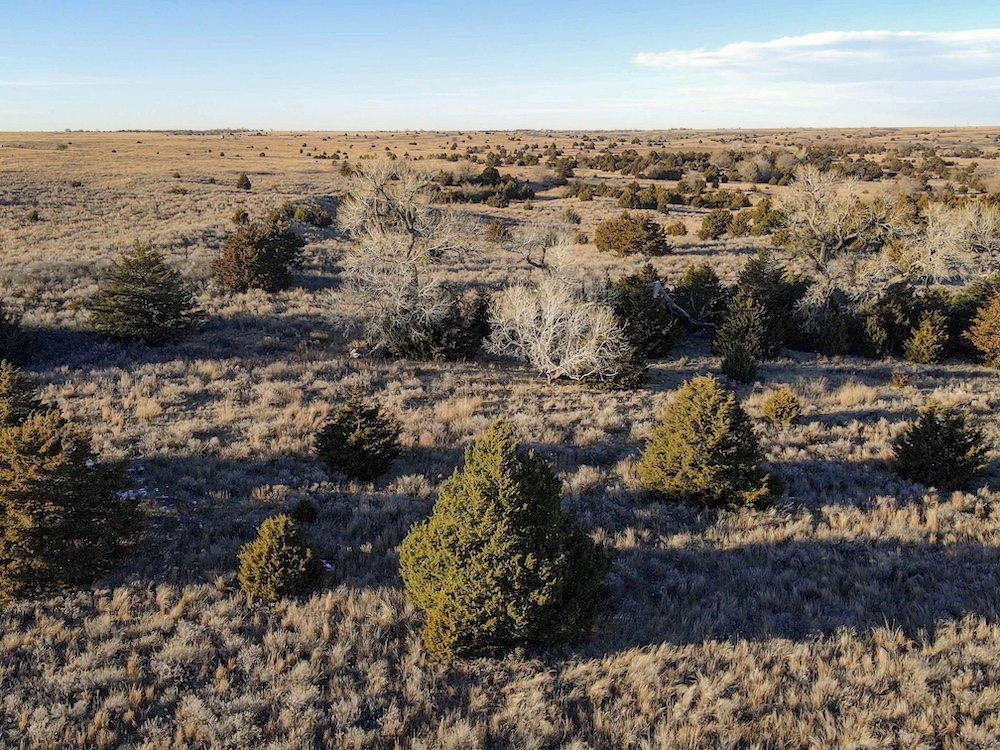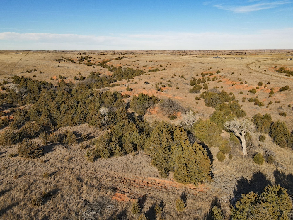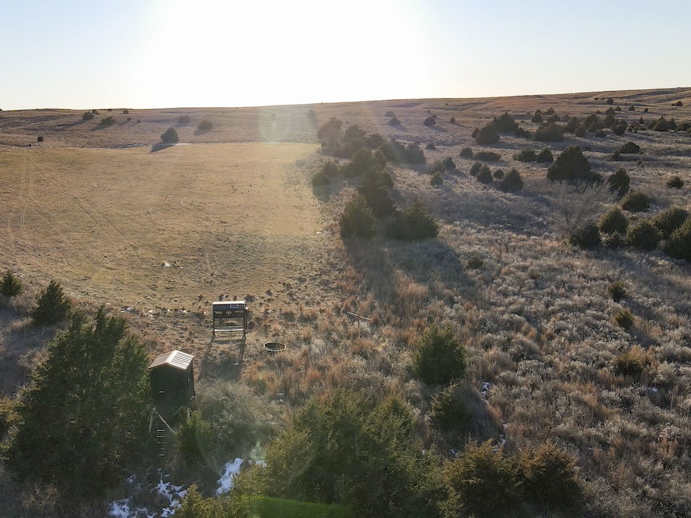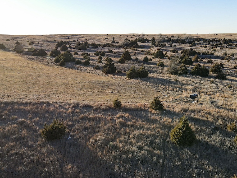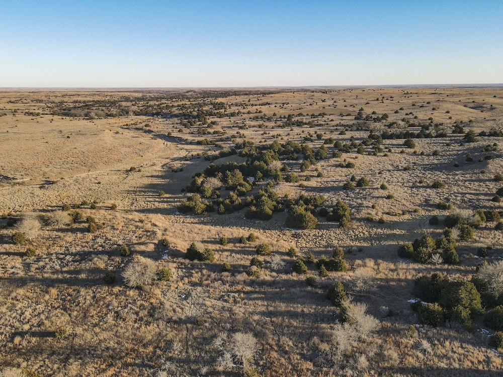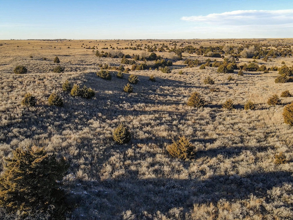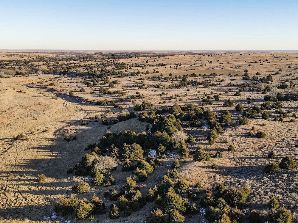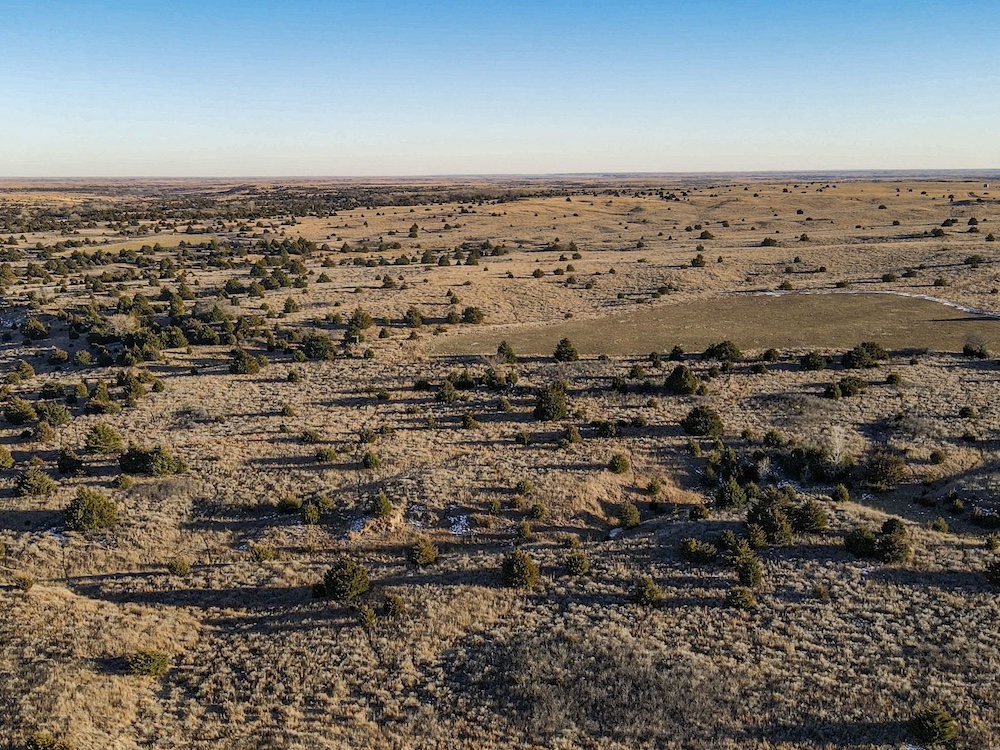 Indian Creek meanders through an expansive bottom in the NE corner of the property, adding an additional layer of natural beauty and wildlife habitat. The property also boasts grazing opportunities across its wide-open grasslands, which are dotted with cottonwoods, cedars, and sand plum thickets, providing cover and forage for a variety of species.