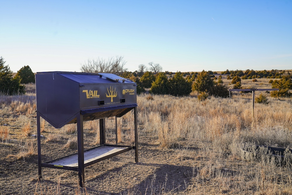 A well-placed blind overlooks the draw, paired with a high-capacity feeder, creating a versatile setup suited for both archery and rifle hunting. The layout offers room for expansion, with ample space to establish additional blinds and feeders. Convenient road frontage along the eastern boundary ensures easy access and supports wind-conscious hunting setups.