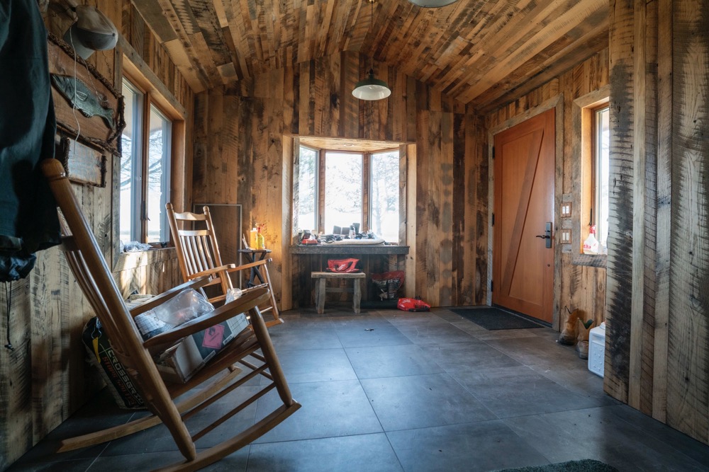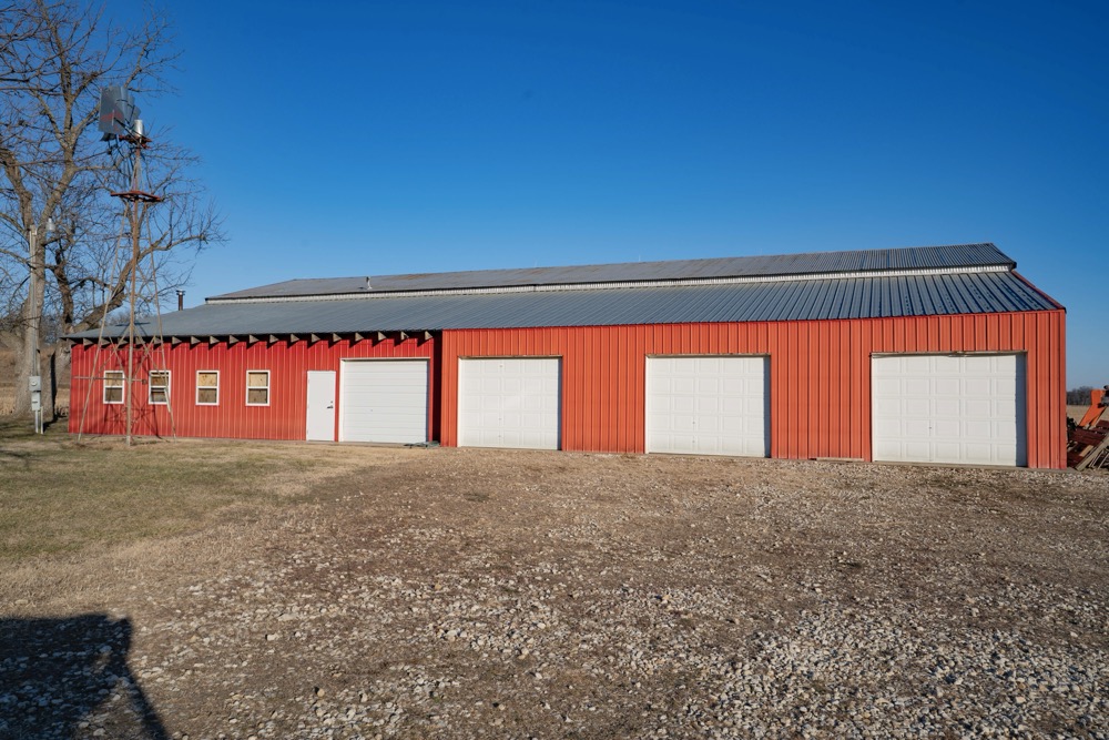 In addition to the cabin, a large shop building is present and provides covered storage for farm equipment, recreational vehicles, and hunting gear. This structure allows equipment to be stored out of the elements and supports both agricultural and recreational operations.