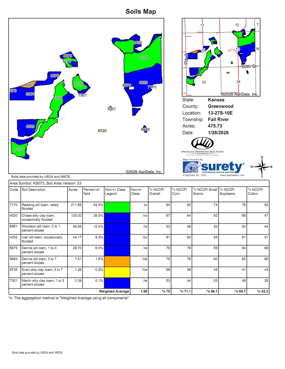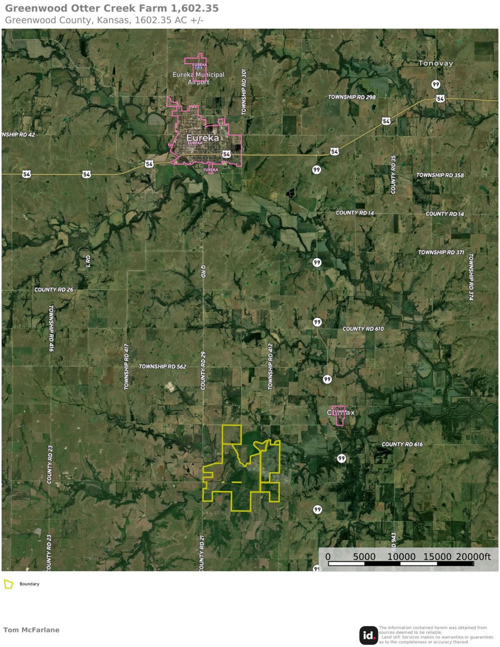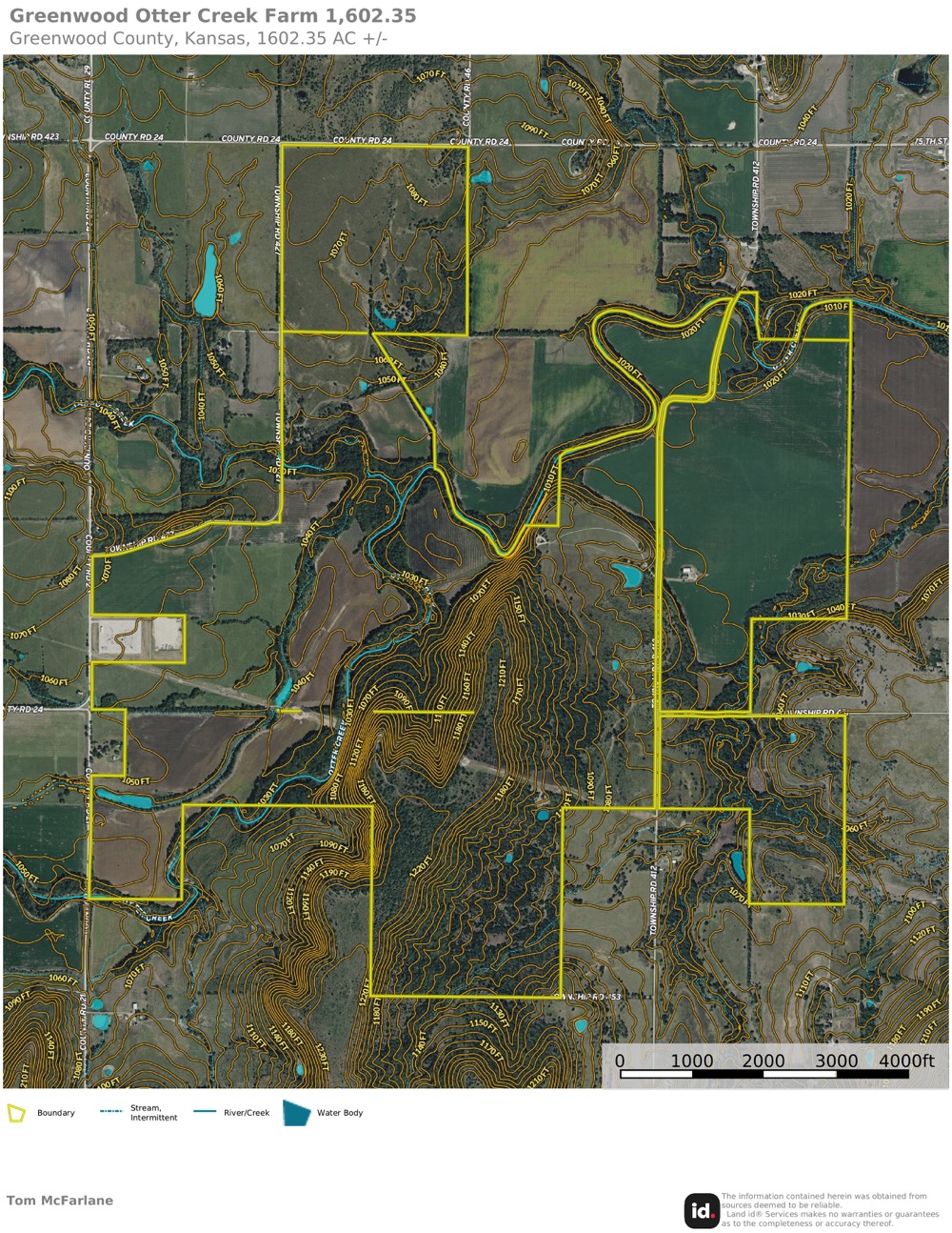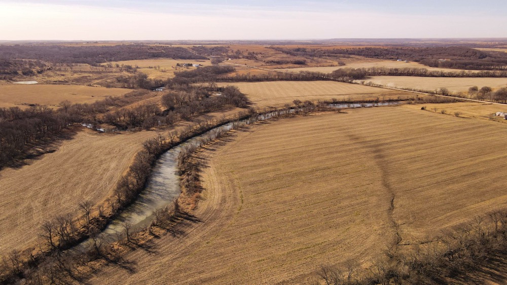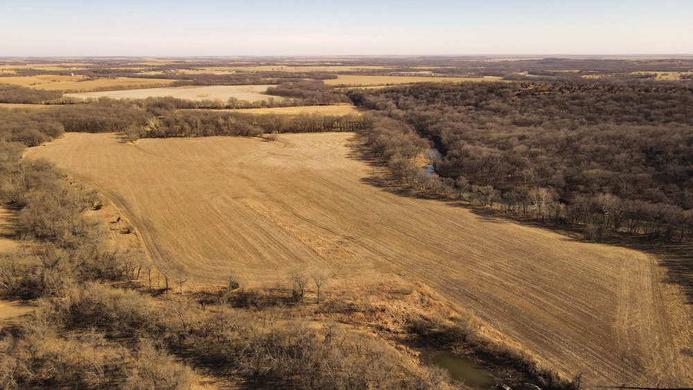 Otter Creek Farms consists of approximately 1,602.35 acres located in Greenwood County, Kansas, near the community of Severy. The property offers a diverse mix of land types that support agricultural use, recreational opportunities, and wildlife habitat. The acreage includes bottomland tillable fields, timbered creek corridors, upland grassland, and multiple water sources, providing a balanced and functional landscape.