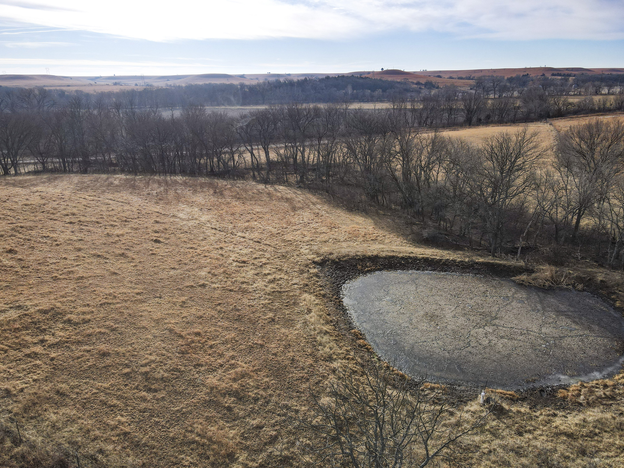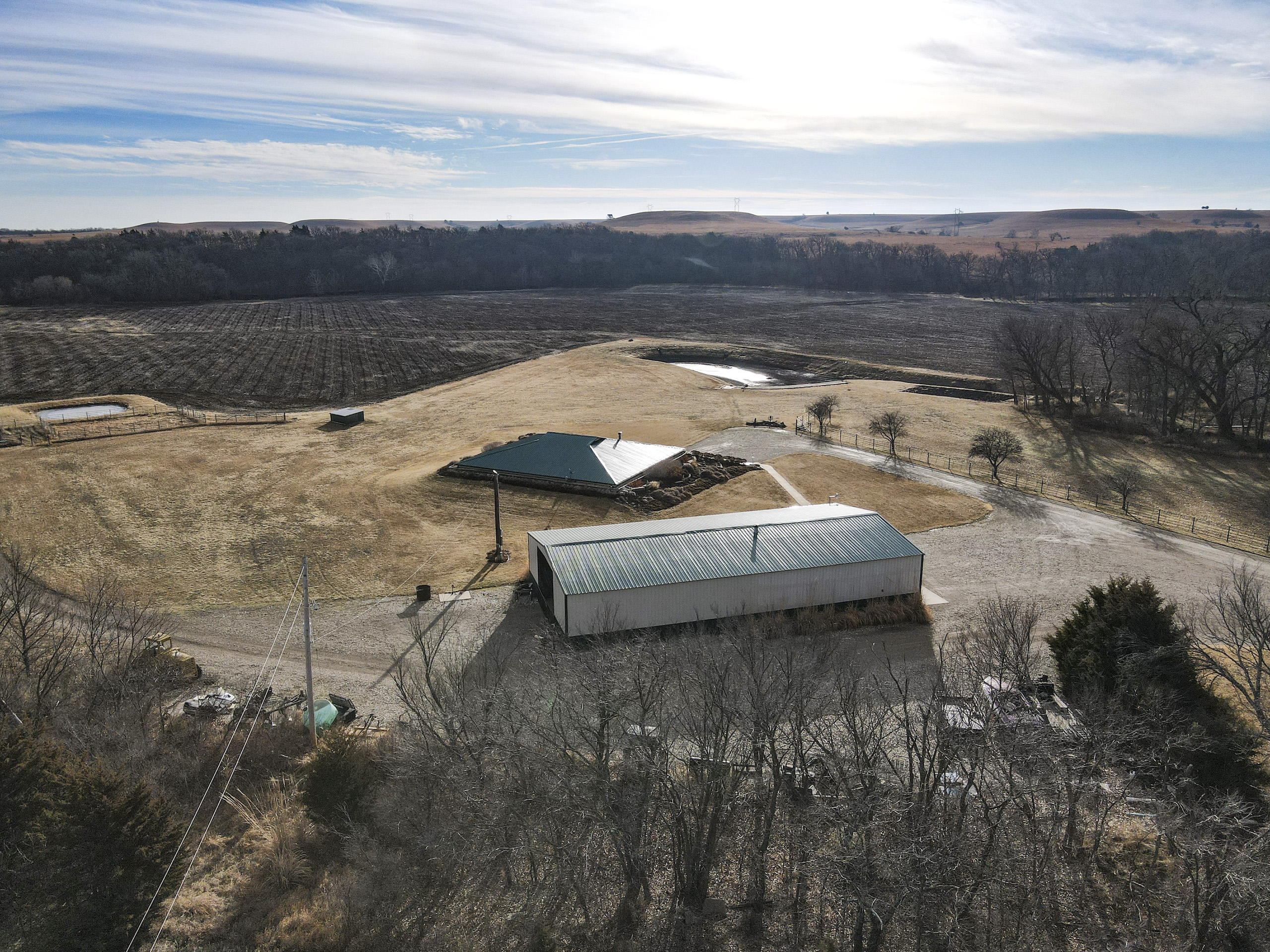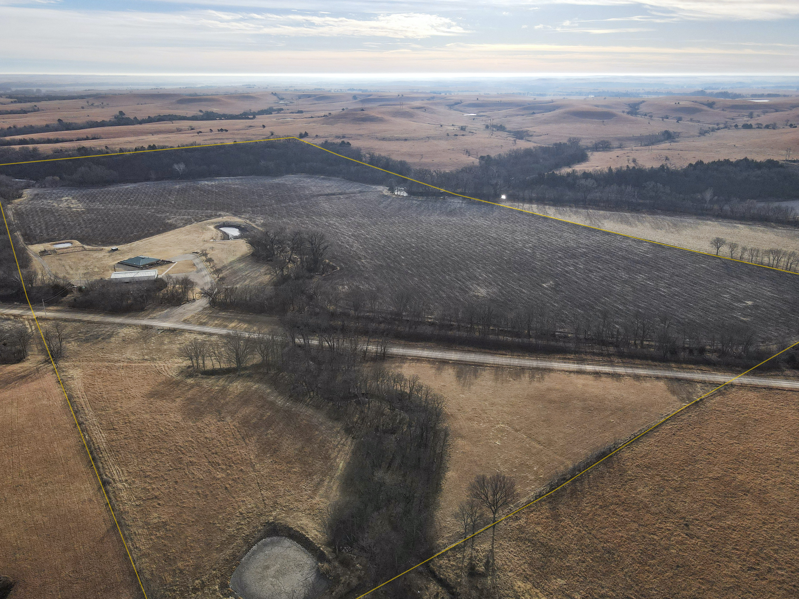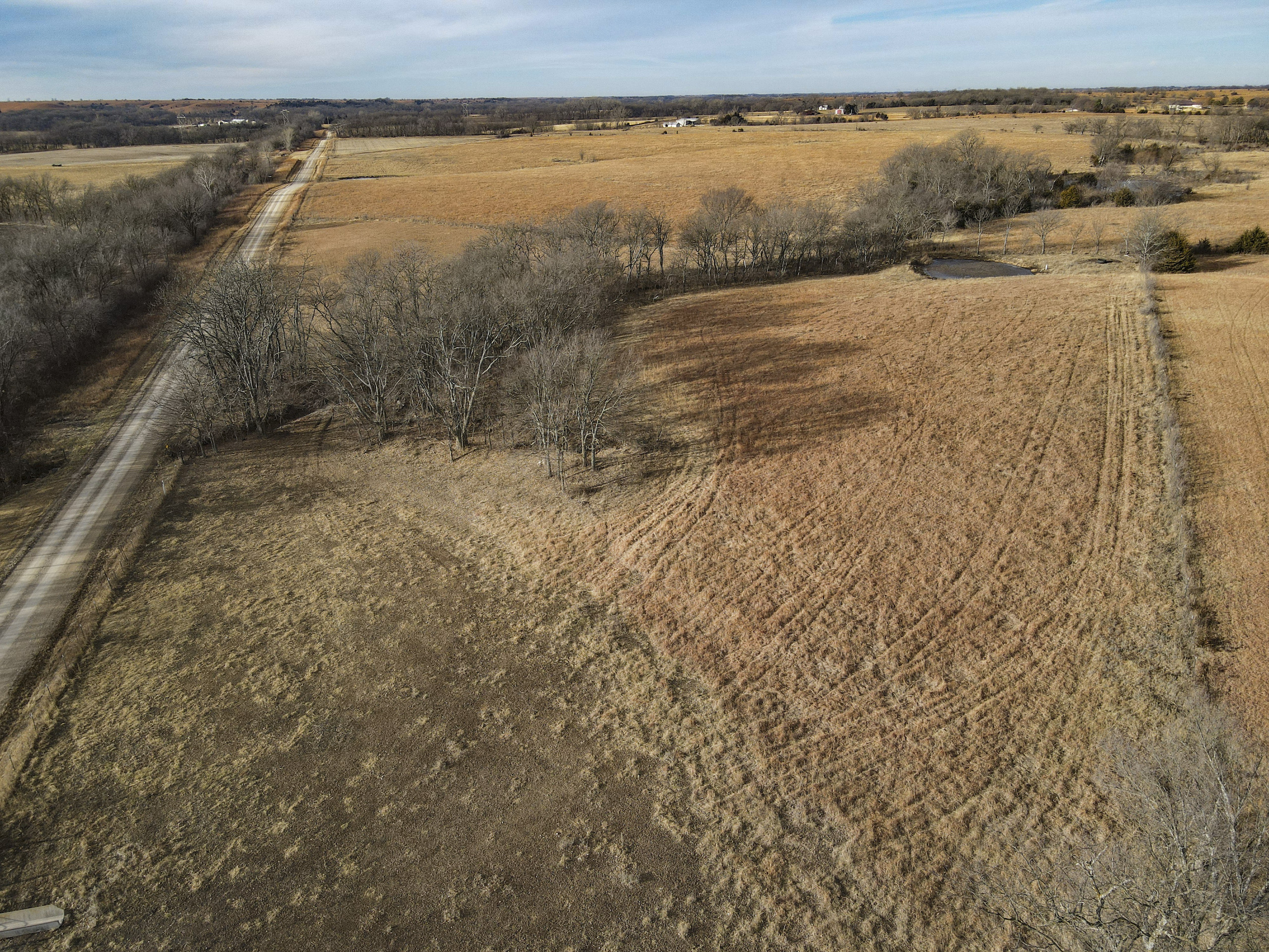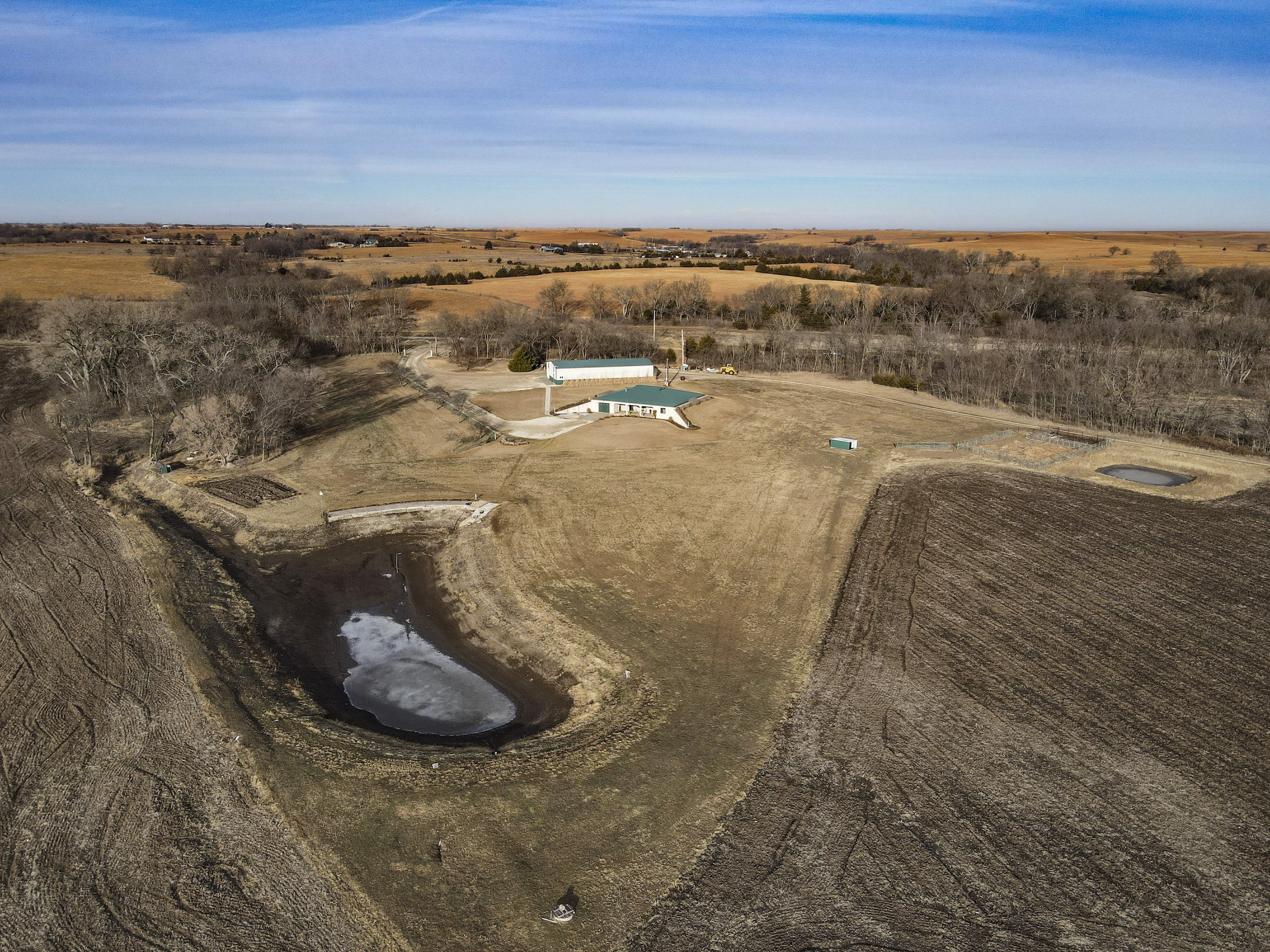 A set of corrals on the farmstead and a small native pasture west of the house provide accommodation for livestock. A pond and a well in the pasture provide an adequate water source, and the barbed wire perimeter fence is in good condition.