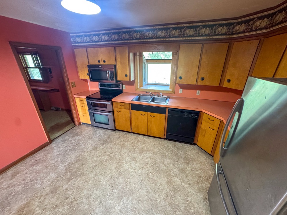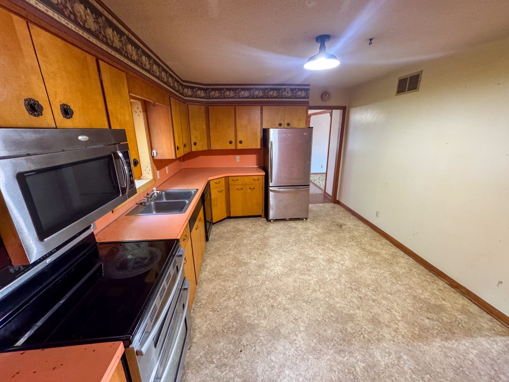 ● Main Floor Kitchen: Large main floor kitchen features vinyl flooring and countertops, as well as plentiful cabinet space, stainless steel refrigerator, oven/stove, and microwave