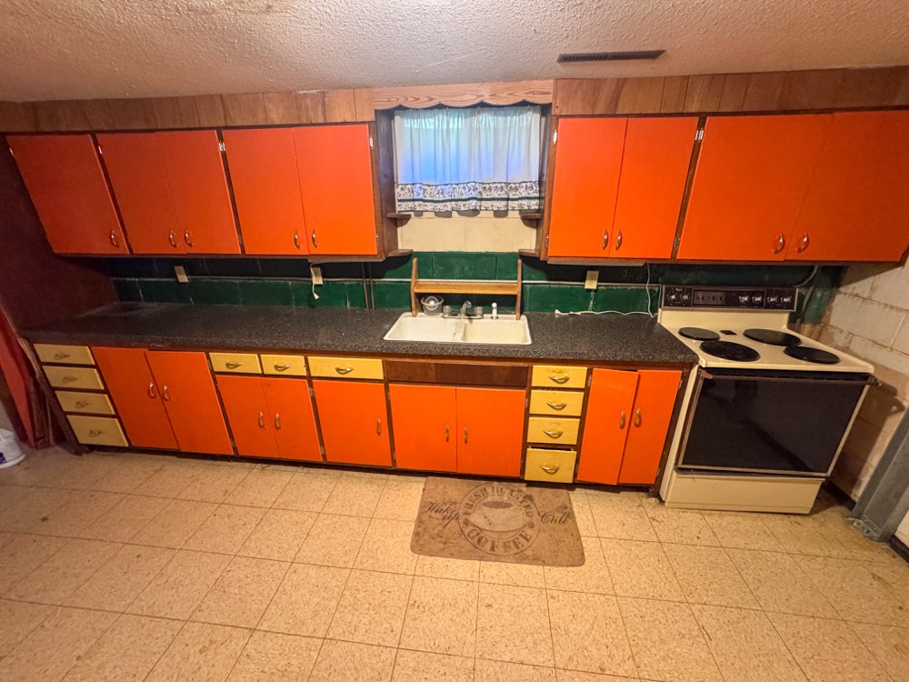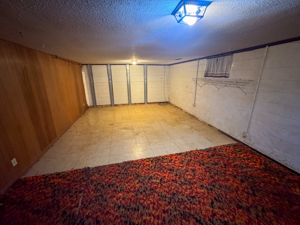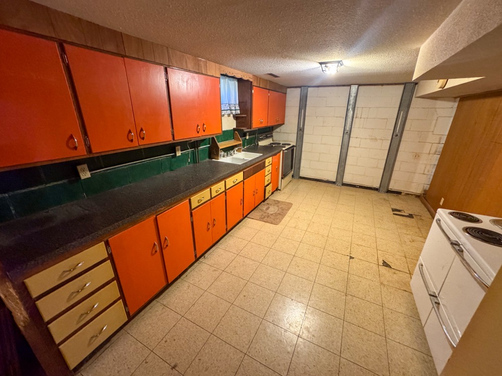 The main floor living room is inviting and perfect for entertaining or relaxing with family and friends. The kitchen is generously sized, featuring vinyl flooring and countertops, plentiful cabinetry, and stainless steel appliances, including a refrigerator, oven/stove, and microwave. Adjacent to the kitchen is a washroom equipped with washer and dryer hookups, cabinet and counter space, and a sink for added practicality. The basement adds another living dimension with its own kitchen, large living room space, utility room, and a separate stairway for exterior access, offering possibilities for extended family or rental income.