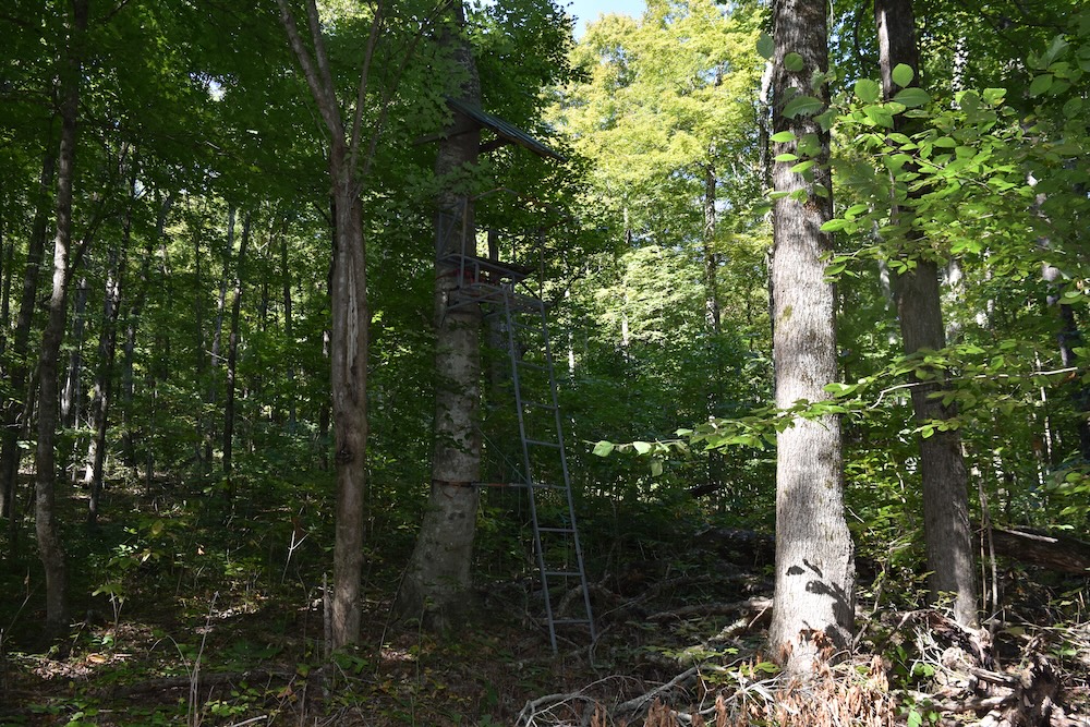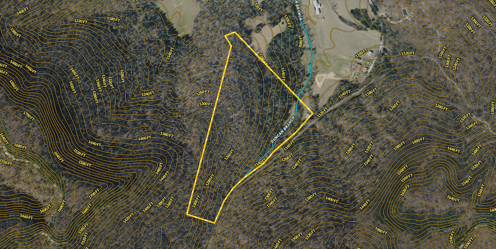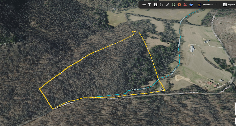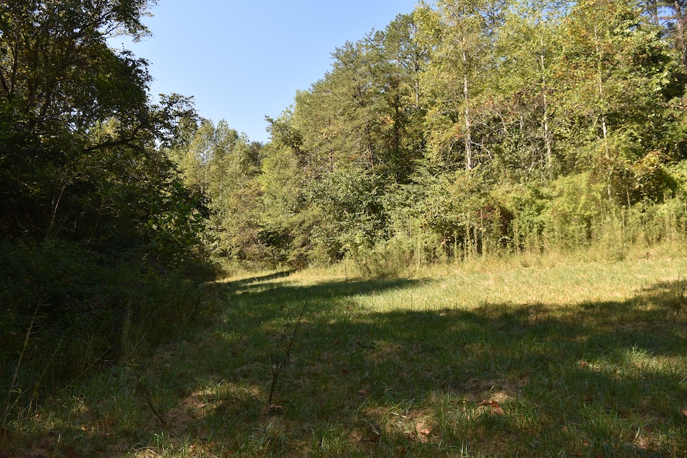 The terrain features a combination of wooded areas and clear ground, with roughly two acres of open space that could be used for food plots or camping. An intermittent stream runs through the property, adding a tranquil water feature to the landscape.