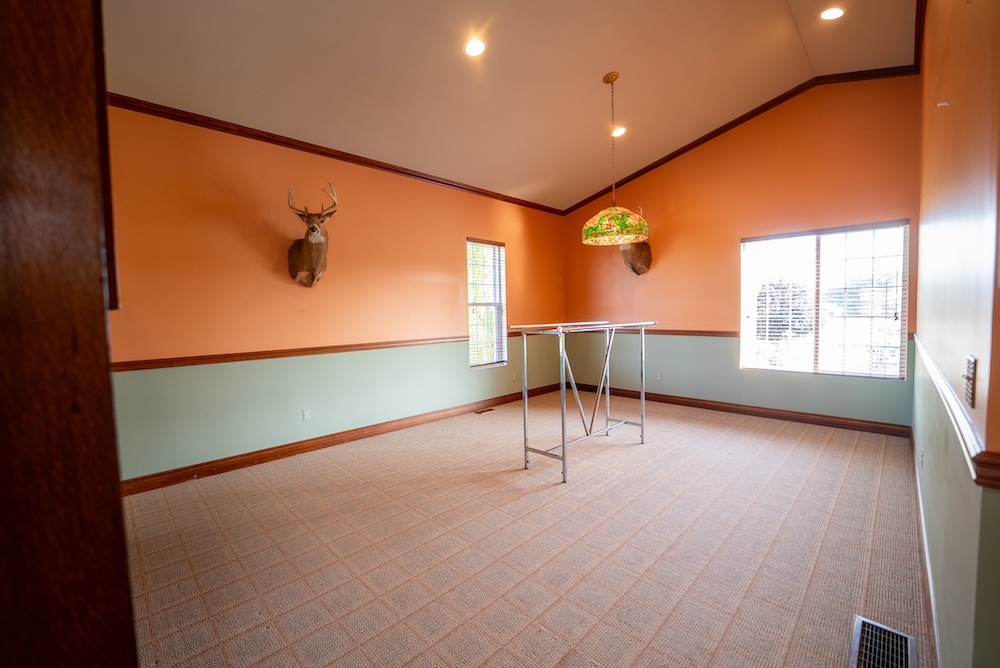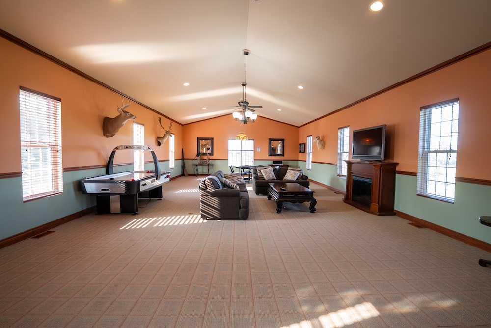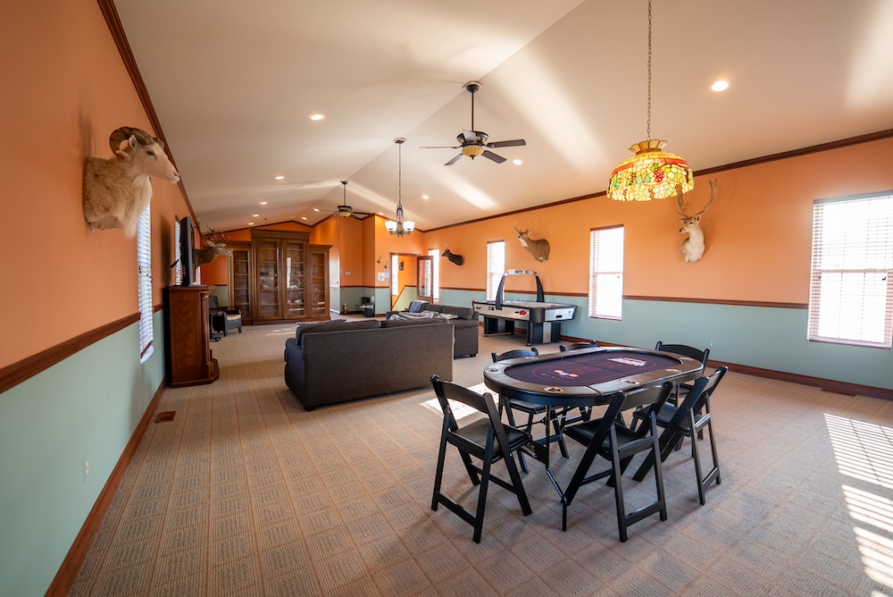 A four-car garage completes the home’s versatile footprint, with a finished bonus room above currently serving as groomsmen’s quarters. Additional touches include a chicken coop for fresh eggs and a large pond that reflects the colors of Michigan’s changing seasons. Together, these features make the residence both a private retreat and an entertainment showpiece.