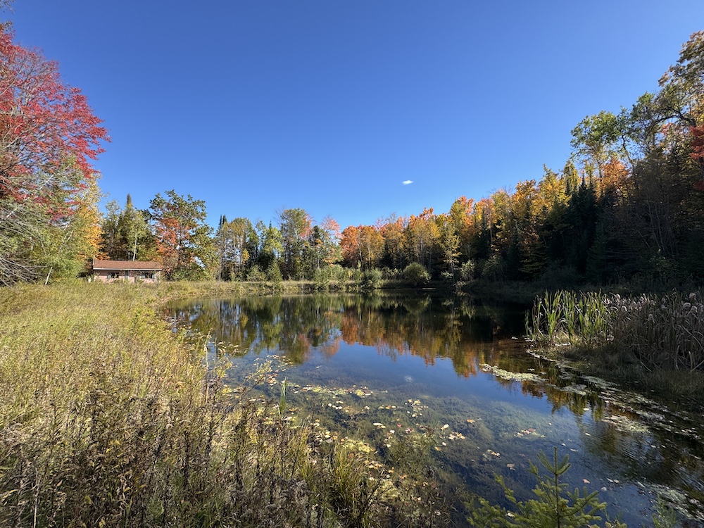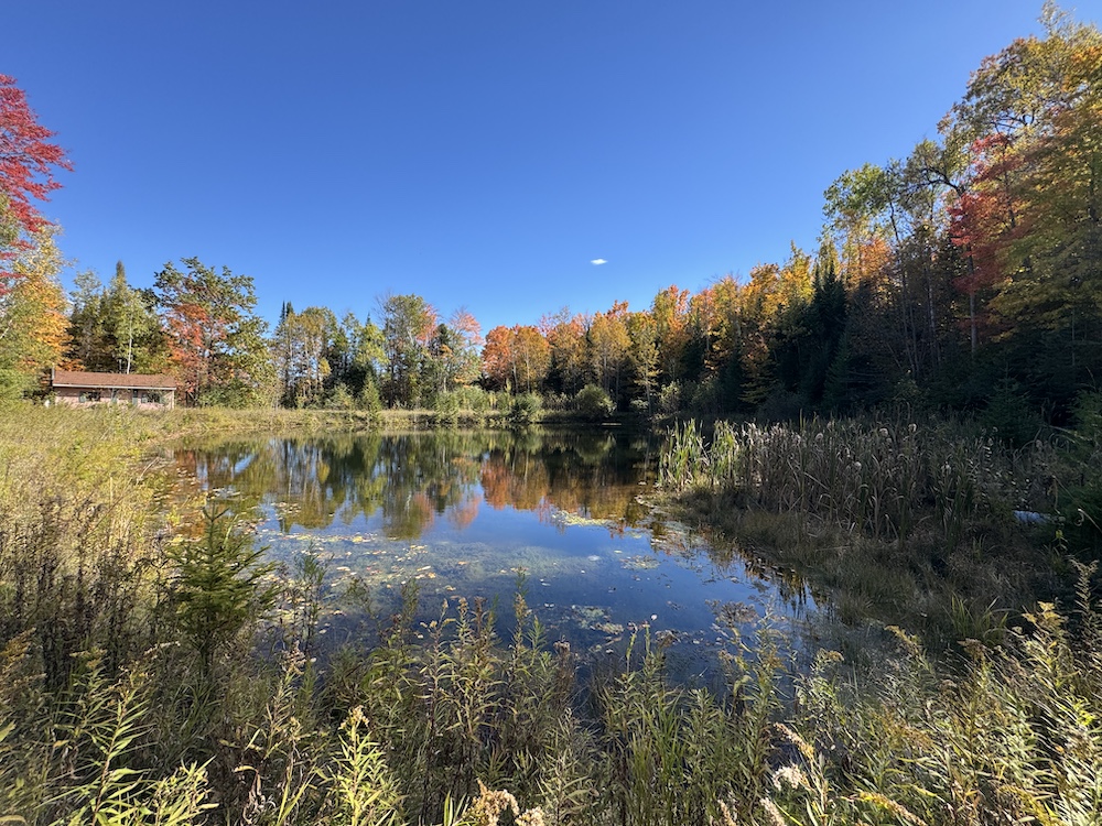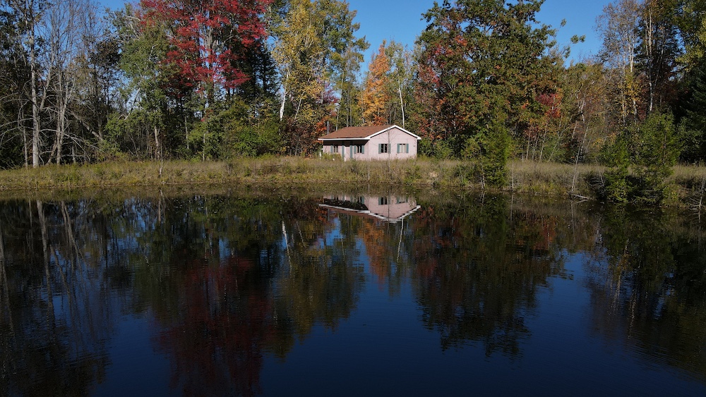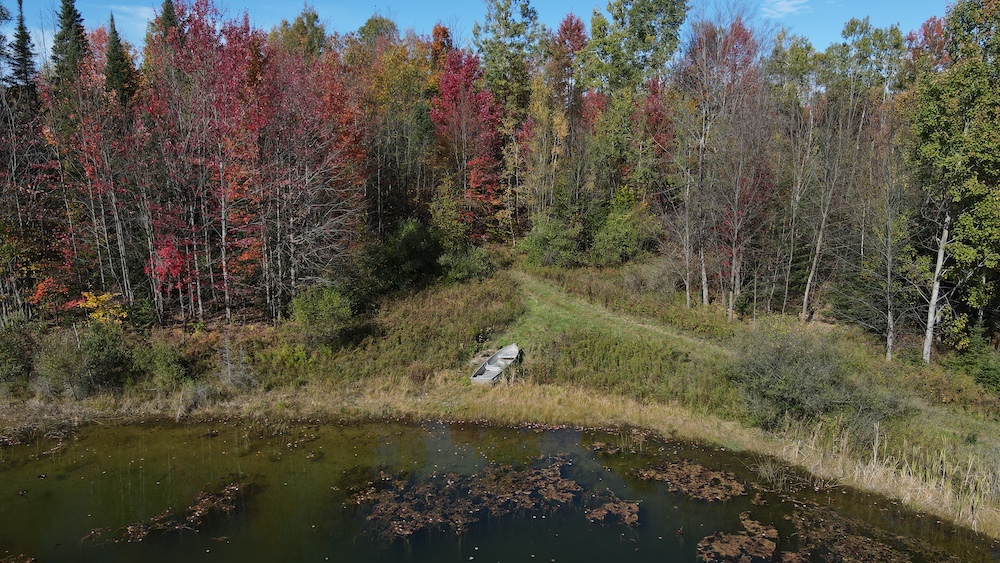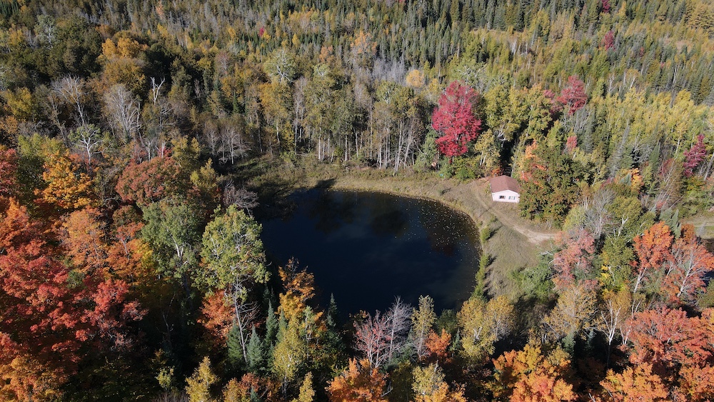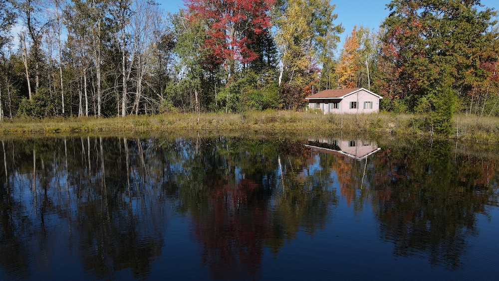 Beside the pond, a cozy cabin offers the perfect retreat, whether you’re spending a weekend outdoors or simply soaking in the natural beauty of the land.