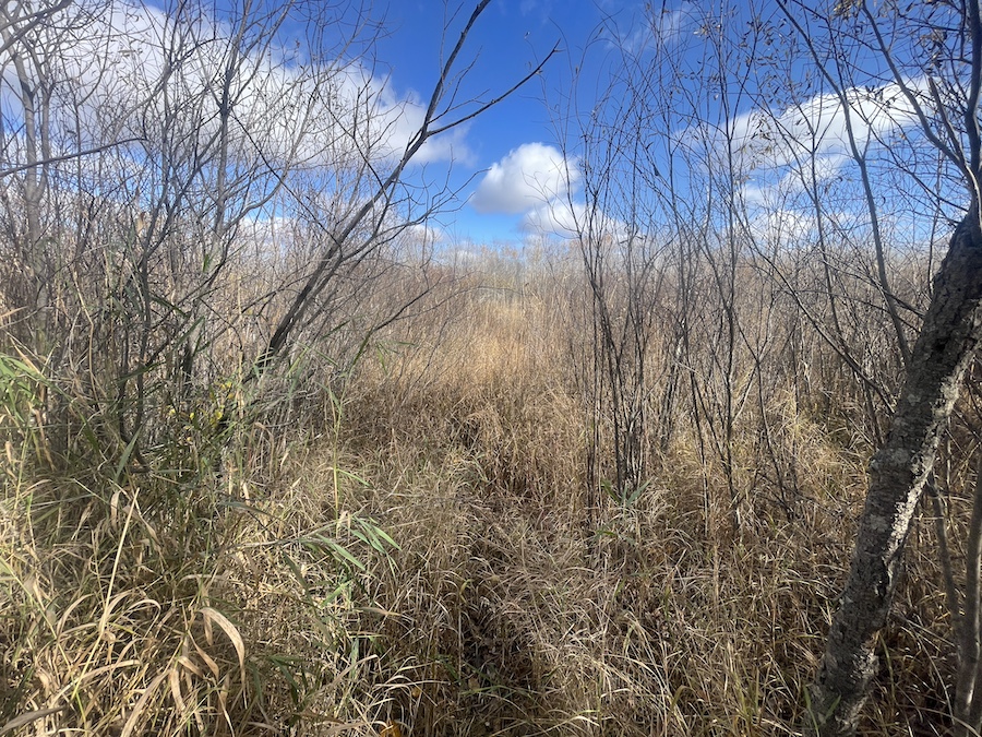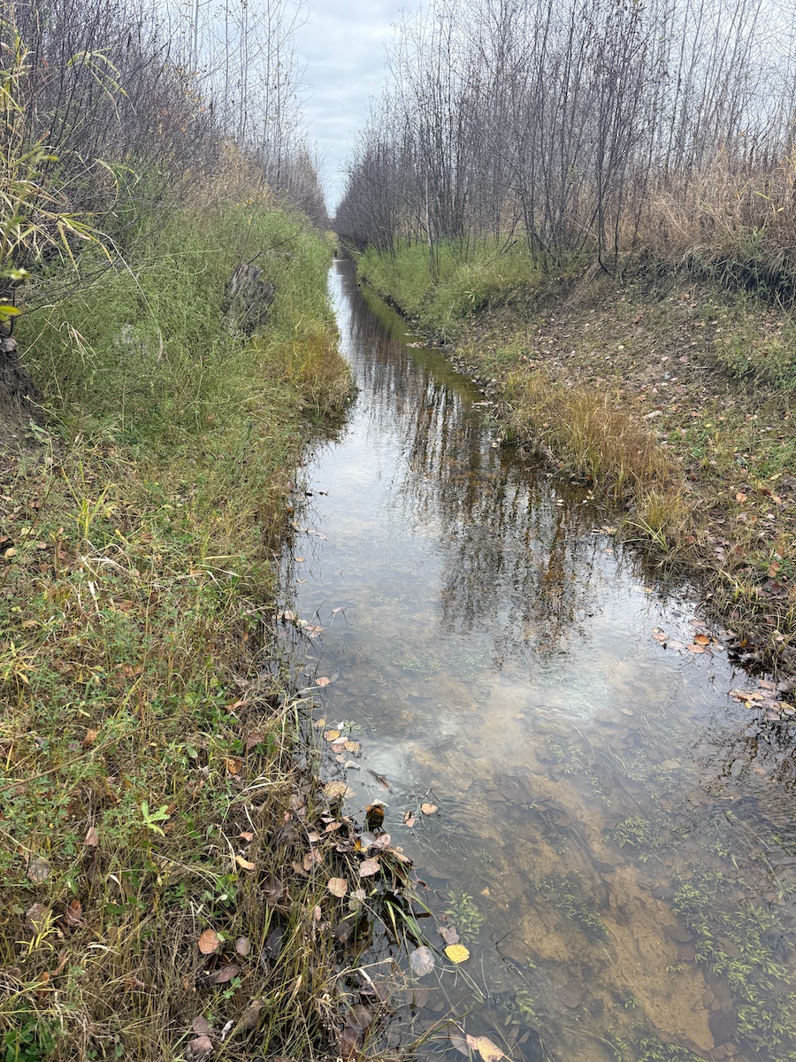 In the southwest corner, a small opening marks the site where an old cabin once stood. This location offers a level area suitable for parking a camper, setting up a fish house during the off-season, or planning a future build site. A drainage ditch along the southern boundary provides a consistent water source for wildlife and contributes to the overall habitat quality.