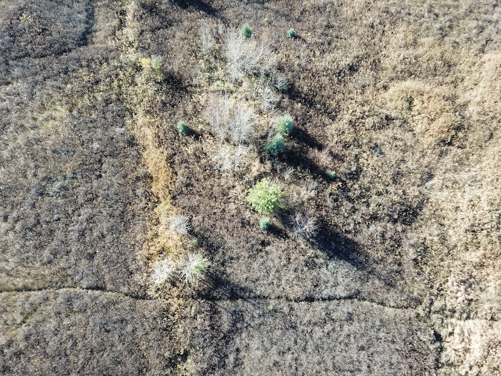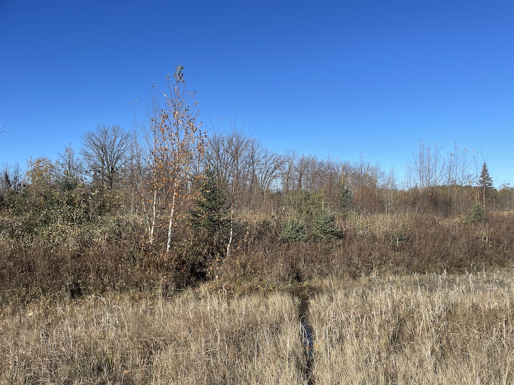 The property is bordered by heavier timber on both its east and west sides, forming natural travel corridors for whitetails and other wildlife. Several visible deer trails cross the property, and the combination of cover and open areas supports bedding and feeding activity. The site’s drainage ditch runs through the property, supplying a reliable water source year-round for wildlife and livestock.