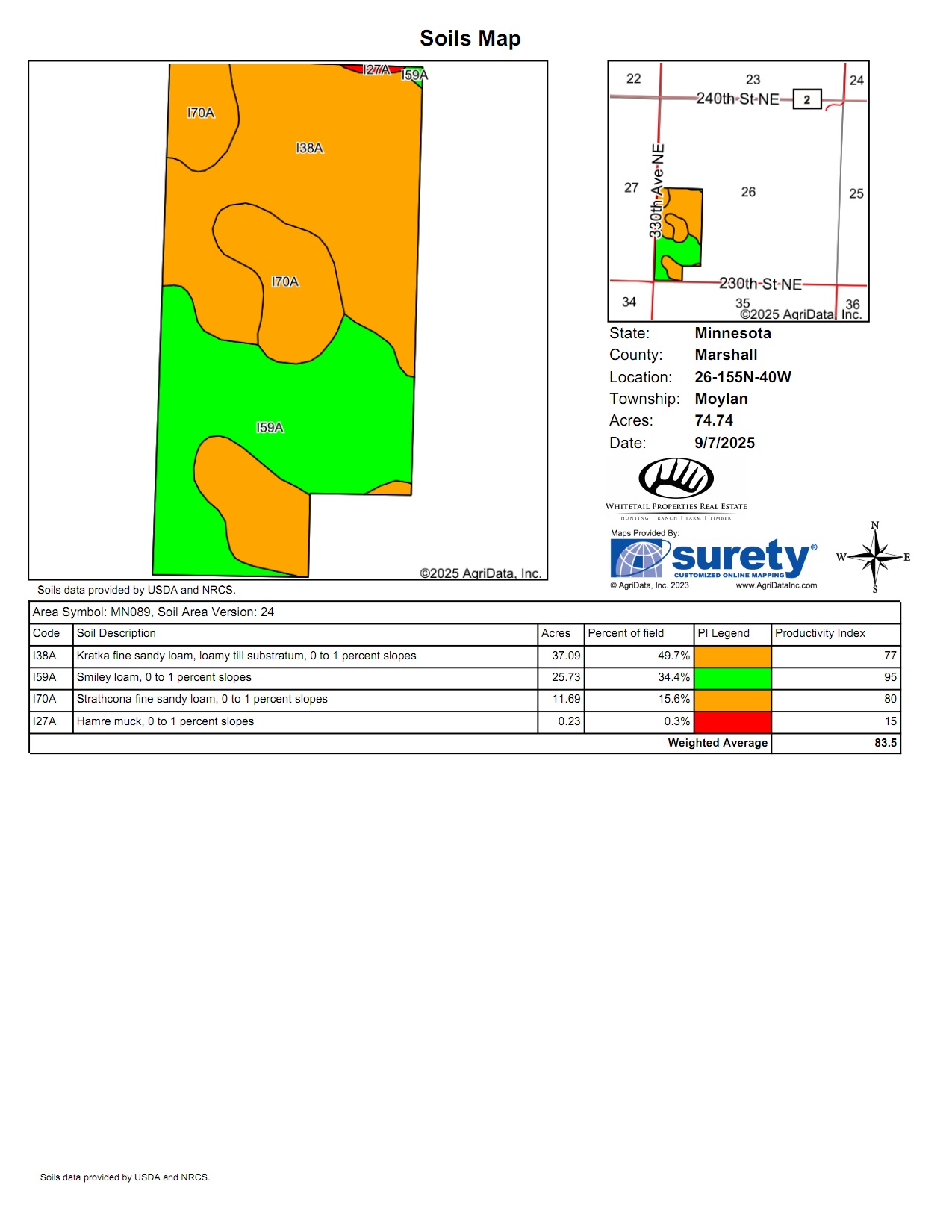 Located in Section 26 of Moylan Township, Marshall County, MN, this +/-74.8-acre property offers a mix of highly productive farmland and recreational features. With easy access from well-maintained county roads, this tract provides agricultural utility and long-term land value. The property includes 63.2 FSA-certified tillable acres, boasting a strong Crop Productivity Index (CPI) of 83.49. The primary soil types are Kratka, Smiley, and Strathcona sandy loams, all known for supporting consistent yields of small grains and row crops.