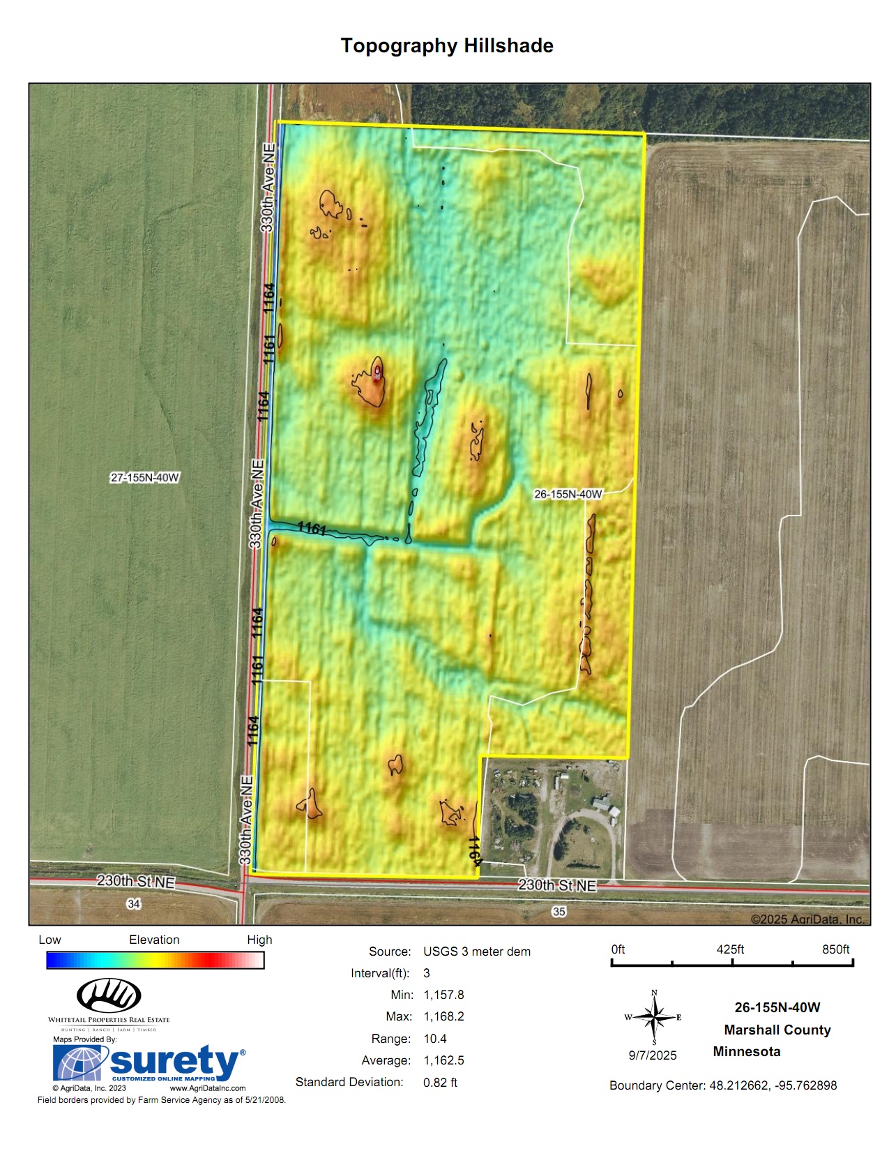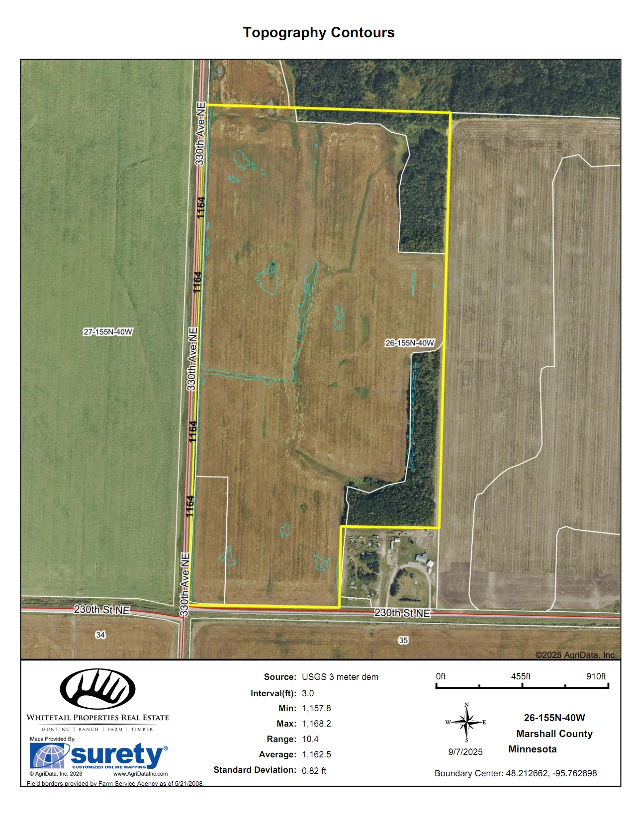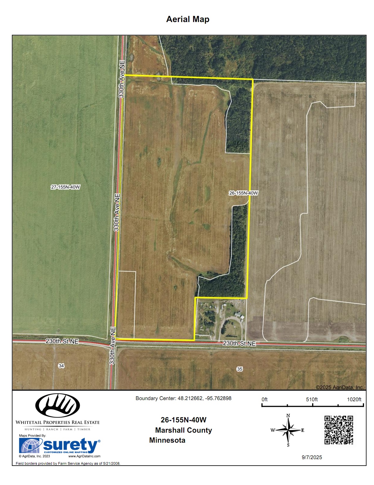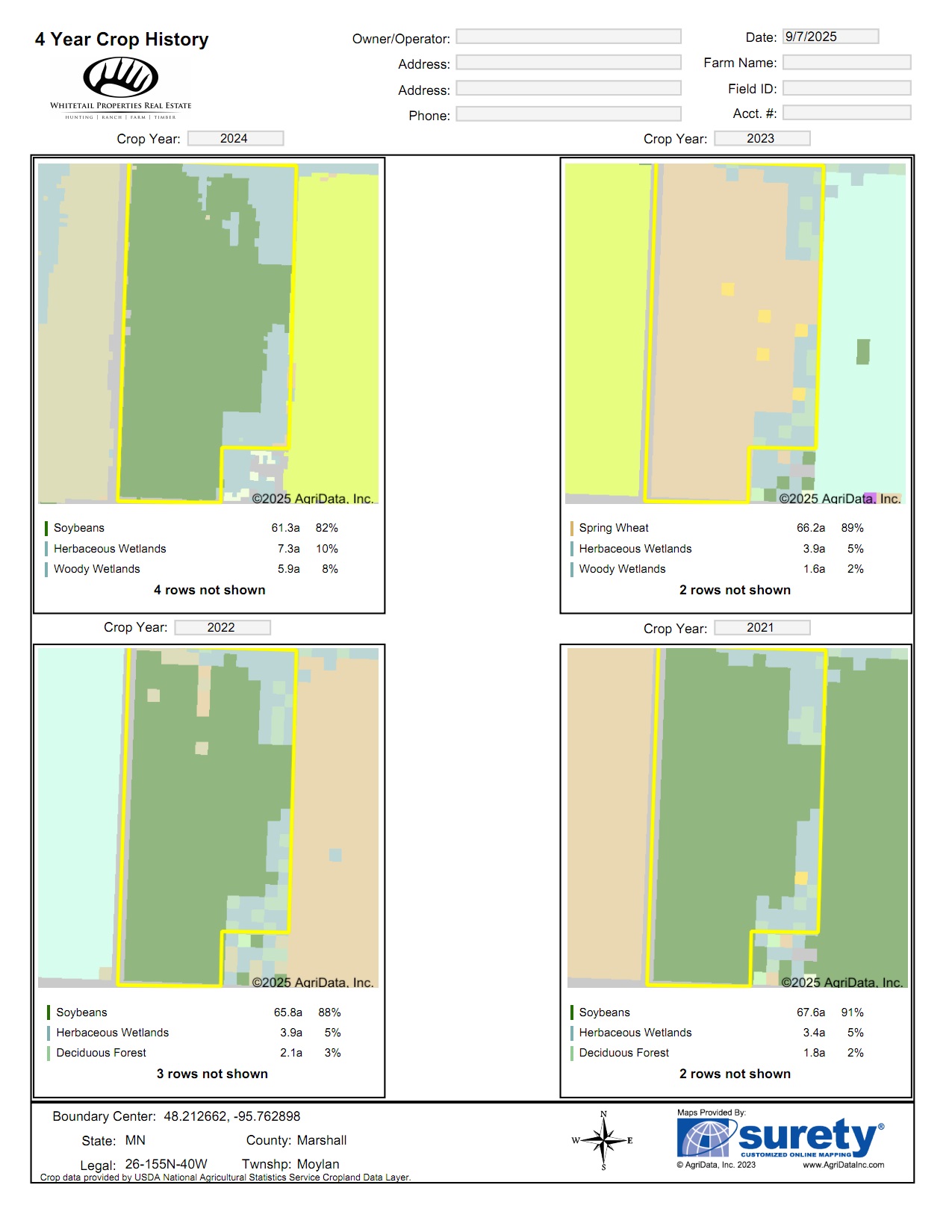 Interior and perimeter ditching have been established across the property, supporting effective drainage and contributing to the parcel’s production history. The current crop of oats is planted for the 2025 season, and the seller will retain those crops. The land is available for tenancy beginning in 2026, offering future opportunities for landowners or operators seeking expansion.
