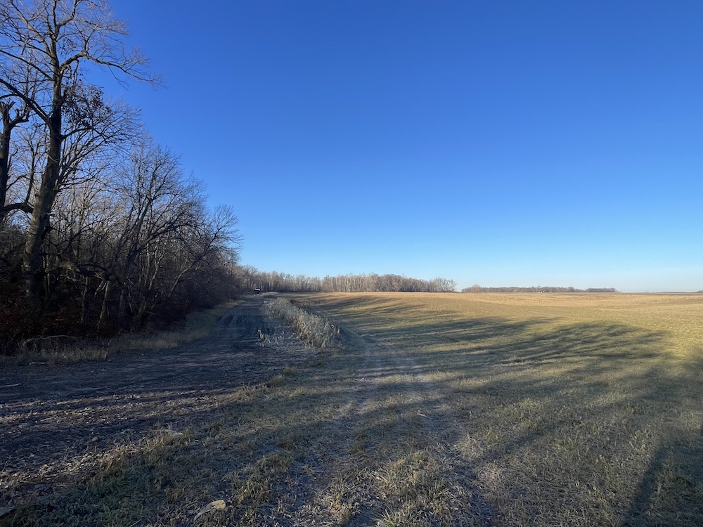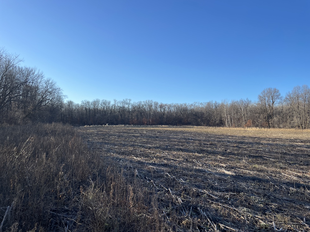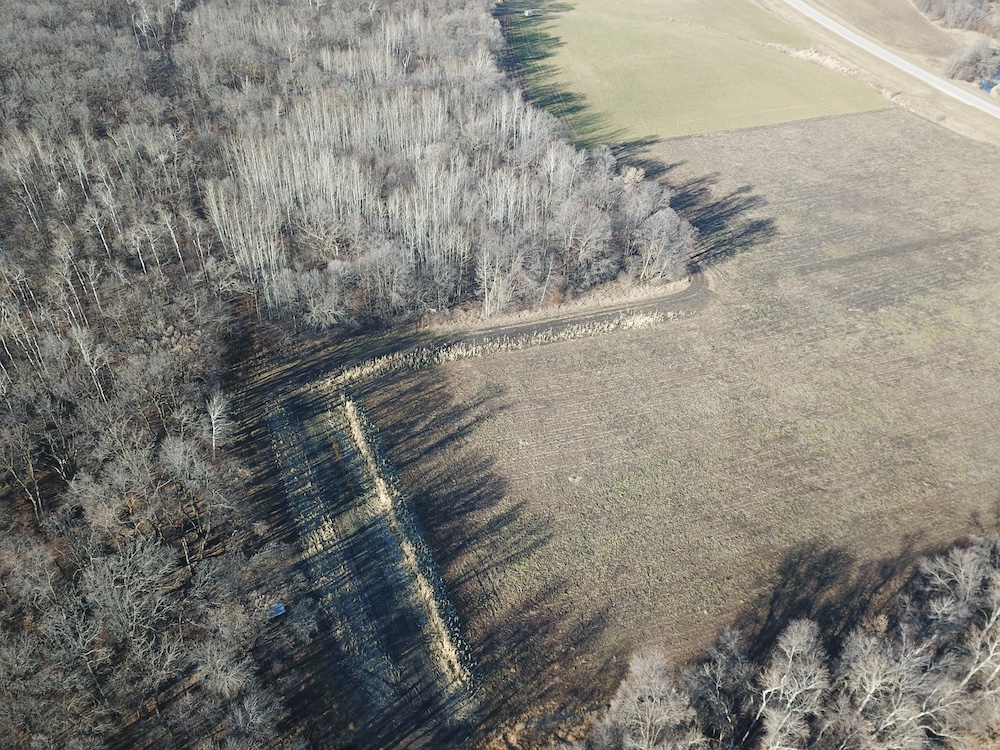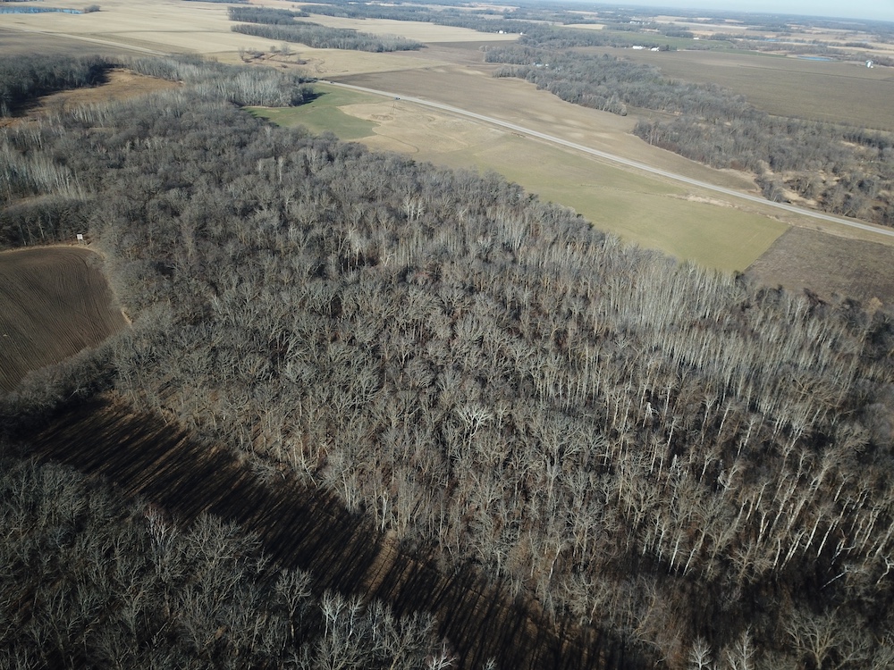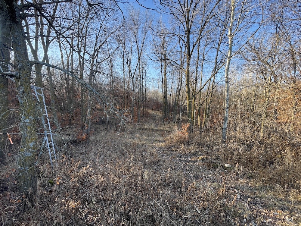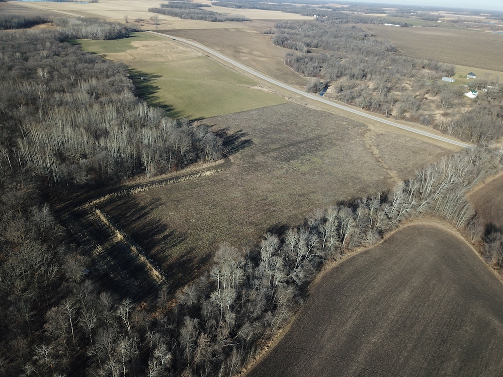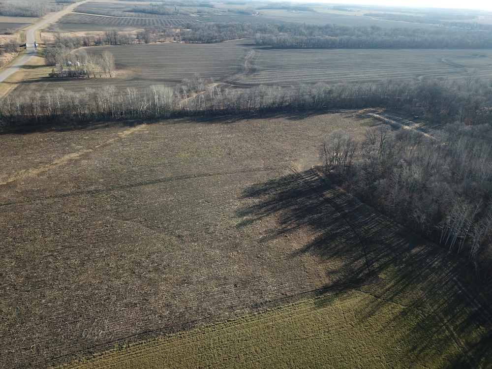 Behind the tillable acres, the landscape transitions to rolling high ground with mature oaks, maple, and aspen timber. This area covers approximately eighteen acres and includes established trails and identified food plot locations. The timbered section has a history of supporting varied wildlife activity, including deer, turkey, grouse, and occasional black bear. While proven stand locations are noted, no stands are included in the sale. The surrounding landscape adds to the property’s diversity, with a large block of timber to the south, agricultural fields to the east, and river bottom habitat located across the road to the north.