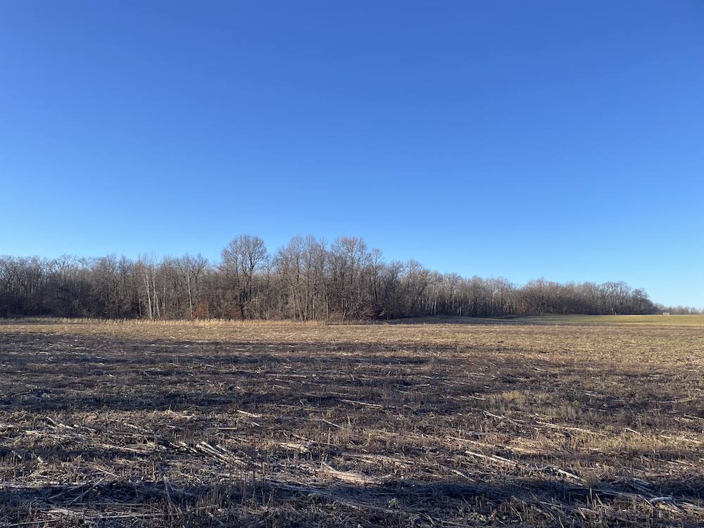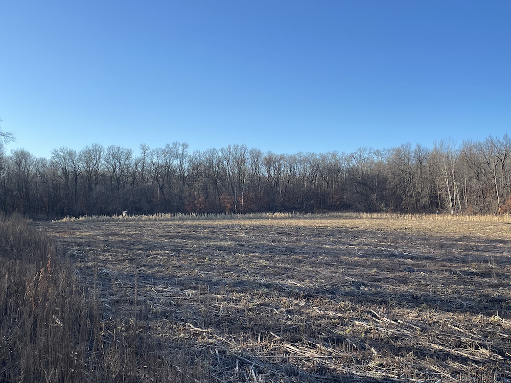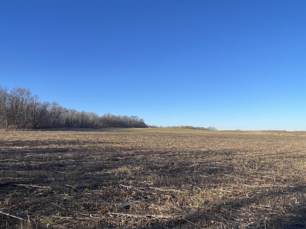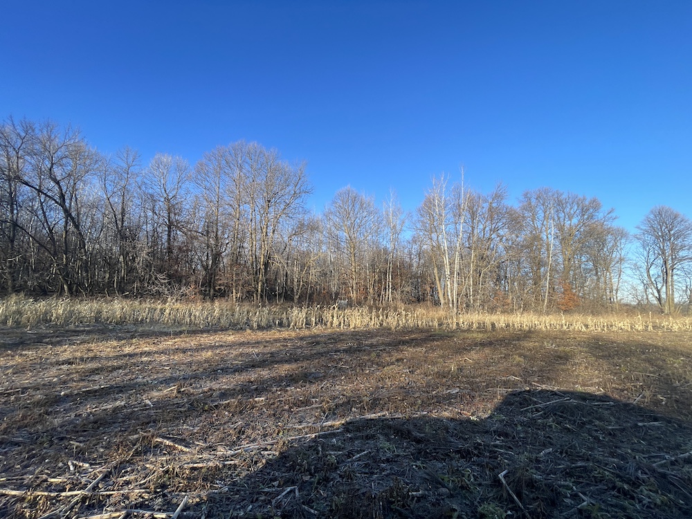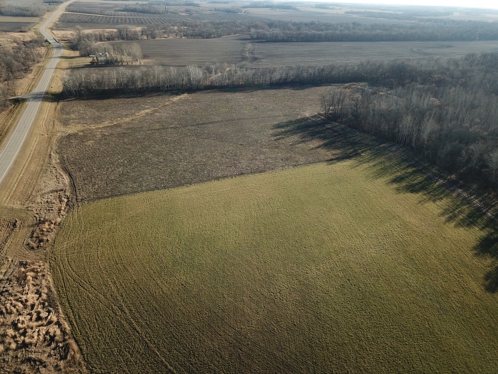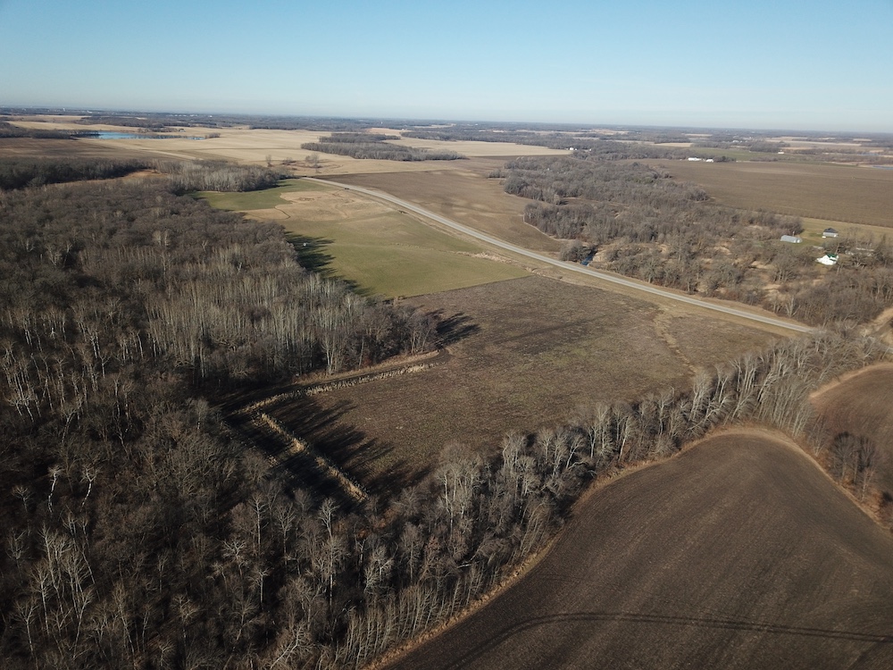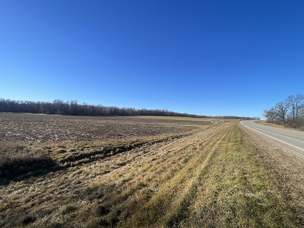Behind the tillable acres, the landscape transitions to rolling high ground with mature oaks, maple, and aspen timber. This area covers approximately eighteen acres and includes established trails and identified food plot locations. The timbered section has a history of supporting varied wildlife activity, including deer, turkey, grouse, and occasional black bear. While proven stand locations are noted, no stands are included in the sale. The surrounding landscape adds to the property’s diversity, with a large block of timber to the south, agricultural fields to the east, and river bottom habitat located across the road to the north.