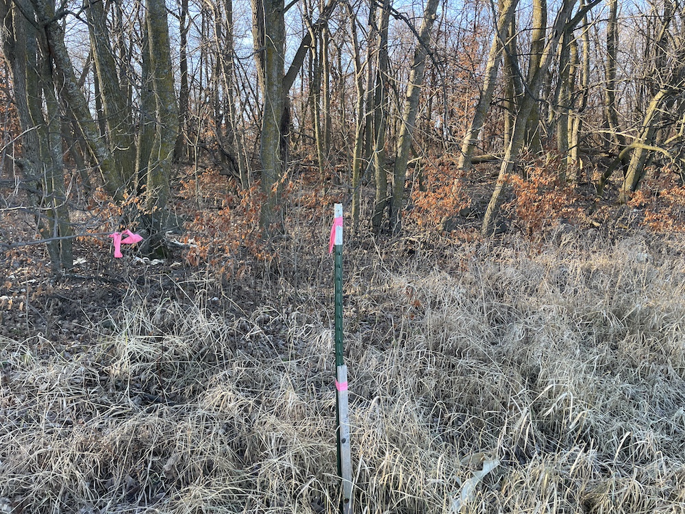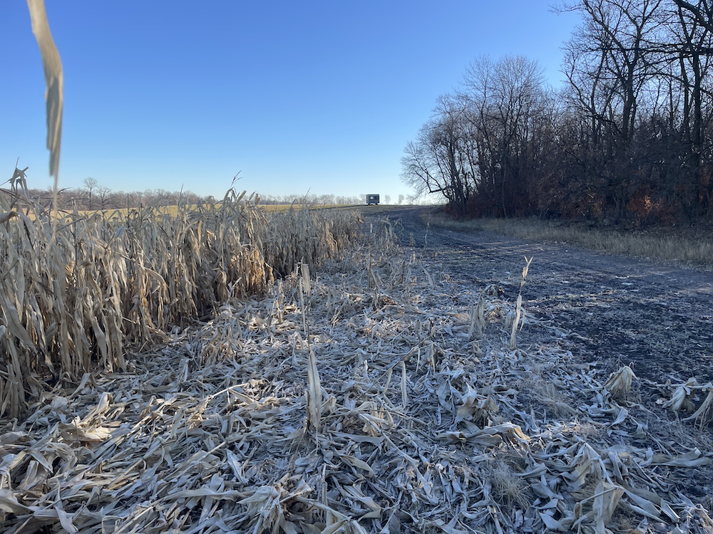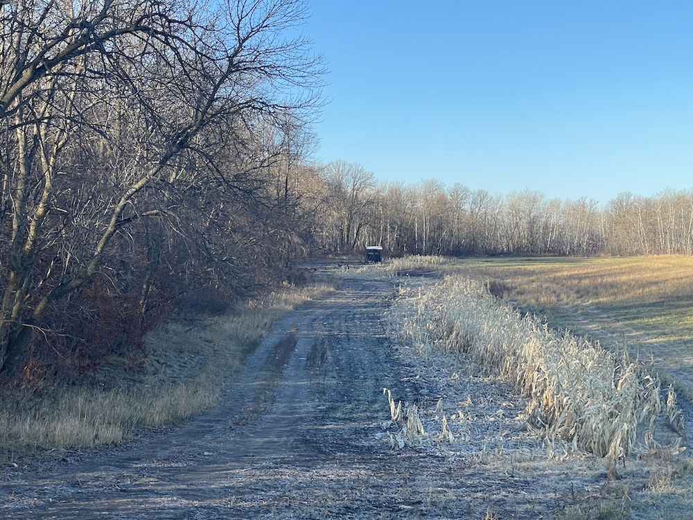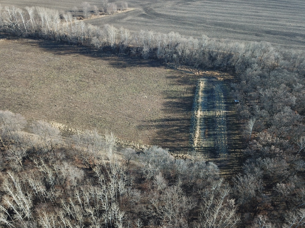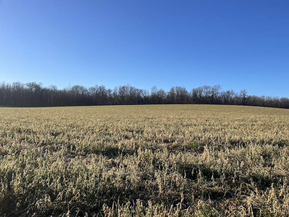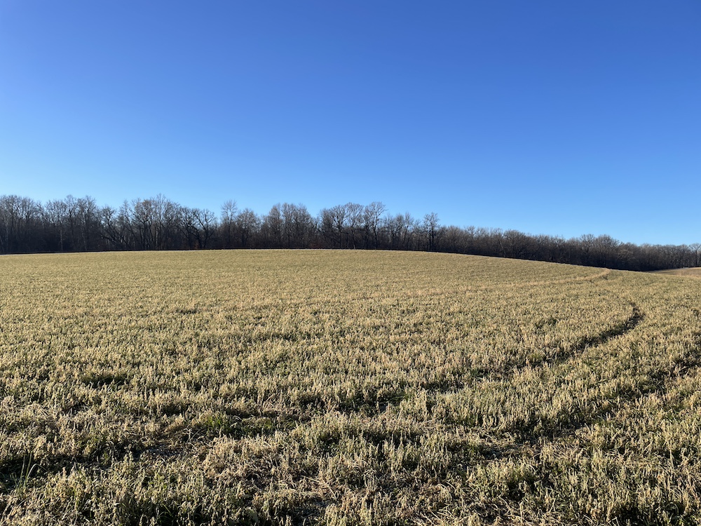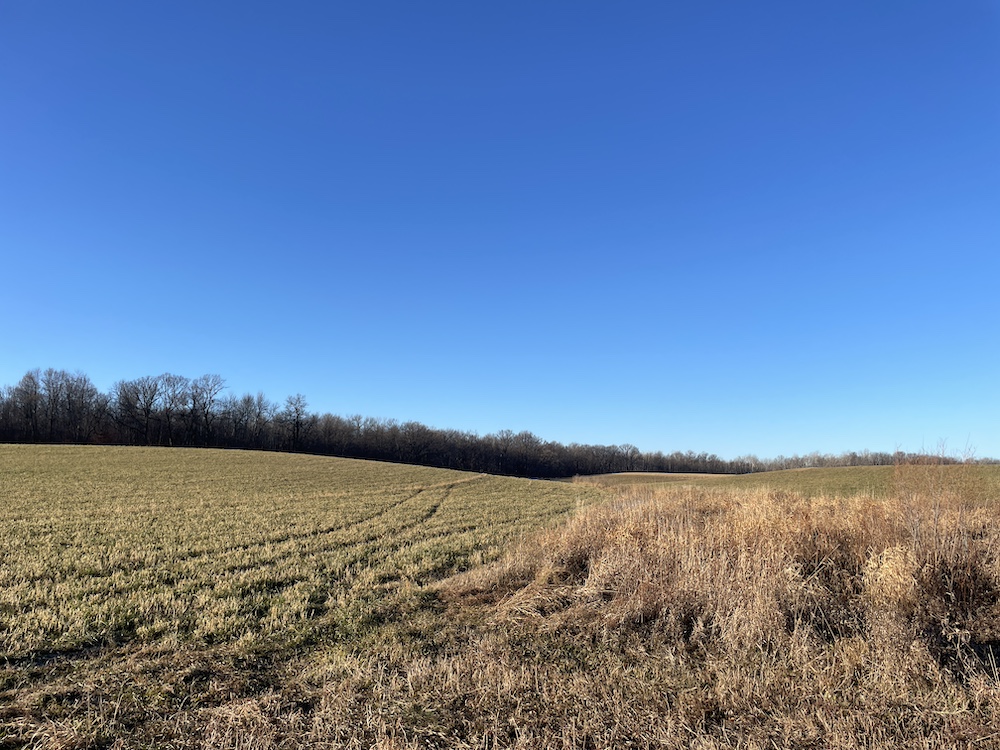 Behind the tillable acres, the landscape transitions to rolling high ground with mature oaks, maple, and aspen timber. This area covers approximately eighteen acres and includes established trails and identified food plot locations. The timbered section has a history of supporting varied wildlife activity, including deer, turkey, grouse, and occasional black bear. While proven stand locations are noted, no stands are included in the sale. The surrounding landscape adds to the property’s diversity, with a large block of timber to the south, agricultural fields to the east, and river bottom habitat located across the road to the north.