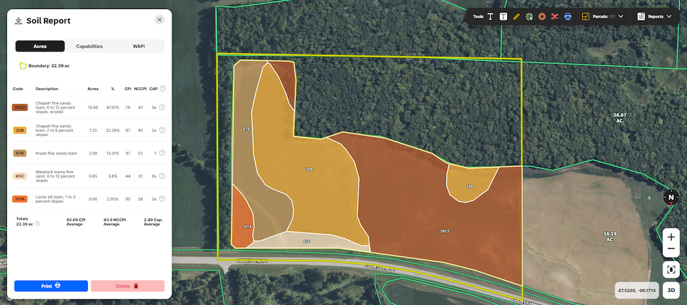 The front portion of the property along County Highway 1 contains productive farmland consisting of 22.40 FSA tillable acres with an average CPI of 83. The soils consist primarily of Knute and Chapett fine sandy loam, which are commonly used in this region for row crops and forage production. The current owner is planting alfalfa and some row crop acreage on the land. Open tenancy begins in 2026, providing flexibility for future management decisions such as continued crop production, lease income, or conversion to other approved agricultural uses.