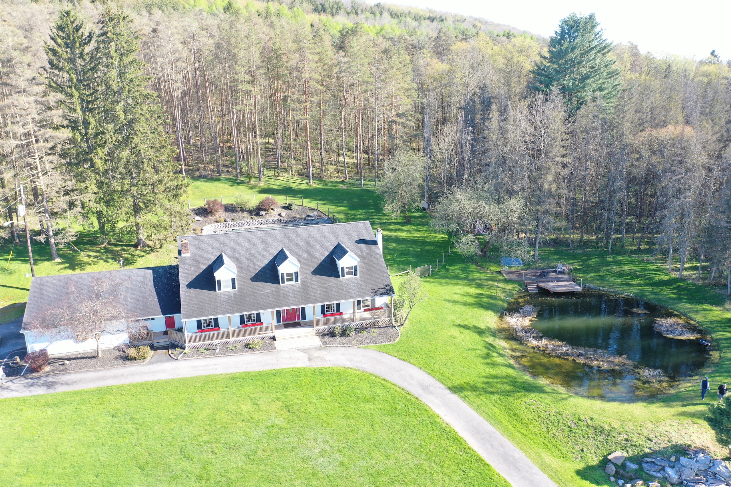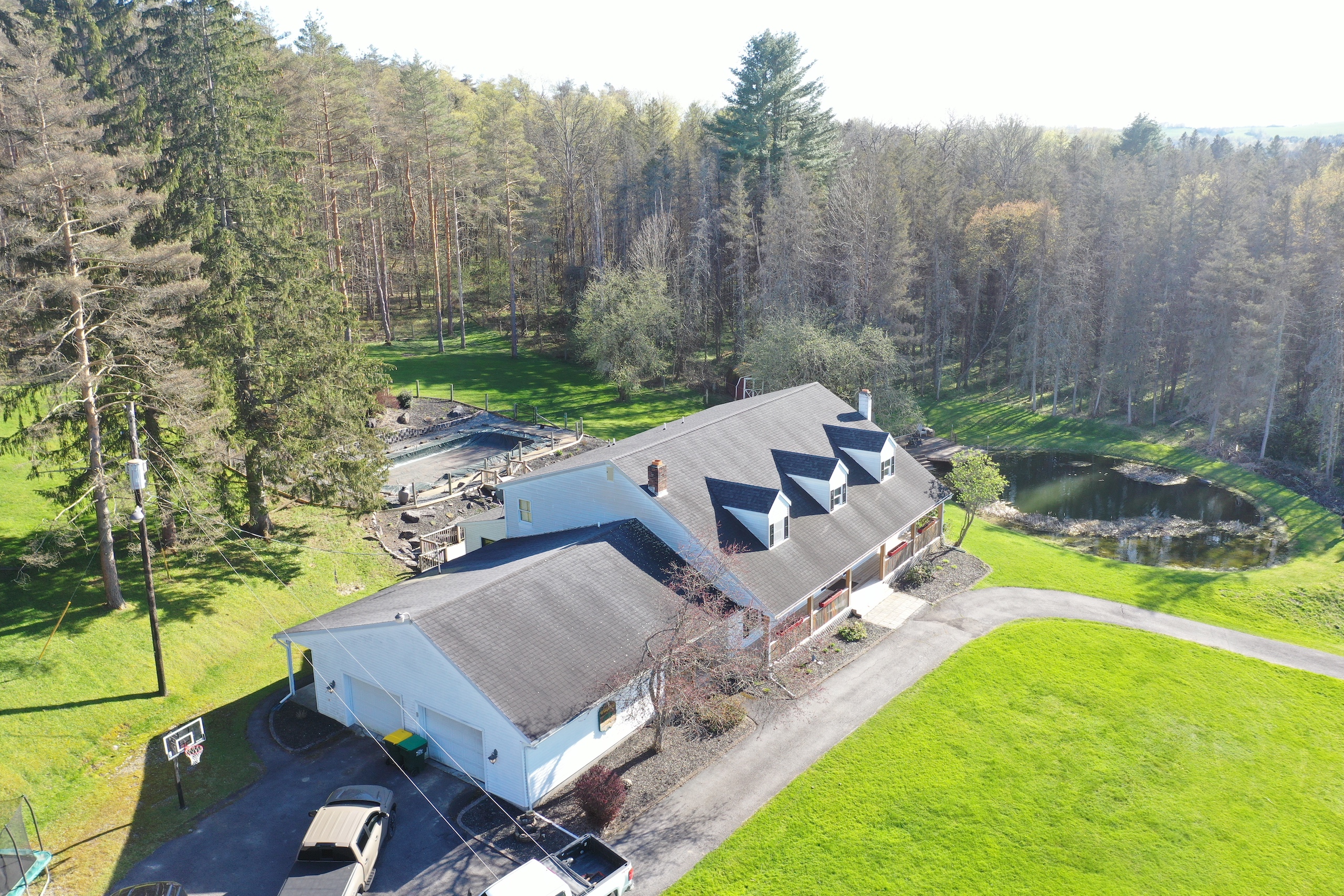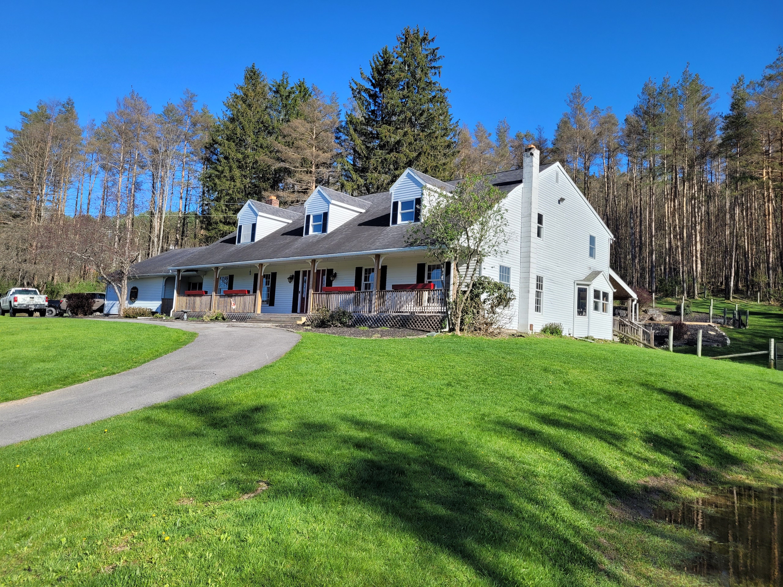 Enjoy the country life in style! This stunning property features a 4 bedroom, 4.5 bathroom Cape Cod with over 4900 square feet of beautiful living space, and plenty of room for your family and friends. Originally built in 1978, this lovely home has been recently updated in 2021 and features quality craftsmanship throughout with custom cherry cabinets and gorgeous paneled woodwork, wainscotting, and coffered ceilings. A grand entrance greets you as you enter the large 2-story foyer with an elegant staircase and wrap-around balcony. The large kitchen features custom cherry cabinetry, expansive granite countertops, stainless appliances as well as a workstation, and a sunny breakfast nook with lots of windows that overlook the pond on the side of the property. There is a large family/media room with a huge wood fireplace, wood storage nook, and two, back-lit built-in bookcases on both sides. Plenty of room for a full-sized pool table in the adjoining rec room, while there is a 4 season enclosed porch that runs nearly the length of the house and has supplemental heat to keep it comfortable during cold weather. The house also features a formal dining room that can accommodate large dinner parties. Upstairs is the Master bedroom suite with its own bathroom with both a jacuzzi tub and separate shower and a large walk-in closet. Three other spacious bedrooms complete the second floor with additional bathrooms for each of them. There is a 25’x35’ attached oversized, two-car garage with a workshop and ample storage cabinets. The house is surrounded by multi-level decks on three sides, providing extensive outdoor space for entertaining, leading either up to the 32’x16’ in-ground pool or down to another deck overlooking the spring-fed pond. Enjoy fishing for trout in the stocked pond off the deck or from the comfort of your rowboat. The grounds are well maintained and are beautifully landscaped. This lovely home is located only 4 miles from Sherburne and is in the Sherburne Earlville School District. Heating in the house is electric and provided through the Sherburne Electric Cooperative at cost savings over other energy sources. Centrally located for our area, the commute from this property is approximately 45 minutes to either Utica or Oneonta, Syracuse in one hour, and Binghamton in 75 minutes.