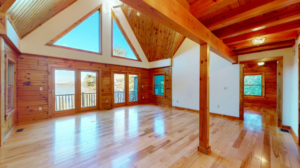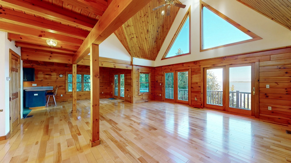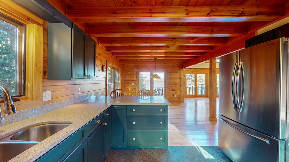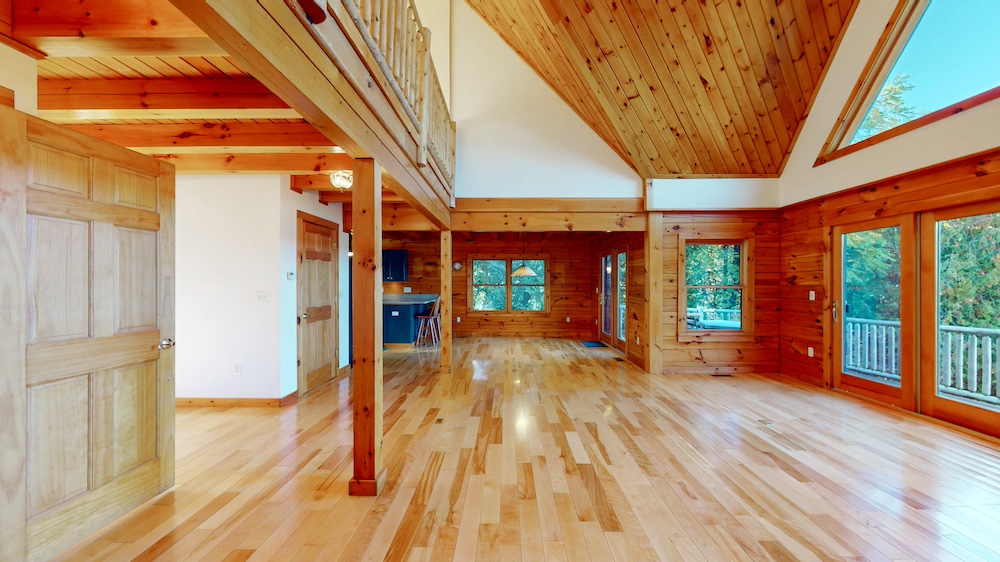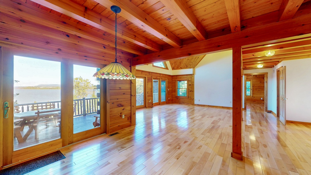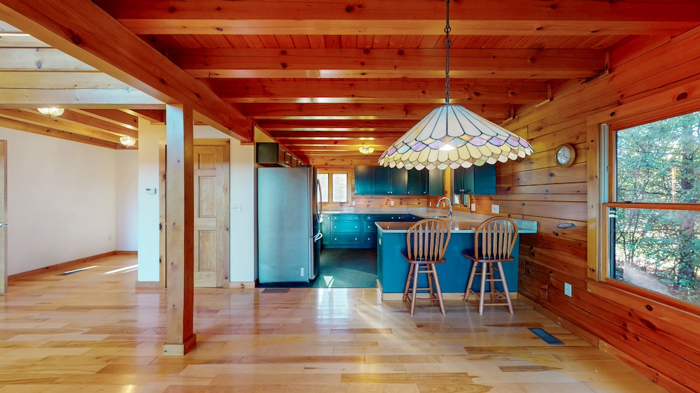 The home welcomes you with warm wood interiors, hardwood floors, and an open-concept layout that captures some lake views. A soaring great room with vaulted ceilings and natural wood beams creates a true Adirondack atmosphere, while the spacious kitchen and dining area flow seamlessly for entertaining or family gatherings.