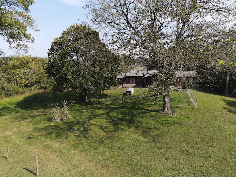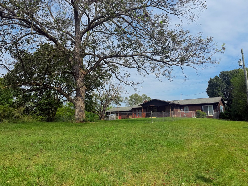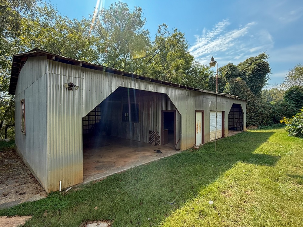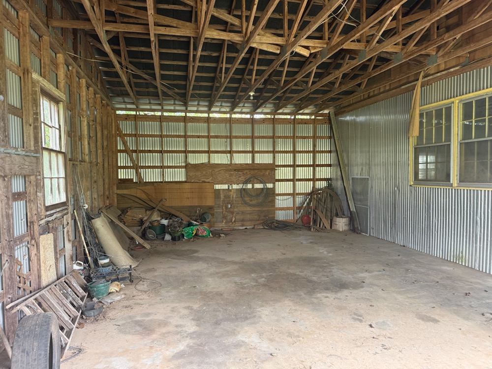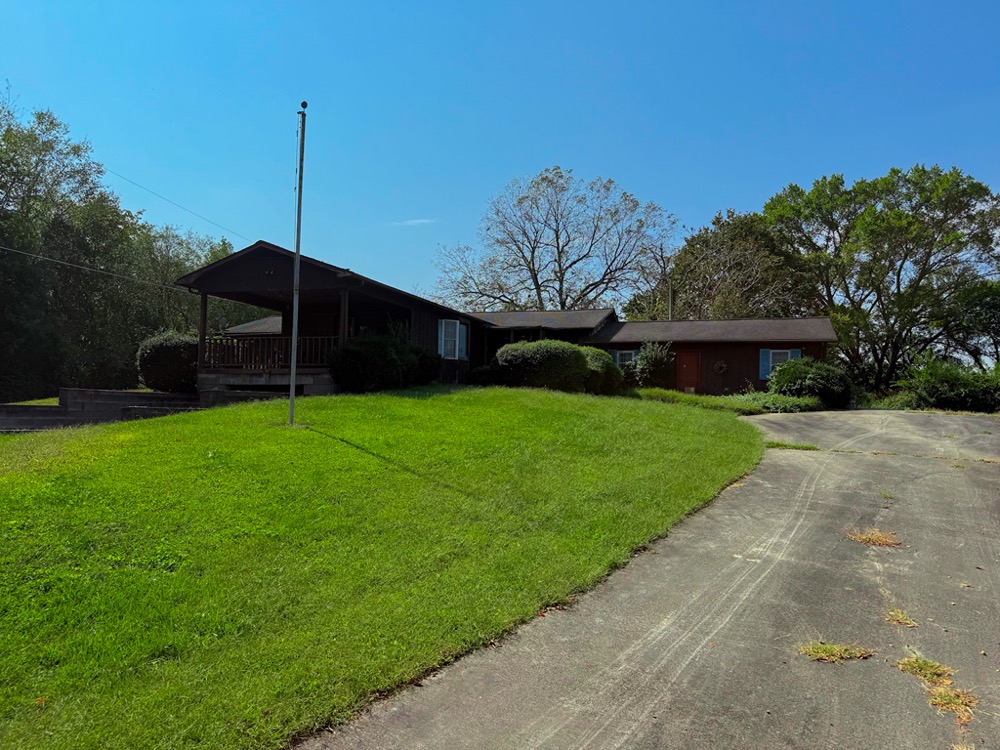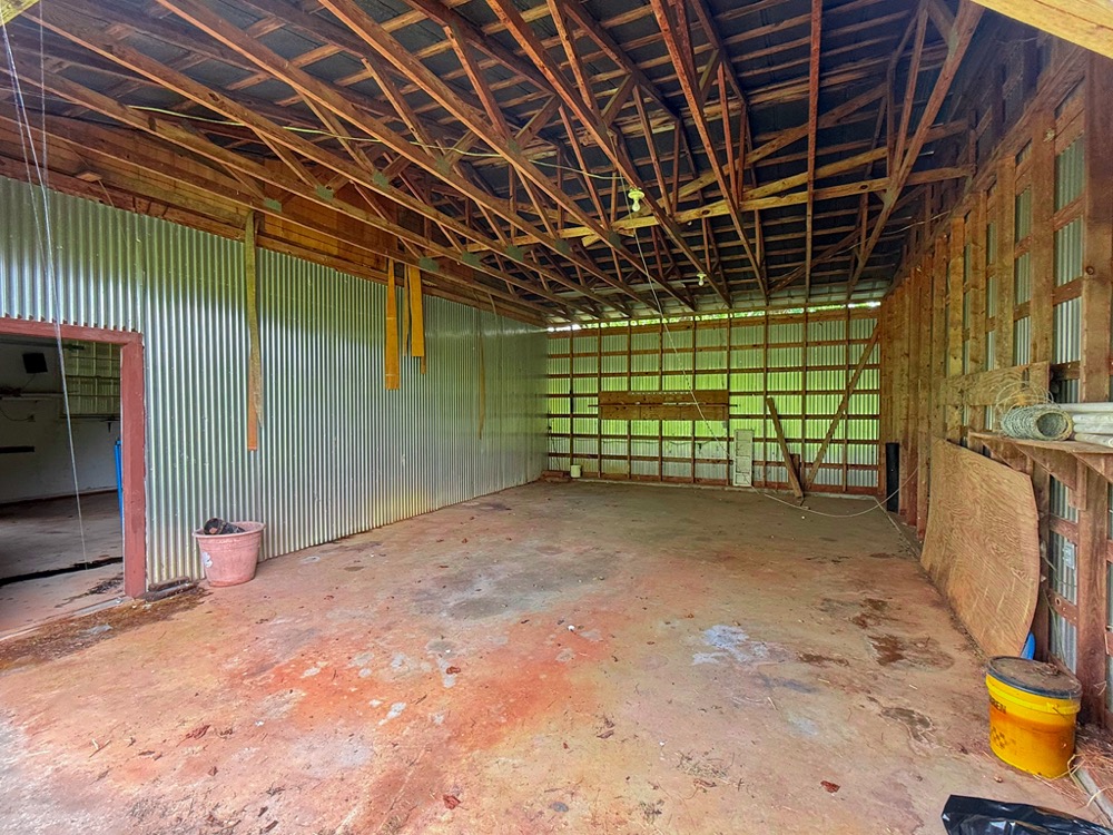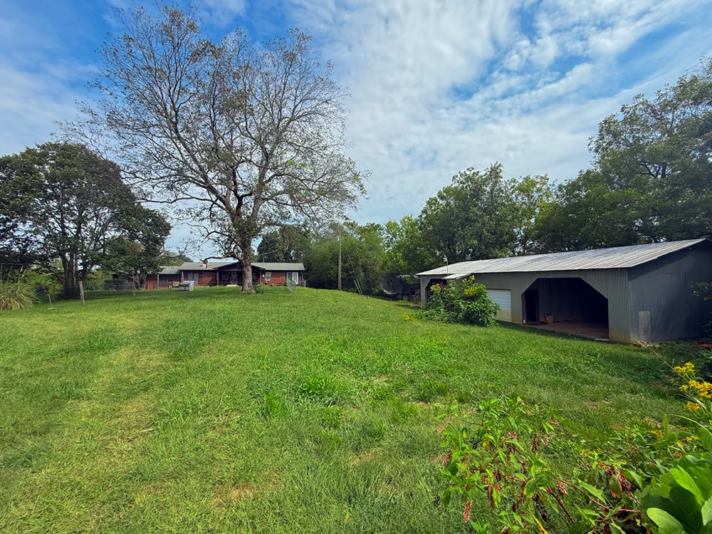 A 3-bedroom, 2-bathroom brick ranch-style home, originally built in 1974, is located on the property. The home features an attached two-car garage, a primary suite with direct access to a back porch, fireplaces in both the kitchen and living room and an unfinished basement. The structure will require updates but offers solid potential for renovation. A fenced-in backyard surrounds the home, and a large barn provides storage for equipment or other needs.
