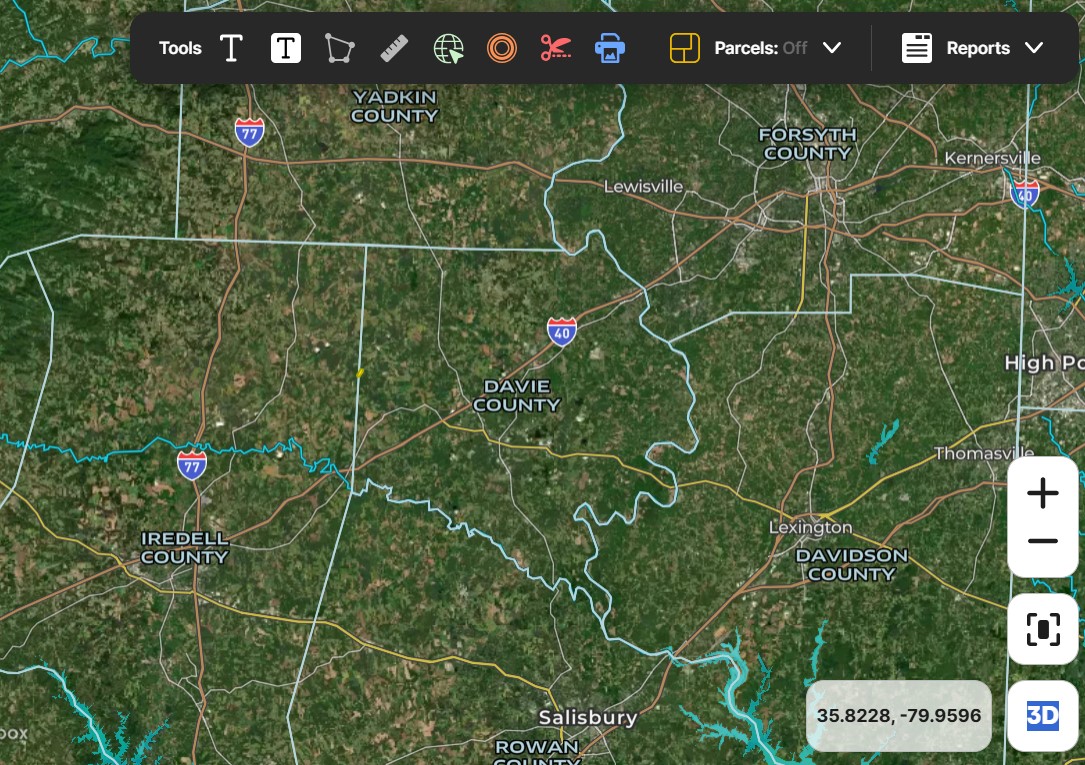 There is no recent survey for the property. Multiple parcels are included in this sale. The main parcel roughly 37.42+/- acres is in Davie. The smaller parcel, roughly 2.58 Acres is in Iredell County.