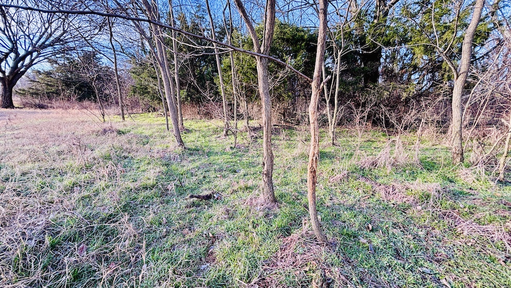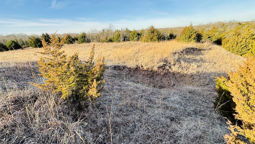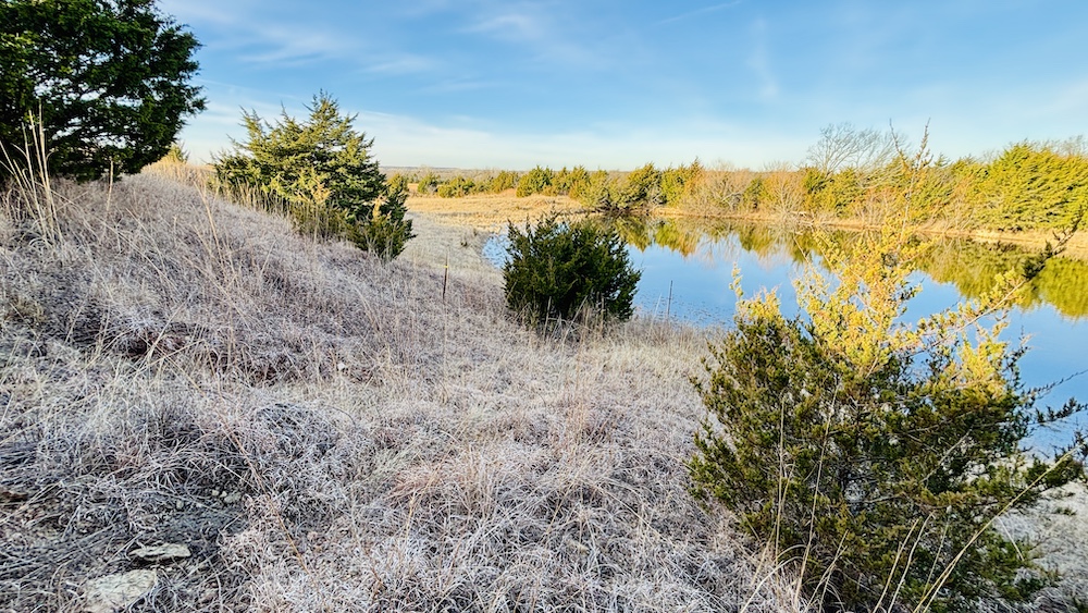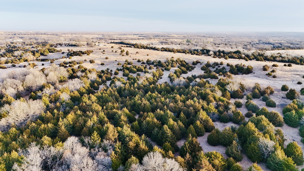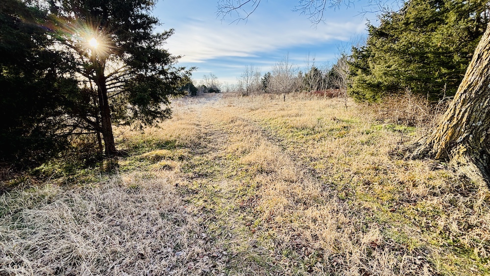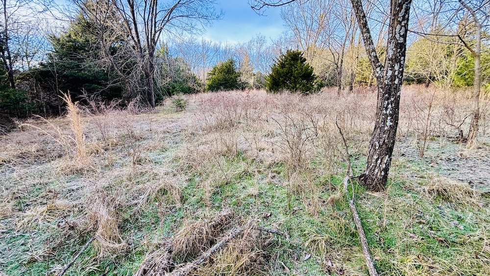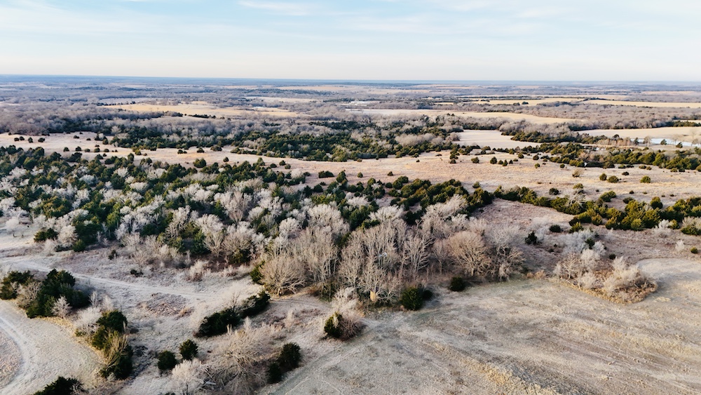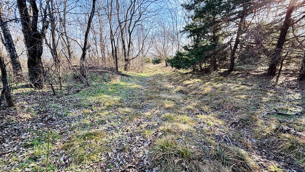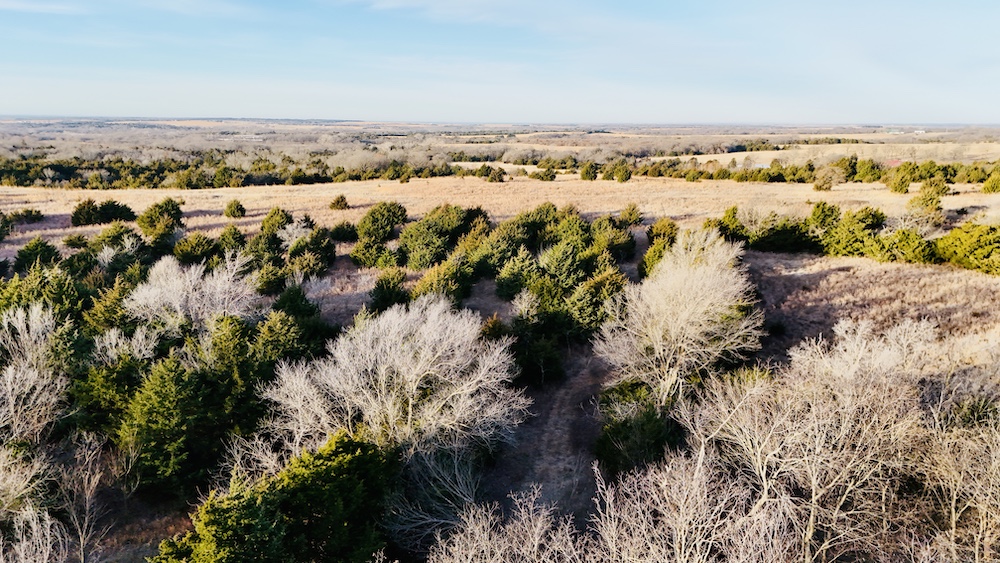 The land features varied terrain with noticeable elevation changes, including open ground, hardwood and cedar draws, and a ridgeline with views of the surrounding countryside. Established deer trails run through the draws and along natural travel corridors. The manageable acreage supports recreational or hunting use, with the ridgeline and open areas providing space for food plots, feeders, or elevated blinds. A mix of wooded cover and open pasture contributes to both wildlife habitat and general outdoor use.