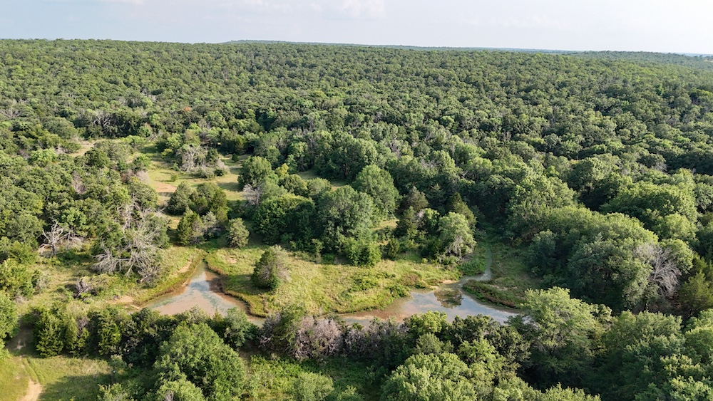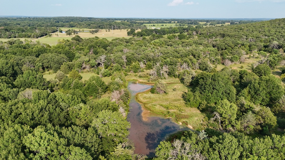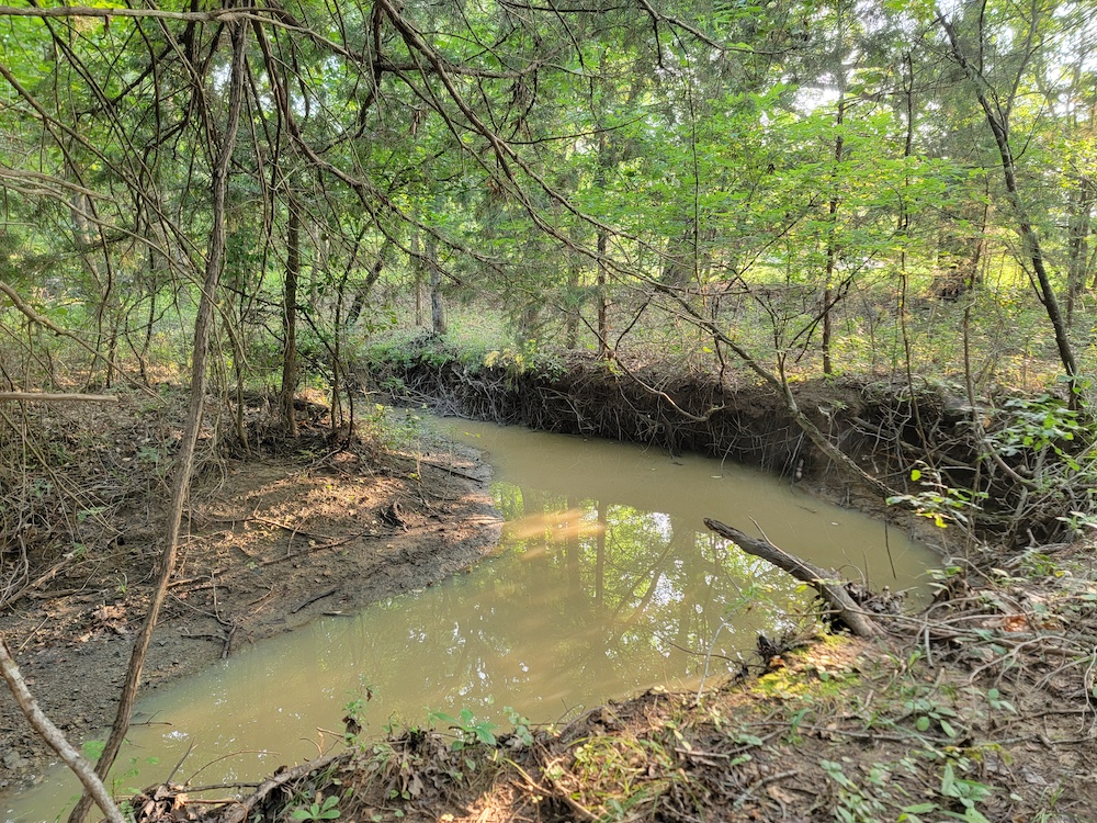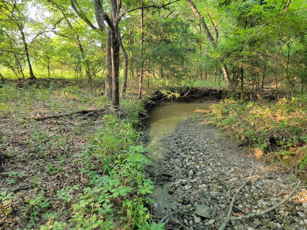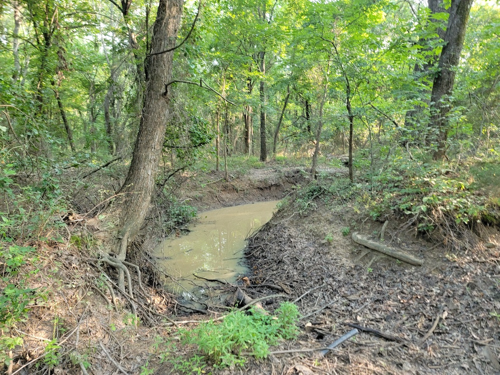 Just below one of the hills lies a spacious open field, making it an ideal location for a food plot and a strategic destination feeding area. One creek runs through the property, holding water even during the summer months, and several ponds add to the diversity of water sources.