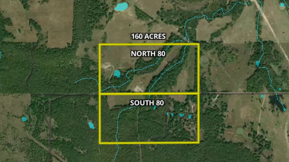 Access is via a county road that is not regularly maintained, keeping the property rugged and secluded—perfect for serious hunters who value privacy. This tract is being offered individually or as part of the full 160-acre property, providing flexibility for buyers.