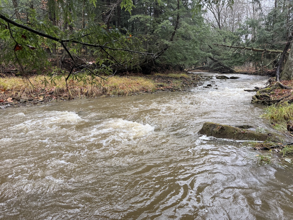 For the outdoor enthusiast, the property also shows strong hunting potential, with abundant deer and turkey sign throughout the woods. While the stream runs along the road frontage, the layout suggests the possibility of building a small cabin or home with some thoughtful planning to cross the stream.