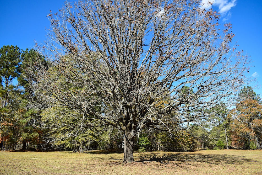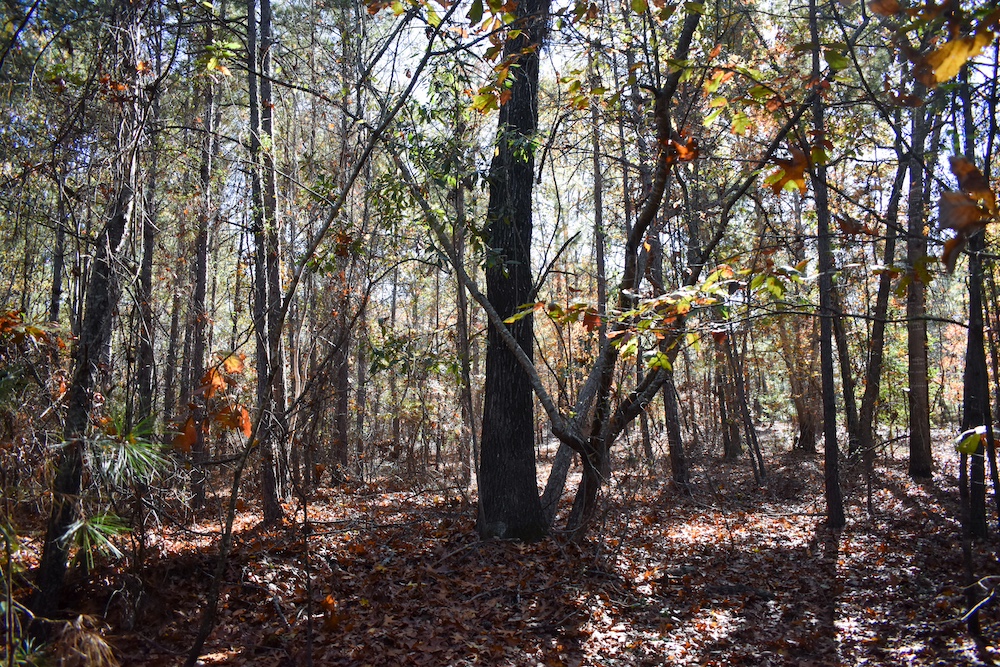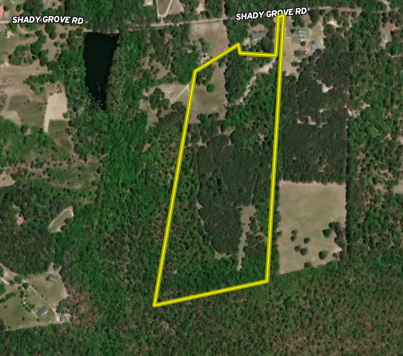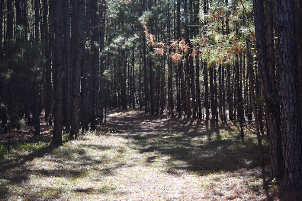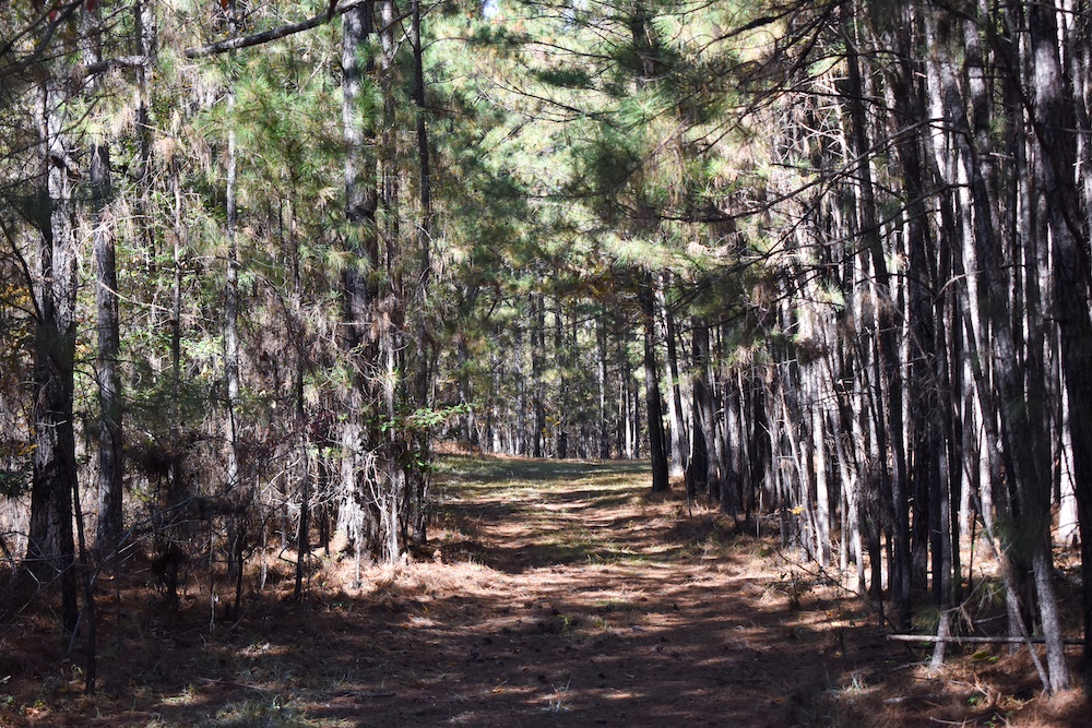A 2-acre pasture sits at the front of the property, leading to approximately 7.5 acres of planted pine about 20–25 years old, surrounded by mixed hardwoods. The pines could be managed for future timber harvest or pinestraw income. The tract is entirely upland, with no mapped wetlands or swamp areas.