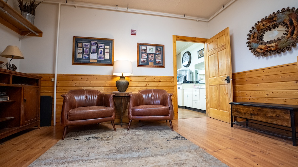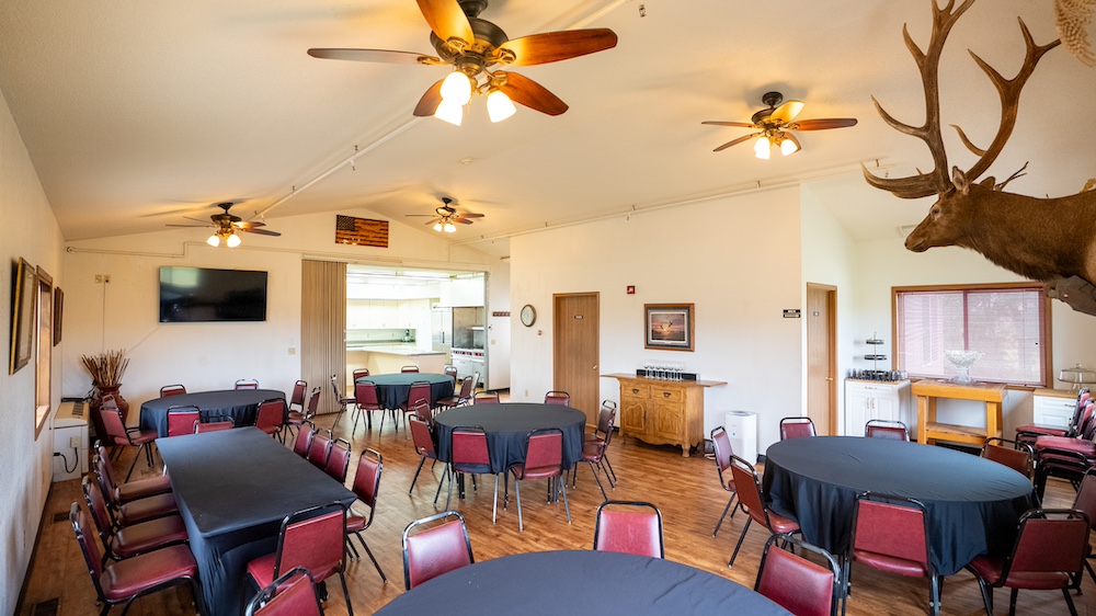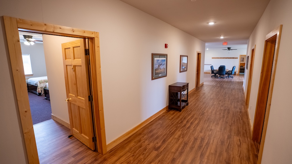 The main lodge is thoughtfully designed to host large groups while maintaining an inviting, lodge-style atmosphere. It features 29 bedrooms, multiple laundry facilities, an office, and designated gun cleaning rooms. The spacious commercial kitchen is equipped to handle full meal service, including a large walk-in pantry, industrial-grade appliances, and ample prep space. Adjoining the kitchen, the dining room seats up to 60 guests comfortably, creating a natural gathering area after hunts or events.